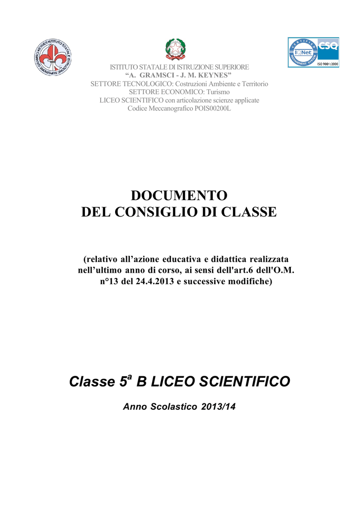 DOCUMENTO DEL CONSIGLIO DI CLASSE Classe 5 B LICEO