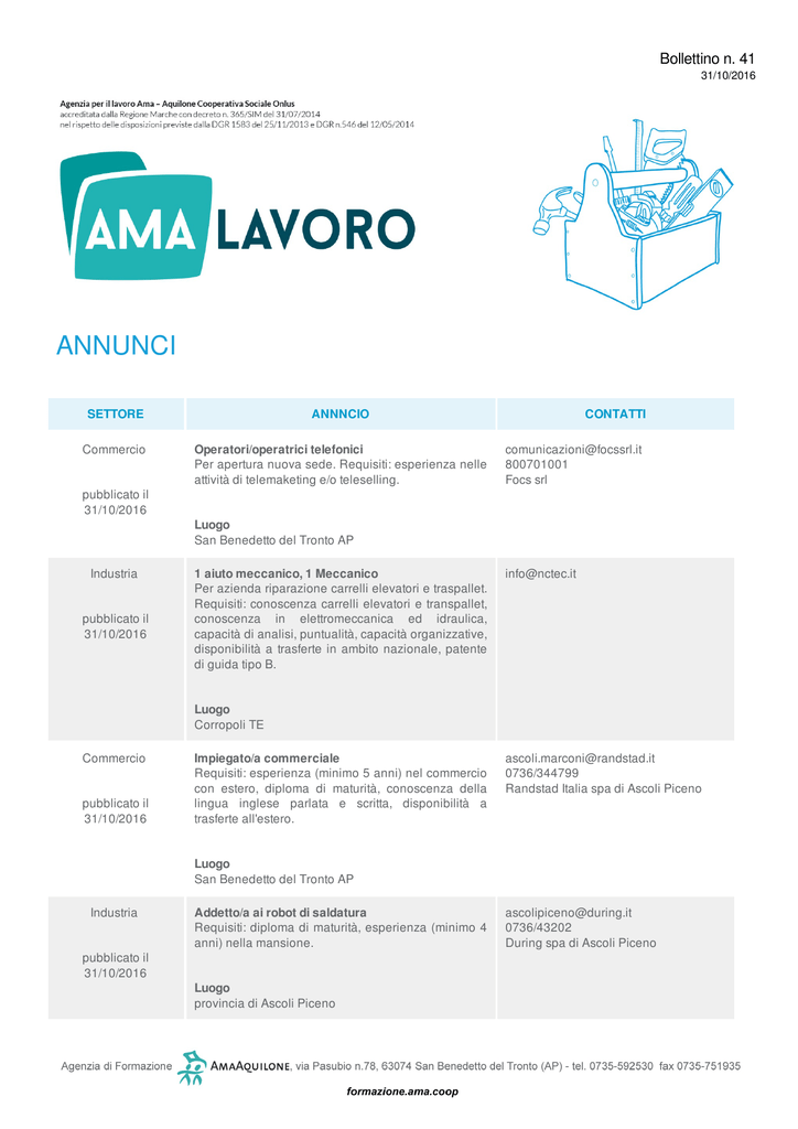 Bollettino n. 41 31/10/2016 ANNUNCI SETTORE ANNNCIO Commercio Operatori/operatrici telefonici Per apertura nuova sede. Requisiti: esperienza nelle attività di telemaketing e/o teleselling. pubblicato il 31/10/2016 Industria pubblicato il 31/10/2016 CONTATTI [email protected] 800701001 Focs srl Luogo San Benedetto del Tronto AP 1 aiuto meccanico, 1 Meccanico Per azienda riparazione carrelli elevatori e traspallet. Requisiti: conoscenza carrelli elevatori e transpallet, conoscenza in elettromeccanica ed idraulica, capacità di analisi, puntualità, capacità organizzative, disponibilità a trasferte in ambito nazionale, patente di guida tipo B. [email protected] Luogo Corropoli TE Commercio pubblicato il 31/10/2016 Impiegato/a commerciale Requisiti: esperienza (minimo 5 anni) nel commercio con estero, diploma di maturità, conoscenza della lingua inglese parlata e scritta, disponibilità a trasferte all'estero. [email protected] 0736/344799 Randstad Italia spa di Ascoli Piceno Luogo San Benedetto del Tronto AP Industria pubblicato il 31/10/2016 Addetto/a ai robot di saldatura Requisiti: diploma di maturità, esperienza (minimo 4 anni) nella mansione. Luogo provincia di Ascoli Piceno [email protected] 0736/43202 During spa di Ascoli Piceno Industria pubblicato il 31/10/2016 Industria pubblicato il 31/10/2016 Artigianato pubblicato il 31/10/2016 Industria pubblicato il 31/10/2016 Industria pubblicato il 31/10/2016 Tornitore Requisiti: esperienza nella mansione, capacità di programmazione della macchina in autonomia. [email protected] 0736/247367 In Opera spa di Ascoli Piceno Luogo provincia di Ascoli Piceno Fresatore Requisiti: esperienza nella mansione, conoscenza del linguaggio di programmazione fanuc e selca, autonomia nel lavoro. [email protected] 0736/247367 In Opera spa di Ascoli Piceno Luogo provincia di Ascoli Piceno Banconista Per caseificio. Requisiti: esperienza nella mansione, disponibilità immediata. [email protected] 0736/47058 Open job Metis di Ascoli Piceno Luogo Ascoli Piceno Verniciatore a spruzzo Requisiti: esperienza (minimo 1 anno) nella verniciatura a spruzzo presso una carrozzeria. [email protected] 0736/252209 Obiettivo lavoro di Ascoli Piceno Luogo Ascoli Piceno Addetti/e alle pulizie industriali Orario di lavoro: 15 ore distribuite in tre turni, sabato e domenica. Requisiti: esperienza nella mansione, utilizzo delle macchine per pulizie lavasciuga e/o pulivapor, disponibilità a lavorare nel fine settimana ed in orario notturno. [email protected] 0736/252209 Obiettivo lavoro di Ascoli Piceno Luogo Ascoli Piceno Commercio pubblicato il 31/10/2016 Impiegato/a commerciale Per azienda del settore edilizio. Requisiti: diploma di maturità, esperienza (minimo 4 anni) nella vendita nell'ambito dell'edilizia e dei prefabbricati, ottima predisposizione ai contatti interpersonali ed ottima dialettica, esperienza nella gestione di clienti pubblici e privati. [email protected] 0861/250916 Lavorint di Teramo Luogo provincia di Teramo Industria pubblicato il 31/10/2016 Manutentore meccanico Requisiti: esperienza (minimo 4 anni) nella mansione, diploma di maturità o qualifica professionale in ambito meccanico, capacità di lettura di disegno tecnico, conoscenza di strumenti di misurazione, utilizzo del tornio e fresatrice, flessibilità, doti di precisione, propensione all'aggiornamento continuo. [email protected] 085/9189269 Infogroup di Roseto degli Abruzzi Luogo provincia di Teramo Servizi pubblicato il 31/10/2016 Web marketer Requisiti: diploma di maturità, esperienza anche breve nella mansione, conoscenza dei programmi Photoshop ed Illustrator, buona capacità relazioni e comunicative. [email protected] 0861/242347 Randstad Italia spa di Teramo Luogo provincia di Teramo Servizi pubblicato il 10/10/2016 Minijob E’ il "portale dei piccoli lavori": offre, in modo totalmente gratuito, una piattaforma social per domanda e offerta di lavoro, dando così la possibilità, a chiunque ha la necessità di cercare un’occupazione o di ricevere una qualunque prestazione di lavoro, di iscriversi in modo facile e immediato. Iscrivendosi al sito indicando professione, giorni disponibili e onorario diventando così un “Jobber”, potrai essere contattato da chi è alla ricerca di una figura professionale compatibile. http://www.minijob.it/ Minijob Luogo provincie di Teramo e Ascoli Piceno Commercio pubblicato il 05/09/2016 1 store manager, 1 assistant store manager Per negozio di prossima apertura. Requisiti: diploma di maturità, esperienza nel commercio, attenzione verso il cliente, predisposizione al lavoro in gruppo, domicilio nelle zone limitrofe, preferibilmente automuniti/e. Inserire nell'oggetto della mail il punto vendita Grottammare e di allegare il proprio CV in formato PDF. [email protected] Casa Piocheur Italy Srl Luogo Grottammare AP Commercio pubblicato il 04/07/2016 Addetti/e vendita Per apertura di nuovo punto vendita. Requisiti: esperienza (minimo 1 anno) a contatto con il pubblico o nel settore dell’abbigliamento e accessori, conoscenza dell’inglese e/o di altre lingue, disponibilità a lavorare su turni dal lunedì alla domenica, dalle ore 7 alle 22. https://goo.gl/dzuZj9 Pull & Bear Luogo Ascoli Piceno Servizi pubblicato il 28/03/2016 Bonus luce e gas E' uno sconto sulla bolletta, introdotto dal Governo e reso operativo dall'Autorità per l'energia elettrica ed il gas con la collaborazione dei Comuni, per assicurare un risparmio sulla spesa per l'energia alle famiglie in condizione di disagio economico e fisico e alle famiglie numerose. Per maggiori informazioni al sito internet. http://www.autorita.energia.it/it/index.htm Autorità per l’energia elettrica e gas Luogo Italia CORSI SETTORE ANNNCIO Servizi Corsi pratico creativi presso U.T.E.S. (tipo A) Corsi di Balletto folkloristico, Canto corale, Latino. Costo dei corsi: 30 euro. Durata dei corsi: 18 lezioni. Per informazioni e Iscrizioni presso la sede U.T.E.S. Viale De Gasperi, 139 - San benedetto del T