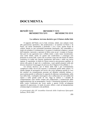 DOCUMENTA ______________________________________________________________ BENOÎT XVI BENEDICT XVI BENEDETTO XVI BENEDICTO XVI La cultura: terreno decisivo per il futuro della fede Il rapporto dell’Italia con la fede cristiana, infatti, non soltanto risale alla generazione apostolica, alla predicazione e al martirio di Pietro e di Paolo, ma anche attualmente è profondo e vivo. Certo, quella forma di cultura, basata su una razionalità puramente funzionale, che contraddice e tende ad escludere il cristianesimo e in genere le tradizioni religiose e morali dell’umanità, è presente e operante in Italia come un po’ ovunque in Europa. Qui però la sua egemonia non è affatto totale e tanto meno incontrastata: sono molti infatti, anche tra quanti non condividono o comunque non praticano la nostra fede, coloro che avvertono come una tale forma di cultura costituisca in realtà una funesta mutilazione dell’uomo e della sua stessa ragione. E soprattutto, in Italia la Chiesa conserva una presenza capillare, in mezzo alla gente di ogni età e condizione, e può quindi proporre nelle più diverse situazioni il messaggio di salvezza che il Signore le ha affidato. […] Un terreno decisivo, per il futuro della fede e per l’orientamento complessivo della vita di una nazione, è certamente quello della cultura. Vi chiedo dunque di proseguire nel lavoro che avete intrapreso perché la voce dei cattolici sia costantemente presente nel dibattito culturale italiano, e ancor prima perché si rafforzino le capacità di elaborare razionalmente, nella luce della fede, i molteplici interrogativi che si affacciano nei vari ambiti del sapere e nelle grandi scelte di vita. Oggi la cultura e i modelli di comportamento sono inoltre sempre più condizionati e caratterizzati dalle rappresentazioni che ne propongono i media: è benemerito pertanto lo sforzo della vostra Conferenza per avere anche a questo livello un’adeguata capacità di espressione, in modo da poter offrire a tutti un’interpretazione cristiana degli avvenimenti e dei problemi. Ai partecipanti alla LIV Assemblea Generale della Conferenza Episcopale Italiana, 30-05-2005. 273 Promouvoir le dialogue entre les cultures Le dialogue demande de conjuguer les efforts des personnes et des nations, pour le service du bien commun. La convergence entre tous les protagonistes, associée à une coopération effective, peut contribuer à édifier la vraie paix, en permettant de vaincre les tentations récurrentes de conflit à cause des différences de visions culturelles, d’ethnies ou de niveaux de développement. […] Le progrès technique ne sera vraiment efficace que s’il trouve sa place dans une perspective plus vaste, où l’homme occupe le centre, avec le souci de prendre en compte l’ensemble de ses besoins et de ses aspirations, car, comme dit l’Écriture, « l’homme ne vit pas seulement de pain » (Dt 8,3; Mt 4,4). Cela permettra aussi à chaque peuple de puiser dans son patrimoine de valeurs, pour partager ses propres richesses, spirituelles et matérielles, au bénéfice de tous. Les objectifs ambitieux et complexes que se donne votre Organisation ne pourront être atteints que si la protection de la dignité humaine, origine et fin des droits fondamentaux, devient le critère qui inspire et oriente tous les efforts. L’Église catholique, qui participe elle aussi aux actions visant à un développement réellement harmonieux, en collaboration avec les partenaires présents sur le terrain, souhaite encourager l’activité et les efforts de la FAO pour qu’elle suscite, à son niveau, un vrai dialogue des cultures et qu’elle contribue ainsi à augmenter la capacité de nourrir la population mondiale, dans le respect de la biodiversité. À Monsieur Jacques Diouf, Directeur général de l’Organisation des Nations unies pour l’Alimentation et l’Agriculture (FAO), 12-10-2005. L’inganno dell’ateismo San Basilio Magno in una delle pagine iniziali della sua prima omelia sull’Esamerone, in cui commenta il racconto della creazione secondo il capitolo primo della Genesi, si sofferma a considerare l’azione sapiente di Dio, ed approda a riconoscere nella bontà divina il centro propulsore della creazione. Ecco alcune espressioni tratte dalla lunga riflessione del santo Vescovo di Cesarea di Cappadocia: «“In principio Dio creò il cielo e la terra”. La mia parola si arrende sopraffatta dallo stupore di questo pensiero» (1,2,1: Sulla Genesi [Omelie 274 sull’Esamerone], Milano 1990, pp. 9.11). Infatti, anche se alcuni, «tratti in inganno dall’ateismo che portavano dentro di sé, immaginarono l’universo privo di guida e di ordine, come in balìa del caso», lo scrittore sacro invece «ci ha subito rischiarato la mente col nome di Dio all’inizio del racconto, dicendo: “In principio Dio creò”. E quale bellezza in questo ordine!» (1,2,4: ibidem, p. 11). «Se dunque il mondo ha un principio ed è stato creato, cerca chi gli ha dato inizio e chi ne è il Creatore... Mosè ti ha prevenuto col suo insegnamento imprimendo nelle nostre anime quale sigillo e filatterio il santissimo nome di Dio, quando dice: “In principio Dio creò”. La natura beata, la bontà esente da invidia, colui che è oggetto d’amore da parte di tutti gli esseri ragionevoli, la bellezza più d’ogni altra desiderabile, il principio degli esseri, la sorgente della vita, la luce intellettiva, la sapienza inaccessibile, Egli insomma, “in principio creò il cielo e la terra”» (1,2,6-7: ibidem, p. 13). Trovo che le parole di questo Padre del IV secolo siano di un’attualità sorprendente quando dice: “Alcuni, tratti in inganno dall’ateismo che portavano dentro di sé, immaginarono un universo privo di guida e di ordine, come in balìa del caso”. Quanti sono questi “alcuni” oggi. Essi, tratti in inganno dall’ateismo, ritengono e cercano di dimostrare che è scientifico pensare che tutto sia privo di guida e di ordine, come i