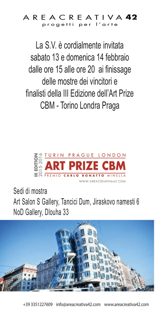 La S.V. è cordialmente invitata sabato 13 e domenica 14 febbraio dalle ore 15 alle ore 20 ai finissage delle mostre dei vincitori e finalisti della III Edizione dell’Art Prize CBM - Torino Londra Praga Sedi di mostra Art Salon S Gallery, Tancici Dum, Jiraskovo namesti 6 NoD Gallery, Dlouha 33 +39 3351227609 [email protected] www.areacreativa42.com