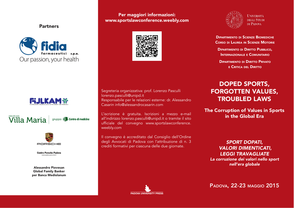 Partners Per maggiori informazioni: www.sportslawconference.weebly.com DIPARTIMENTO DI SCIENZE BIOMEDICHE CORSO DI LAUREA IN SCIENZE MOTORIE DIPARTIMENTO DI DIRITTO PUBBLICO, INTERNAZIONALE E COMUNITARIO DIPARTIMENTO DI DIRITTO PRIVATO E CRITICA DEL DIRITTO Segreteria organizzativa: prof. Lorenzo Pasculli [email protected] Responsabile per le relazioni esterne: dr. Alessandro Casarin [email protected] L’iscrizione è gratuita. Iscrizioni a mezzo e-mail all’indirizzo [email protected] o tramite il sito ÕvwV>i `i VÛi} ÜÜܰëÀÌÃ>ÜVviÀiVi° ÜiiLÞ°V Il convegno è accreditato dal Consiglio dell’Ordine degli Avvocati di Padova con l’attribuzione di n. 3 crediti formativi per ciascuna delle due giornate. www.padova.porsche.it DOPED SPORTS, FORGOTTEN VALUES, TROUBLED LAWS The Corruption of Values in Sports in the Global Era SPORT DOPATI, VALORI DIMENTICATI, LEGGI TRAVAGLIATE La corruzione dei valori nello sport nell’era globale Alessandro Piovesan Global Family Banker per Banca Mediolanum PADOVA, 22-23 MAGGIO 2015 7(+6=(<50=,9:0;@79,:: criminal law doping sport corruption valuesglobalization ethics drugs fair play sport business frauds PRESENTATION OF THE CONFERENCE ÀiÌ >Ì iÀ Õ>>VÌÛÌiÃ]ëÀÌ>`ÜÌ ÌëÀÌÃ>Ü® ÃÌÀÃV>ÞL>Ãi`ÃivÌ i } iÃÌÛ>ÕiÃv Õ>ÌÞ] ÃÕV >à vÀii`] `iVÀ>VÞ] Ã`>ÀÌÞ] «ÕÀ>Ã] iµÕ>ÌÞ] «>VwÃ]v>À«>ÞiÌV°ƂÃ>ÞÌ iÀ Õ>>VÌÛÌÞ]Ì Õ} ]>à sports are permeable to the most disparate forms of corruption v ÃÕV Û>ÕiÃ] Üi iÝi«wi` LÞ `«}] Ü V >vviVÌ À] À>Ì iÀ]viVÌ®Ì i`ii«iÃÌÀÌÃvëÀÌÃ>à «LÞÃÕLÛiÀÌ} Ìà ÃÌ Û>Õ>Li i>}à >` «ÀV«ià >` LÞ ÃÕ>Ì} i}>ÌÞ >` ÕÃÌVi ëÀÌð ÀiÛiÀ] Ì iÀ iÌ V> >` VÀ> `ÃÌÀÌà >Ài VÀi>Ã}Þ Ì Ài>Ìi} ëÀÌÃ] ÃÕV >à LÀLiÀÞ] Ì>Ý vÀ>Õ`] >ÌV wÝ}] `ÀÕ} >` Õ> ÌÀ>vwV}] vÌi v>VÌ>Ìi` LÞ Ì i >Þ «À}ÀiÃÃià >` ÌiV }ià v }L>Ã>Ì] Ì}iÌ iÀ ÜÌ Ì i iÛiÀVÀi>Ã} VÀVÕ>Ì v «iÀÃÃ]>ÃÃiÌÃ>`Üi`}iÌÞ«V>vÌ i}L>iÀ>° / i VviÀiVi >à >Ì «ÀÛ`} > Ì ÀÕ} >>ÞÃà v ÃÕV ÃÌÕ>Ì>}L>>`ÌiÀ`ÃV«>ÀÞ«iÀëiVÌÛi]>ÃÃÕ} `«} >à > «>À>`}>ÌV V>Ãi ÃÌÕ`Þ] Ì Þ LiV>ÕÃi v Ìà ÜÀ`Ü`iÀiiÛ>Vi]LÕÌiëiV>ÞLiV>ÕÃiÌÃiLi>ÌV> v Ì i «ÀLi>ÌV LÕ`>Àià LiÌÜii Û>Õià >` `ÃÛ>ÕiÃ] i}>ÌÞ>`i}>ÌÞ]À>ÌÞ>`VÀi° PRESENTAZIONE DEL CONVEGNO Più di ogni altra attività umana, lo sport (e con esso il diritto ëÀÌÛ® à v`> ÌÀÃiV>iÌi ÃÕ Ì>Õ `i «Ù >Ì Û>À dell’umanità, fra cui la libertà, la democrazia, il solidarismo, il «ÕÀ>Ã]½i}Õ>}>â>]«>VwÃ]v>À«>ÞiÌV° i} altra attività umana, tuttavia, anche lo sport è permeabile alle «Ù`ë>À>ÌivÀi`VÀÀÕâi`Ì>Û>À]LiiÃi«wV>Ì> `> `«}] V i ÌVV> i} VÌ>>® i «Ù «Àv`i radici dello spirito sportivo insinuando illegalità e ingiustizia negli sport. Inoltre, altre distorsioni etiche e criminose vanno sempre più minacciando lo sport, come la corruzione in senso ÃÌÀiÌÌ] ½iÛ>Ãi wÃV>i] >ÌV wÝ}] ÌÀ>vwV ` `À}> i ` persone, spesso facilitati dai molti progressi e tecnologie della globalizzazione, insieme alla crescente circolazione di persone, capitali e conoscenze tipica dell’era globale. La conferenza mira a fornire una profonda analisi di tale situazione in prospettiva globale e inter-disciplinare, assumendo il doping µÕ>i V>ÃiÃÌÕ`Þ «>À>`}>ÌV] à «iÀ > ÃÕ> ÀiÛ>â> mondiale, ma soprattutto per il fatto di essere emblematico dei «ÀLi>ÌV Vw vÀ> Û>À i `ÃÛ>À] i}>ÌD i i}>ÌD] immoralità e criminalità. PRIMA GIORNATA (Venerdì 22 maggio 2015 – Aula Magna “Galileo Galilei” Palazzo del Bo, via VIII Febbraio 1848 n. 2, Padova) 13:30 – Registrazione £{\ääq->ÕÌ`i>}wV,iÌÌÀi«Àv°Giuseppe Zaccaria Saluto del Presidente del Corso di Laurea in Scienze Motorie prof. Carlo Reggiani Saluto del Direttore del Dipartimento di Diritto Pubblico, Internazionale e Comunitario prof. Patrizia Marzaro Saluto del Direttore del Dipartimento di Diritto Privato e Critica del Diritto prof. Giuseppe Amadio Presiede prof. Santo Davide Ferrara (Università degli -ÌÕ``*>`Û>® Prima sessione PLAYING FAIRLY: SPORT, LEGALITY AND HUMAN VALUES IN THE GLOBAL ERA 14:30-16:00 – Relazioni Prof. Paolo Moro1ÛiÀÃÌD`i}-ÌÕ``*>`Û>® v>À «>Þ Vi «ÀV« }ÕÀ`V° ÌV> >}ÃÌV> i sportività Prof. José Luis Pérez Triviño (Universitat Pompeu Fabra >ÀVi>® Does doping affect sport values? Prof. Santo Davide Ferrara, prof. Donata Favretto 1ÛiÀÃÌD`i}-ÌÕ``*>`Û>® ƂÌ`«}°ÌVÌD]µÕ>ÌD]ViÀÌiââ>ViÀÌiââ> Prof. Danilo Berteotti 1ÛiÀÃÌD`i}-ÌÕ``*>`Û>® Lo sport business. I cambiamenti del mondo dello sport nell’era globale 16:00-16:30 – Question time e discussione £È\Îä£È\{xqÀi> Seconda Sessione THE CORRUPTION OF VALUES IN SPORT: THE PARADIGMATIC CASE OF DOPING 16:45-18:15 – Relazioni Prof. Jack Anderson+Õii½Ã1ÛiÀÃÌÞiv>ÃÌ® / iÕÀ`wV>Ìv`«}`ëÕÌiÃëÀÌ Prof. Sergio Bonini1ÛiÀÃÌD`i}-ÌÕ``/ÀiÌ® `«}Vi¸VÀÀÕâi¸>µÕ`V>`>>i}}i 376/2000: un bilancio alla luce dei principi penalistici di garanzia Prof. Antonio Paoli 1ÛiÀÃÌD`i}-ÌÕ``*>`Û>® >wÃ}>>iÌÌiº«iÌÌ`i`«}»\Û>Ì>}} sleali a lungo termine delle pratiche dopanti Prof. Jacopo Tognon1ÛiÀÃÌD`i}-ÌÕ``*>`Û>® Il Codice Mondiale Antidoping 2015 e la giurisprudenza del TAS/CAS 18:15-18:45 – Question time e discussione SECONDA GIORNATA (Sabato 23 maggio 2015 – Aula Magna del Complesso Vallisneri, via Ugo Bassi n. 58/B, Padova) Terza Sessione NOT ONLY DRUGS: FROM DOPING TO OTHER CRIMINAL TRAFFICS IN SPORT 8:45-9:00 – Registrazione 9:00-10:00 – Relazioni Avv. Marco RebeccaƂÛÛV>Ì`iÀ`/ÀiÛî La responsabilità penale dei dirigenti delle società e delle associazioni sportive Dr. Raffaele Rizzardi (Dottore Commercialista in Bergamo, Componente del Comitato Fiscale della Confédération ÃV>iÕÀ«jii® À`iVÌ>Li]vÀ`iwÃV>iiÀVV>}}iëÀÌ Dr. Debora Provolo