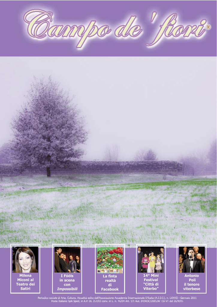 Milena Miconi al Teatro dei Satiri I Fóòls in scena con Impossibili La finta realtà di Facebook 14° Mini Festival “Città di Viterbo” Antonio Poli il tenore viterbese 2 Campo de’ fiori SOMMARIO Editoriale: Il miracolo di Natale.................................3 L’intervista: Norma Martelli.......................................4-5 Ennio Drovandi.........................................7 Curriculum vitae: Maria Teresa Di Bari.................................8 Procuste ed altri galantuomini...........11 Roma che se n’è andata: Roma e Caravaggio............................12-13 Cinema News: Crime d’amour........................................14 Pari Opportunità.................................15 Suonare Suonare: Cast in Bronze...................................16-17 Ecologia e ambiente: Acqua un bene da tutelare......................18 Il Cerchio Invisibile stupisce Castrocaro...........................................19 L’ortesi plantare .................................21 Presentazione ufficiale del libro: “Il Bullismo. Come riconoscerlo e combatterlo............................. .........................22 Le guide di Campo de’ fiori: Sant’Agata Feltria...................................24 Come eravamo: Natale, Natale, un altro Natale.................25 Una “Fabrica” di ricordi: La neve di Natale....................................26 Ass. Artistica IVNA: Katia Aiello........................................28-29 Un Pugnalone alle Canarie.................................................30 Del Concepimento e della Vita...........32 La Cassa di Risparmio di Civita Castellana ..........................................33 Civitonici Illustri: L’Abate Ludovico Soderini........................34 Il mondo del Jazz: George Vitelle-Papa Jack Laine................36 L’angolo Bon Ton Una visita di Babbo Natale......................37 Epicondilite..........................................38 La storia della previdenza sociale in Italia ...................................................39 Nuovo successo per il giovane Maestro Enrico Mazzoni....................................40 Piazza Marcantoni..........................................41 Ancora un saluto a Don Mario............42 Il Fumetto: Rapaci....................................................43 Nel cuore.............................................44 Le storie di Max: Fiorella Mannoia.....................................45 Un’auto tutta nuova per l’ATAMO......46 Oroscopo..............................................47 Agenda ................................................48 Da Fabrica di Roma con amore .........49 Messaggi.........................................51-51 I nostri amici ......................................52 Album dei ricordi.........54-55-56-57-58-59 Annunci gratuiti ............................60-61 Selezione Offerte Immobiliari.......63-64 Foto di copertina concessa da Madonna del Botticelli VISITATE LA NOSTRA PAGINA DI FACEBOOK E RICHIEDETECI L’AMICIZIA!!!! VI TERREMO AGGIORNATI SULLE NOVITA’ DI CAMPO DE’ FIORI! LA RIVISTA CHE AMATE DI PIU’ Campo de’ fiori di Sandro Anselmi _t Äâvx wxÄÄËtÇ|Åt Da che esiste, l’uomo ha sempre lottato per ottenere la vita eterna, e perciò ha condotto la sua esperienza terrena esplorando tutte le strade per elevarsi, per tendere alla perfezione spirituale. Il rispetto delle regole sociali, il coltivare virtù quali la carità, il perdono, la misericordia, la riconoscenza, e l’adorazione di un Essere superiore sono, da sempre, gli strumenti per ciò. Oggi, però, viviamo giorni dove tutto muove al mantinente, dove tutto debba finire durante questa vita, e tutto si possa trovare in questo mondo. Tutto possiamo avere e consumare, ed ogni liceità è consentita pur di appagare il nostro corpo! Cade anche l’ultima morale paghi della posizione migliore raggiunta, e la lotta per il finto potere riempie il nostro tempo. Non possiamo peccare così! Laviamo i nostri peccati per cercare la pace e la gioia vera, quella che è nello spirito e non nei sensi, e non muore mai! Combattiamo strenuamente la nostra battaglia per preservare lo spirito che abita in noi, per salvarlo dallo squallore del materialismo ed alimentarlo della luce dell’anima. L’energia vibrante ed infinita dello spirito, prevale la caducità del corpo che lo alberga, ed allora viviamo questa vita per conservarne la purezza e tramandarla ai figli che verranno!!! L’anima non muore. 3 Campo de’ fiori 4 Al Teatro dei Satiri con Pane e befana MILENA MICONI Non riesco sempre a conciliare il lavoro con il fare la mamma. Ma sono due cose che amo tantissimo e ce la metto tutta! livello di programmazione ed è una bella gratificazione per me che ho fatto tanto teatro e nel frattempo ho avuto una nuova bambina”. Come ti sei trovata a lavorare con un collega di fiction come Falaguasta? “Con Marco è stata una bella scoperta professionale! Lo conoscevo da tempo, ma non c’era mai stata occasione di lavorare insieme e, da un paio di anni, collaboriamo insieme. Lui è autore apprezzatissimo, oltre che attore di questa commedia, e ci divertiamo tutti quanti moltissimo, perché questa compagnia – Bona la Prima – lavora insieme da tantissimi anni. Inserirsi in questo gruppo è stato facilissimo. Ci divertiamo e divertiamo il pubblico”. Nuovo numero e nuovo anno e per iniziare bene la nuova stagione non potevamo far altro che parlare di un’ artista completa, che è ritornata a recitare in uno dei teatri storici di Roma proprio a Gennaio e, proprio con un testo propostole da Marco Falaguasta, arguto autore, regista e attore romano. Pane e Befane al Teatro de’ Servi vede una splendida Milena Miconi interpretare una befana molto particolare… Finalmente si torna a teatro! “Si, devo dire che sono molto contenta di essere tornata a lavorare in questo teatro dove, qualche anno fa, ero stata per interpretare “Lo scatolone”. Siamo poi in uno dei teatri più interessanti di Rom