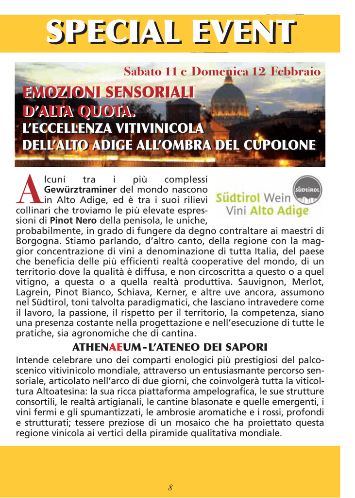 SPECIAL EVENT Sabato 11 e Domenica 12 Febbraio EMOZIONI SENSORIALI D’ALTA QUOTA. L’ECCELLENZA L’ECCELLENZA VITIVINICOLA VITIVINICOLA DELL’ALTO DELL’ALTO ADIGE ADIGE ALL’OMBRA ALL’OMBRA DEL DEL CUPOLONE CUPOLONE A lcuni tra i più complessi Gewürztraminer del mondo nascono in Alto Adige, ed è tra i suoi rilievi collinari che troviamo le più elevate espressioni di Pinot Nero della penisola, le uniche, probabilmente, in grado di fungere da degno contraltare ai maestri di Borgogna. Stiamo parlando, d’altro canto, della regione con la maggior concentrazione di vini a denominazione di tutta Italia, del paese che beneficia delle più efficienti realtà cooperative del mondo, di un territorio dove la qualità è diffusa, e non circoscritta a questo o a quel vitigno, a questa o a quella realtà produttiva. Sauvignon, Merlot, Lagrein, Pinot Bianco, Schiava, Kerner, e altre uve ancora, assumono nel Südtirol, toni talvolta paradigmatici, che lasciano intravedere come il lavoro, la passione, il rispetto per il territorio, la competenza, siano una presenza costante nella progettazione e nell’esecuzione di tutte le pratiche, sia agronomiche che di cantina. ATHENAEUM - L’ATENEO DEI SAPORI Intende celebrare uno dei comparti enologici più prestigiosi del palcoscenico vitivinicolo mondiale, attraverso un entusiasmante percorso sensoriale, articolato nell’arco di due giorni, che coinvolgerà tutta la viticoltura Altoatesina: la sua ricca piattaforma ampelografica, le sue strutture consortili, le realtà artigianali, le cantine blasonate e quelle emergenti, i vini fermi e gli spumantizzati, le ambrosie aromatiche e i rossi, profondi e strutturati; tessere preziose di un mosaico che ha proiettato questa regione vinicola ai vertici della piramide qualitativa mondiale. 8 SPECIAL EVENT PROGRAMMA DELLA MANIFESTAZIONE SABATO 11 FEBBRAIO ore 16.00 - 20.00 • Le Degustazioni e i Laboratori ore 16.00 • 20.00 Degustazioni libere e gratuite all’interno di diverse enoteche di Roma. Bomprezzi - Via Tuscolana, 904 • Bulzoni - Viale Parioli, 36 Giansanti - Via Ostiense, 34 • Graziani - Via di Santa Costanza, 9 Il Vino del ’99 - Via Lodovica Albertoni, 76 • Trimani - Via Goito, 20 Uve e Forme • Via Padova, 6 ore 17.00 Trimani Wine Bar • Laboratorio sensoriale: “Lagrein: Il grande rosso del Südtirol a confronto” ore 17.00 Enoteca Giansanti • Laboratorio sensoriale: “Gewürztraminer: Colori, profumi ed emozioni del bianco” Costo Laboratori: euro 10,00 Gratuito per iscritti Athenæum INGRESSO LABORATORIO SOLO SU PRENOTAZIONE ore 20.30 • Le Cene Ristorante Spiriti e Forme Vicolo Scavolino, 63 (Fontana di Trevi) Antipasto: Sformato di alici cacio e pepe Primo: Mezzemaniche in guazzetto di mare Secondo: Filetto di pesce in crosta di mandorle e patate Dolce: Pasticcio di mele In abbinamento i vini delle cantine partecipanti alla manifestazione. COSTO: 50 EURO LABORATORI E CENE SOLO SU PRENOTAZIONE Athenæum: 06.4880601 • 346.3727947 • [email protected] 9 Ristorante Grappolo d’Oro Zampanò Piazza della Cancelleria, 80 Antipasto misto romano: Polpetta di coda alla vaccinara, Polpetta di bollito, Panzanella, Animelle e coratella coi carciofi Primo: Rigatoni al sugo di coda Secondo: Guancia di manzo brasata con contorno di misticanza di campagna ripassata Dolce: Crostata di ricotta e visciole In abbinamento i vini delle cantine partecipanti alla manifestazione. COSTO: 45 EURO Ristorante Antico Arco Piazzale Aurelio, 7 Piccolo benvenuto “Antico Arco” Antipasto: Mozzarella di bufala croccante bottarga di muggine e pomodorini confit Primo: Ravioli di chèvre liquido con ragù di quaglia al tartufo nero Secondo: Filetto di agnello in crosta di nocciole e insalata di germogli al balsamico Dolce: Tortino di cioccolato con cuore morbido e gelato di crema e rhum In abbinamento i vini delle cantine partecipanti alla manifestazione. COSTO: 60 EURO LABORATORI E CENE SOLO SU PRENOTAZIONE: Athenæum: 06.4880601 • 346.3727947 • [email protected] 10 SPECIAL EVENT DOMENICA 12 FEBBRAIO ore 16.30 • 20.30 St. Regis Grand Hotel GRANDE SALA DEL GUSTO CON DEGUSTAZIONI A BANCHI D’ASSAGGIO N ella splendida cornice del St. Regis Grand Hotel già teatro delle gesta di Cesar Ritz e del grande Escoffier, una sontuosa rappresentanza del panorama enologico Sud Tirolese, vi permetterà di incamminarvi lungo un entusiasmante sentiero sensoriale, impreziosito, oltre che dai nettari di Bacco, da prelibatezze gastronomiche artigianali del territorio. LE AZIENDE PARTECIPANTI: Abbazia di Novacella • Cantina Andriano • Josef Brigl Cantina Valle Isarco • Kellerei Kaltern Caldaro Produttori Colterenzio • Erste + Neue • Girlan • Kettmeir Weinhof Kobler • Podere Provinciale Laimburg • Manincor K. Martini & Sohn • Cantina Merano Burggrafler Muri-Gries Tenuta/Cantina Convento • Ritterhof Tenuta Cantina Produttori San Paolo • Cantina Terlano Tramin • Josef Weger • Peter Zemmer Ingresso: euro 10,00 Athenæum-Club Gourmet euro 5,00 PER ACCEDERE ALLA GRANDE SALA NON OCCORRE PRENOTARE Informazioni: Athenæum - L’Ateneo dei Sapori • tel. 06.4880601 • 346.3727947 [email protected] - www.ateneodeisapori.it 11
