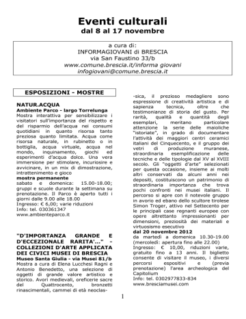 Eventi culturali dal 8 al 17 novembre a cura di: INFORMAGIOVANI di BRESCIA via San Faustino 33/b www.comune.brescia.it/informa giovani [email protected] ESPOSIZIONI - MOSTRE -sica, il prezioso medagliere sono espressione di creatività artistica e di sapienza tecnica, oltre che testimonianze di storia del gusto. Per rarità, qualità e quantità degli esemplari, meritano particolare attenzione la serie delle maioliche “istoriate”, in grado di documentare l’attività dei maggiori centri ceramici italiani del Cinquecento, e il gruppo dei vetri di produzione muranese, straordinaria esemplificazione delle tecniche e delle tipologie dal XV al XVIII secolo. Gli “oggetti d’arte” selezionati per questa occasione, insieme ai molti altri conservati da alcuni anni nei depositi, costituiscono un patrimonio di straordinaria importanza che trova pochi confronti nei musei italiani. Il percorso si apre con il notevole gruppo in avorio ed ebano dello scultore tirolese Simon Troger, attivo nel Settecento per le principali case regnanti europee con opere altrettanto impressionanti per dimensioni, preziosità dei materiali e virtuosismo esecutivo dal 20 novembre 2012 da martedì a domenica 10.30-19.00 (mercoledì: apertura fino alle 22.00) Ingresso: € 10,00, riduzioni varie, gratuito fino a 13 anni. Il biglietto consente di visitare il museo, i diversi percorsi espositivi e (previa prenotazione) l'area archeologica del Capitolium Info: tel. 0302977833-834 www.bresciamusei.com NATUR.ACQUA Ambiente Parco - largo Torrelunga Mostra interattiva per sensibilizzare i visitatori sull’importanza del rispetto e del risparmio dell’acqua nei consumi quotidiani in quanto risorsa tanto preziosa quanto limitata. Acqua come risorsa naturale, in rubinetto o in bottiglia, acqua virtuale, acqua nel mondo, inquinamento, giochi ed esperimenti d’acqua dolce. Una vera immersione per stimolare, incuriosire e avvicinare, in un mix di dimostrazione, intrattenimento e gioco mostra permanente sabato e domenica: 15.00-18.00; gruppi e scuole durante la settimana su prenotazione. Il Parco è aperto tutti i giorni dalle 9.00 alle 18.00 Ingresso: € 6,00; varie riduzioni Info: tel. 030361347 www.ambienteparco.it "D'IMPORTANZA GRANDE E D'ECCEZIONALE RARITA'..." COLLEZIONI D'ARTE APPLICATA DEI CIVICI MUSEI DI BRESCIA Museo Santa Giulia - via Musei 81/b Mostra a cura di Elena Lucchesi Ragni e Antonio Benedetto, una selezione di oggetti di grande valore artistico e storico. Avori medievali, oreficerie sacre del Quattrocento, bronzetti rinascimentali, cammei di età neoclas- 1 LAURA GIANCATERINA: APPUNTI LA GIOCONDA: COSTEI? Qoelet-Il Salotto Buono - corso Cavour 25/b Mostra fotografica di Laura Giancaterina; a cura di Renato Corsini fino al 8 novembre 2013 mercoledì e giovedì: 18.00-22.00; venerdì e sabato: 18.00-24.00; domenica: 16.00-22.00 Ingresso libero con tessera ARCI www.qoelet.it CHI ERA Parco, Villa Mazzotti - Chiari (Bs) MicroEditoria - XI edizione: l'identità della Gioconda e le incredibili somiglianze tra il paesaggio dello sfondo dipinto da Leonardo Da Vinci e il Lago d'Iseo: in mostra "prove" a sostegno di una tesi interessante. A cura di Sandro Albini dal 8 al 10 novembre venerdì: 17.30-22.00; sabato: 10.0022.00; domenica: 10.00-20.00 www.microeditoria.it TRASFORMAZIONI IBRIDE Scuderie, Villa Mazzotti - Chiari (Bs) MicroEditoria - XI edizione: mostra di illustrazioni di Paride Cevolani, a cura di Annalisa Mombelli. Siamo ancora capaci di introspezione o ci lasciamo divorare da paure e incertezze ignorandone l'esistenza? Questo giovane artista ferrarese attraverso il tratto sottile e raffinato dei suoi disegni e con i delicati intensi colori di matite e acquerelli affronta con sincerità, schiettezza e ironia un mondo interiore che rende visibile in contorsioni e fusioni di elementi vegetali, animali, umani (paridecevolani.blogspot.it) dal 8 al 10 novembre venerdì: 17.30-22.00; sabato: 10.0022.00; domenica: 10.00-20.00 www.microeditoria.it TI AMO TROPPO... NO AL SILENZIO! BASTA VIOLENZA SULLE DONNE Bar - Sala drappi piano terra Scuderie, Villa Mazzotti - Chiari (Bs) MicroEditoria - XI edizione: mostra itinerante di vignette satiriche del satirist e artista multimediale Furio Sandrini (alias Corvo Rosso) che riesce a declinare con acuta perfidia la dolorosa e purtroppo sempre attuale scabrosità dell'argomento, a dispetto della censura e autocensura in cui quotidianamente affonda. Sabato 9, alle ore 10.00, saranno presenti l’artista e la Consigliera di Parità Provinciale Dott.ssa Anna Maria Gandolfi. “La mostra apre il piano nobile della satira al tema della violenza sulle donne”. Introduce Eleonora Turati dal 8 al 10 novembre venerdì: 17.30-22.00; sabato: 10.0022.00; domenica: 10.00-20.00 www.microeditoria.it SE LEGGERE NON E' IL TUO FORTE FANNE IL TUO DEBOLE Scuderie, Villa Mazzotti - Chiari (Bs) MicroEditoria - XI edizione: 40 tavole autografe del satirist Furio Sandrini, alias Corvo Rosso, dove si mettono in corto circuito gli stereotipi sull'inattualità della lettura indagando con tagliente ironia il complesso rapporto tra italiani, Belpaese e letteratura dal 8 al 10 novembre venerdì: 17.30-22.00; sabato: 10.0022.00; domenica: 10.00-20.00 www.microeditoria.it RINALDO TURATI: INSTALLAZIONI Sala presentazioni e ingresso, Villa Mazzotti - Chiari (Bs) MicroEditoria - XI edizione: installazioni di Rinaldo Turati dal 8 al 10 novembre venerdì: 17.30-22.00; sabato: 10.0022.00; domenica: 10.00-20.00 www.microeditoria.it 2 le architetture nascoste. Nelle sculture di Forges Davanzati il tocco dell'osservatore è fondamentale perché l'opera riveli il gioco di forze e di equilibri che la anima. A questo proposito Bruno Munari scrisse “uno degli oggetti di Forges Davanzati che mi suggestiona come se fosse vivo è il Rotifero. Le sue forme lo denunciano dinamico, come se fosse sempre pronto allo scatto, a un rivoltamento improvviso”. L'acciaio, materiale d'elezione dell'artista, permette una curvat