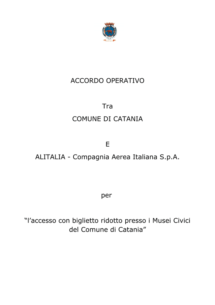 ACCORDO OPERATIVO Tra COMUNE DI CATANIA E ALITALIA - Compagnia Aerea Italiana S.p.A. per “l’accesso con biglietto ridotto presso i Musei Civici del Comune di Catania” Spettabile Alitalia – Società Aerea Italiana S.p.A. Via A. Nassetti snc, Pal ALFA, 00054 Fiumicino, Roma. All’attenzione del Dott. Marco Martinasso Vice President Marketing Catania, ….…/……. /……. Oggetto: Proposta Convenzione tra Comune di Catania e Alitalia – Compagnia Aerea Italiana. Egregio Dott. Martinasso, come da accordi intercorsi, sottoponiamo alla Vostra attenzione il testo dell’Accordo di cui all’oggetto. Convenzione tra ALITALIA - Società Aerea Italiana S.p.A. - con sede legale in Fiumicino (RM), Via A. Nassetti snc, Pal. ALFA, 00054, capitale sociale versato, pari ad euro 103.105.126,99 i.v., codice fiscale, partita IVA e numero di iscrizione al Registro delle Imprese di Roma 13029381004, REA di Roma n. 1418603 e Comune di Catania, con sede legale la sede presso il Municipio, piazza Duomo 3, CAP 95100, Partita I.V.A. P.Iva 00137020871 rappresentato dal sindaco avv. Vincenzo Bianco, nato a Aidone (EN), il 24-02-51, domiciliato per la carica in Catania presso la sede del Municipio Premesso che: a) il Comune di Catania è interessato a promuovere l’esercizio di attività e la realizzazione di iniziative volte a valorizzare i beni artistici e culturali in ambito cittadino e nazionale anche mediante l’esercizio di tutte le attività strumentali atte alla valorizzazione del patrimonio artistico e culturale quali mostre, manifestazioni culturali e di spettacolo. b) il Comune di Catania, al fine di valorizzare le proprie iniziative è interessata ad ampliare la platea dei possibili fruitori attraverso la stipula di convenzioni con importanti Partner come Alitalia, dotati di un considerevole numero di clienti; c) Alitalia ha interesse a che i propri passeggeri, come di seguito meglio specificati, possano accedere, a condizioni di miglior favore, ad offerte/servizi del Comune di Catania, sotto forma di sconti commerciali (biglietto ridotto), come di seguito specificato; d) Alitalia e il Comune di Catania sono interessati ad istaurare un rapporto di collaborazione che preveda la possibilità, per tutti i Passeggeri Alitalia, come di seguito definiti, di accedere ad offerte/servizi del Comune di Catania a condizioni vantaggiose, sotto forma di sconti commerciali (biglietto ridotto), come di seguito meglio descritto; e) il rapporto tra Alitalia e Comune di Catania non prevede alcuna forma di onerosità a carico di Alitalia e a favore di Comune di Catania per le agevolazioni di cui al punto d) concesse ai Passeggeri Alitalia. f) il presente rapporto tra Alitalia e Comune di Catania non è collegato ad altra precedente operazione o rapporto commerciale posto in essere tra le Parti. Tutto ciò premesso si conviene e stipula quanto segue 1. VALORE GIURIDICO DELLE PREMESSE Le Premesse costituiscono parte integrante e sostanziale del presente Accordo. 2. OGGETTO Il Comune di Catania si impegna a riconoscere senza alcun corrispettivo, fino al 31.12.2016, a tutti i clienti Alitalia in possesso di una carta di imbarco con partenza e destinazione Catania (di seguito “Passeggeri Alitalia”), l’accesso con biglietto ridotto presso i musei del Comune di Catania, e precisamente: Museo Civico Castello Ursino Museo Belliniano - Emilio Greco Le informazioni relative alle suddette strutture e al valore del biglietto ridotto possono essere consultate rispettivamente su: www.comune.catania.it (Sito internet del Comune di Catania) Lo sconto verrà riconosciuto esclusivamente ai clienti Alitalia che dimostrino, al momento dell’acquisto del biglietto per l’ ingresso ai musei del Comune di Catania, di essere in possesso di una carta d’imbarco con partenza e/o destinazione Catania e con data antecedente di massimo 5 gg. quella prescelta per l’accesso ai musei del Comune di Catania. Il Comune di Catania si impegna, inoltre, a riconoscere ai clienti Alitalia in possesso di un titolo di viaggio con le caratteristiche sopraindicate, uno sconto pari a 20 % per l’acquisto del biglietto di accesso ai musei civici del Comune di Catania Tale Convenzione e le modalità di fruizione verranno segnalate a titolo meramente informativo: – da parte di Alitalia, a propria cura e spese, con lo scopo di informare i propri clienti, sul sito www.alitalia.it nell’area dedicata al proprio Progetto “Vivi l’Italia” e attraverso la segnalazione di detta Convenzione sui propri canali di comunicazione (a titolo esemplificativo: banner sul sito in HP, Direct mailing, etc); – da parte del Comune di Catania a propria cura e spese, attraverso i propri canali media (sito internet), con lo scopo di informare i propri clienti delle iniziative che la stesso Comune di Catania intende attuare al fine di valorizzare i beni artistici e culturali in ambito cittadino e nazionale. Resta, altresì, inteso tra le Parti che Alitalia è estranea a qualsiasi rapporto che si andrà ad instaurare tra il Comune di Catania e i propri passeggeri in relazione alle prestazioni oggetto della presente Convenzione, restando pertanto esclusa ogni sua qualsivoglia responsabilità. Il Comune di Catania, pertanto, si obbliga e tenere indenne e manlevare Alitalia da ogni azione, reclamo, contestazione o pretesa risarcitoria che dovesse essere avanzata nei confronti di questa dai Passeggeri Alitalia o da terzi, derivante o connessa all’esecuzione del presente Accordo, salvo che non siano imputabili a dolo o colpa grave di Alitalia. Il Comune di Catania si impegna ad inviare con cadenza trimestrale un report delle prestazioni fruite dai Passeggeri Alitalia in virtù della presente Convenzione. 3. MARCHI Il presente Accordo non costituisce cessione e/o licenza, neppure parziale, dei rispettivi loghi, che rimangono di esclusiva proprietà di ciascuna parte. E’ pertanto fatto divieto alle parti di utilizzare in qualsiasi modo e/o cedere a terzi, la deno
