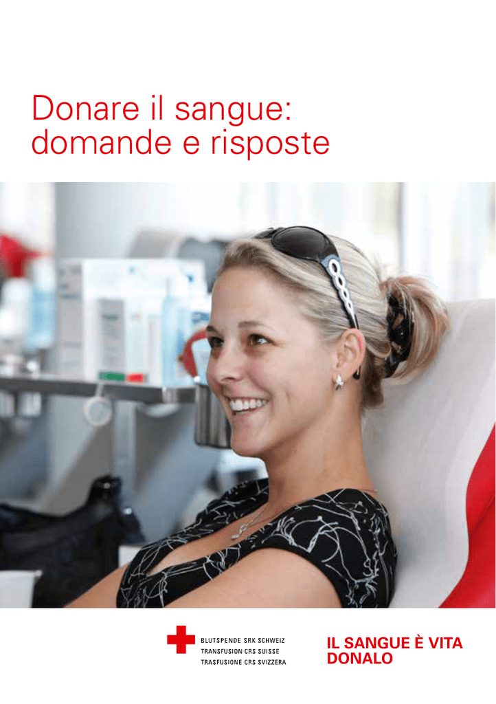Donare il sangue: domande e risposte IL SANGUE È VITA DONALO Indice Perché è importante donare il sangue? 4 Qual’è la funzione del sangue e da cosa è composto? 4 Cosa sono i gruppi sanguigni? 6 Chi può donare il sangue? 6 I requisiti fondamentali per la donazione di sangue 8 Che cosa si deve osservare prima della donazione? 10 Come avviene una donazione di sangue? Quanto tempo richiede la donazione di sangue? Perché si deve compilare il questionario ogni volta? Perché viene determinata l’emoglobina? Donare il sangue è doloroso? Quanto sangue si dona? 10 10 11 11 12 12 Che cosa si deve osservare dopo la donazione? Posso guidare l’automobile dopo la donazione? Una donazione di sangue compromette le prestazioni sportive? Quanto tempo occorre affinché il corpo sostituisca il sangue donato? Con quale frequenza si può donare il sangue? 12 12 13 Cosa accade con il sangue dopo la donazione? Si conoscono i risultati dell’esame del sangue? Come viene trattato il sangue? Quanto si conserva il sangue? 14 14 15 15 Per che cosa viene impiegato il sangue donato? 15 Quali tipi di donazione ci sono? La donazione di sangue intero La donazione per aferesi La donazione di cellule staminali del sangue 16 16 16 16 Dove e quando posso donare il sangue? 18 Come contattarci 19 13 13 Nota: diamo grande importanza alla parità di trattamento. La forma linguistica maschile o femminile a volte abbreviata per ragioni di leggibilità include sempre anche l’altro sesso. 4 Il sangue non è sostituibile. Per questo è molto importante donarlo. Perché è importante donare il sangue? Fino ad oggi non è stato possibile creare una sorta di sangue artificiale. Per gli incidenti, la cura dei malati di cancro o per le malattie cardiache occorre sangue. E il fabbisogno è sempre crescente. Senza i donatori di sangue, anche le migliori cure mediche non sono efficaci. Qual’è la funzione del sangue e da cosa è composto? Il sangue porta ossigeno, nutrimento ed energia ai nostri tessuti. Il sangue depura l’organismo, rimargina le ferite e protegge dalle infezioni. È composto per il 45 % da cellule e per il 55 % da plasma. Le cellule si suddividono in globuli rossi, che trasportano l’ossigeno, e globuli bianchi, che, tra l’altro, difendono dagli agenti patogeni. Un terzo tipo di cellule sono le piastrine. Sono fondamentali per combattere le emorragie. I globuli rossi trasportano l’ossigeno I globuli bianchi difendono dagli agenti patogeni ed eliminano le cellule morte Le piastrine sono fondamentali per combattere le emorragie Il plasma sanguigno contiene sostanze nutritive e aiuta a combattere le emorragie ed a prevenire le infezioni 6 La donazione di sangue in sé dura solo una decina di minuti. Cosa sono i gruppi sanguigni? Ciascuno di noi ha il proprio gruppo sanguigno ereditario. Le caratteristiche biochimiche sulla superficie dei globuli rossi e degli anticorpi determinano a quale dei quattro gruppi sanguigni (0, A, B o AB) appartiene una persona. Inoltre per la trasfusione di sangue è importante il cosiddetto antigene D del sistema Rhesus. Le persone che reagiscono positivamente al Rhesus D vengono contrassegnate come «positive», mentre quelle che reagiscono negativamente come «negative». Il grafico che segue mostra la distribuzione dei gruppi sanguigni in Svizzera. 0 Rh- (6 %) 0 Rh+ (35 %) A Rh- (7 %) A Rh+ (40 %) B Rh- (1 %) B Rh+ (7 %) AB Rh- (1 %) AB Rh+ (3 %) Chi può donare il sangue? Possono donare il sangue tutte le persone sane che hanno compiuto 18 anni e pesano più di 50 kg. Per la prima donazione di sangue l’età massima è di 60 anni. I donatori regolari in buona salute possono donare il sangue fino ai 75 anni di età. 8 9 I requisiti fondamentali per la donazione di sangue 1 Stato di salute buono 2 Per la prima donazione, età compresa tra i 18 e i 60 anni, per i donatori regolari fino a 75 anni I donatori regolari oltre i 65 anni e fino ai 75 anni devono essere autorizzati dal medico responsabile della donazione a determinati intervalli. 3 Peso di almeno 50 chilogrammi Il volume sanguigno prelevato deve essere inferiore al 13 % del volume complessivo del sangue. Con un peso inferiore a 50 kg questo requisito non può più essere garantito. 4 Nessun intervento chirurgico importante e nessun parto negli ultimi 12 mesi Durante le operazioni ed i parti possono verificarsi emorragie. Il corpo ha bisogno di tutte le sue riserve per guarire il più presto possibile. 5 Nessun comportamento a rischio (droghe, nuovi o numerosi partner) In base alle statistiche, determinati comportamenti nascondono il rischio di trasmissione di malattie infettive pericolose. Nell’interesse di chi riceve il sangue, devono essere considerate le cosiddette situazioni a rischio. 7 Tempi di attesa in caso di soggiorno nei paesi con presenza di malattie infettive specifiche In molti paesi c’è un alto rischio di contrarre malattie infettive come la malaria o il virus del Nilo occidentale. Per escludere il più possibile i rischi di trasmissione per chi riceve la donazione di sangue, devono essere osservati i tempi di attesa prescritti per ciascun paese. 8 Nessun tatuaggio o piercing negli ultimi quattro mesi Quando si praticano tatuaggi o piercing, si verificano delle piccole lesioni che possono favorire l’ingresso di batteri e virus. Per poter escludere un’infiammazione o un’infezione, è necessario un tempo di attesa di quattro mesi. 9 Nessun soggiorno superiore a sei mesi nel Regno Unito tra il 1980 ed il 1996 Il Regno Unito comprende Inghilterra, Galles, Scozia, Irlanda del Nord, Isola di Man, Isole del Canale, Isole Falkland e Gibilterra. 10 Nessuna trasfusione di sangue dal 1980 La ragione per gli ultimi criteri 9 e 10 si basa sulla malattia vCJD (variante malattia Creutzfeldt-Jakob). Dal 1980, in Gran Bretagna e Irlanda del Nord si sono verificati numerosi casi di questa malattia. Poiché non se ne può escludere la trasmissione attraverso il sangue, Trasfusione CRS Svizzera ha dovuto in
