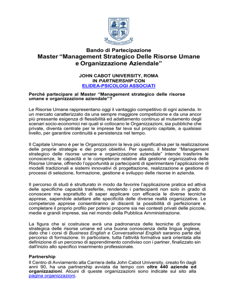Bando di Partecipazione Master “Management Strategico Delle Risorse Umane e Organizzazione Aziendale” JOHN CABOT UNIVERSITY, ROMA IN PARTNERSHIP CON ELIDEA-PSICOLOGI ASSOCIATI Perché partecipare al Master “Management strategico delle risorse umane e organizzazione aziendale”? Le Risorse Umane rappresentano oggi il vantaggio competitivo di ogni azienda. In un mercato caratterizzato da una sempre maggiore competizione e da una ancor più pressante esigenza di flessibilità ed adattamento continuo al mutamento degli scenari socio-economici nei quali si collocano le Organizzazioni, sia pubbliche che private, diventa centrale per le imprese far leva sul proprio capitale, a qualsiasi livello, per garantire continuità e persistenza nel tempo. Il Capitale Umano è per le Organizzazioni la leva più significativa per la realizzazione delle proprie strategie e dei propri obiettivi. Per questo, il Master “Management strategico delle risorse umane e organizzazione aziendale” intende trasferire le conoscenze, le capacità e le competenze relative alla gestione organizzativa delle Risorse Umane, offrendo l’opportunità ai partecipanti di sperimentare l’applicazione di modelli tradizionali e sistemi innovativi di progettazione, realizzazione e gestione di processi di selezione, formazione, gestione e sviluppo delle risorse in azienda. Il percorso di studi è strutturato in modo da favorire l’applicazione pratica ed attiva delle specifiche capacità trasferite, rendendo i partecipanti non solo in grado di conoscere ma soprattutto di saper applicare con efficacia le diverse tecniche apprese, sapendole adattare alle specificità delle diverse realtà organizzative. Le competenze apprese consentiranno ai discenti la possibilità di perfezionare e completare il proprio profilo per potersi proporre sia nei contesti privati delle piccole, medie e grandi imprese, sia nel mondo della Pubblica Amministrazione. La figura che si costruisce avrà una padronanza delle tecniche di gestione strategica delle risorse umane ed una buona conoscenza della lingua inglese, dato che i corsi di Business English e Conversational English saranno parte del percorso di formazione. In particolare, tutta l'attività formativa sarà orientata alla definizione di un percorso di apprendimento condiviso con i partner, finalizzato sin dall'inizio allo specifico inserimento professionale. Partnership Il Centro di Avviamento alla Carriera della John Cabot University, creato fin dagli anni 90, ha una partnership avviata da tempo con oltre 440 aziende ed organizzazioni. Alcuni di queste organizzazioni sono indicate sul sito alla pagina organizzazioni. Percorso di studio e crediti formativi Il percorso di studio, del Master “Management strategico delle risorse umane ed organizzazione aziendale” si articola nelle seguenti aree tematiche: - L’organizzazione e la gestione delle risorse umane Il processo di recruitment e selezione Le risorse umane in un contesto internazionale La gestione strategica e integrata delle risorse umane La valutazione della performance e del potenziale Lo sviluppo delle competenze La sicurezza sul lavoro L’amministrazione del personale e gli incentivi Le relazioni interne L’orientamento al lavoro International Business English Conversational English English Grammar Il percorso erogherà 60 crediti formativi. Programmazione e durata Il Master avrà inizio nel mese di febbraio 2017 e terminerà a dicembre 2017. La durata del Corso di alta formazione sarà quindi di 10 mesi e si svilupperà in oltre 400 ore di lezioni frontali, testimonianze aziendali, a cui si aggiungeranno le ore per le esercitazioni individuali e di gruppo, i project-work e le ore di stage ed esperienza in azienda. L’obbligo di frequenza è pari al 90% sia per le lezioni in aula che per le ore di lavoro in azienda. Le attività svolte presso le aziende ospitanti potranno essere programmate con differenti tempistiche e frequenze, compatibilmente con le esigenze operative delle singole imprese. Metodologie didattiche Il monte ore complessivo previsto sarà distribuito tra lezioni frontali, seminari tematici, esperienze pratiche guidate, moduli in autoapprendimento e stage. Il Master si baserà su metodologie didattiche attive ed esperienziali, avvalendosi di docenti esperti in approcci di tipo partecipativo e interattivo. Si farà largo uso di casi aziendali, di role- play e simulazioni, così come di testimonianze su esperienze. Inoltre, un caposaldo della formula del Master saranno i workshop aziendali e le testimonianze in aula da parte di manager e professionisti, come momenti applicativi in specifici contesti operativi delle idee discusse in aula. Assistenza e tutorship L’assistenza e tutorship sarà garantita: • Si prevede la presenza di un tutor in aula durante tutte le ore previste in aula; • Per le rimanenti ore del Master, le aziende partner dedicheranno ciascuna un proprio tutor interno a disposizione dei partecipanti durante le attività formative svolte in azienda e/o dal personale aziendale, nonché in fase di stage. Materiale didattico Ad ogni partecipante verrà consegnato, in relazione ad ogni modulo di lavoro in aula, materiale didattico corredato da casi pratici, necessario per il completamento e l'approfondimento della formazione. I lavori di progetto, elaborati secondo le modalità specificate, e successivamente presentati in aula da parte di ciascun partecipante, verranno valutati da una apposita Commissione, composta da docenti e da rappresentanti di imprese operanti nel settore, nominata dalla Direzione del Master. A conclusione del corso, a tutti gli allievi che avranno regolarmente portato a termine l'attività formativa e presentato in aula il lavoro di progetto e superato con esito positivo l’esame finale, sarà consegnato il Certificato del Master “Management strategico delle risorse umane e organizzazione aziendale.” Sede didattica e dotazioni Il Master si svolgerà presso la sede 