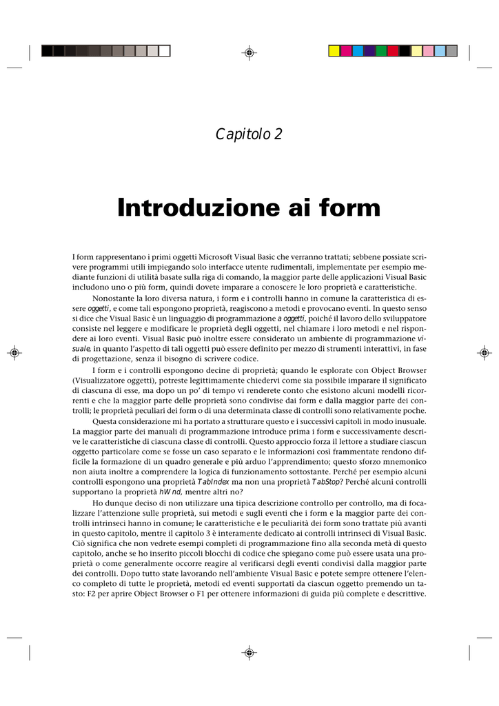 La maggior parte dei manuali di programmazione introduce prima i form e successivamente descrive le caratteristiche di ciascuna classe di controlli. Questo approccio forza il lettore a studiare ciascun
