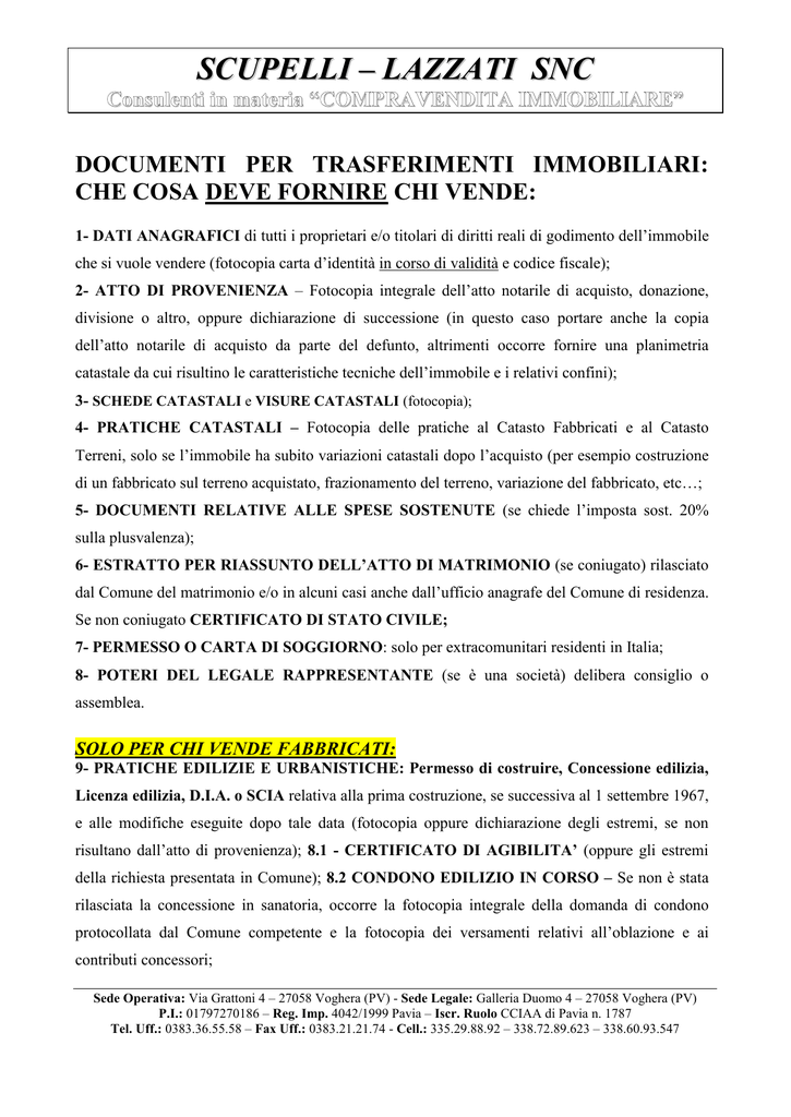 S CU P EL L I – L AZ Z A T I S N C Consulenti in materia “COMPRAVENDITA IMMOBILIARE” DOCUMENTI PER TRASFERIMENTI IMMOBILIARI: CHE COSA DEVE FORNIRE CHI VENDE: 1- DATI ANAGRAFICI di tutti i proprietari e/o titolari di diritti reali di godimento dell’immobile che si vuole vendere (fotocopia carta d’identità in corso di validità e codice fiscale); 2- ATTO DI PROVENIENZA – Fotocopia integrale dell’atto notarile di acquisto, donazione, divisione o altro, oppure dichiarazione di successione (in questo caso portare anche la copia dell’atto notarile di acquisto da parte del defunto, altrimenti occorre fornire una planimetria catastale da cui risultino le caratteristiche tecniche dell’immobile e i relativi confini); 3- SCHEDE CATASTALI e VISURE CATASTALI (fotocopia); 4- PRATICHE CATASTALI – Fotocopia delle pratiche al Catasto Fabbricati e al Catasto Terreni, solo se l’immobile ha subito variazioni catastali dopo l’acquisto (per esempio costruzione di un fabbricato sul terreno acquistato, frazionamento del terreno, variazione del fabbricato, etc…; 5- DOCUMENTI RELATIVE ALLE SPESE SOSTENUTE (se chiede l’imposta sost. 20% sulla plusvalenza); 6- ESTRATTO PER RIASSUNTO DELL’ATTO DI MATRIMONIO (se coniugato) rilasciato dal Comune del matrimonio e/o in alcuni casi anche dall’ufficio anagrafe del Comune di residenza. Se non coniugato CERTIFICATO DI STATO CIVILE; 7- PERMESSO O CARTA DI SOGGIORNO: solo per extracomunitari residenti in Italia; 8- POTERI DEL LEGALE RAPPRESENTANTE (se è una società) delibera consiglio o assemblea. SOLO PER CHI VENDE FABBRICATI: 9- PRATICHE EDILIZIE E URBANISTICHE: Permesso di costruire, Concessione edilizia, Licenza edilizia, D.I.A. o SCIA relativa alla prima costruzione, se successiva al 1 settembre 1967, e alle modifiche eseguite dopo tale data (fotocopia oppure dichiarazione degli estremi, se non risultano dall’atto di provenienza); 8.1 - CERTIFICATO DI AGIBILITA’ (oppure gli estremi della richiesta presentata in Comune); 8.2 CONDONO EDILIZIO IN CORSO – Se non è stata rilasciata la concessione in sanatoria, occorre la fotocopia integrale della domanda di condono protocollata dal Comune competente e la fotocopia dei versamenti relativi all’oblazione e ai contributi concessori; Sede Operativa: Via Grattoni 4 – 27058 Voghera (PV) - Sede Legale: Galleria Duomo 4 – 27058 Voghera (PV) P.I.: 01797270186 – Reg. Imp. 4042/1999 Pavia – Iscr. Ruolo CCIAA di Pavia n. 1787 Tel. Uff.: 0383.36.55.58 – Fax Uff.: 0383.21.21.74 - Cell.: 335.29.88.92 – 338.72.89.623 – 338.60.93.547 S CU P EL L I – L AZ Z A T I S N C Consulenti in materia “COMPRAVENDITA IMMOBILIARE” 10- CERTIFICAZIONE ENERGETICA: La proprietà dell’immobile deve produrre la “Certificazione Energetica” dell’immobile di cui si vuole promuovere o pubblicizzare la vendita o la locazione. A partire dal primo Gennaio 2012, come disposto dalla DGR n. IX / 2555 del 24/11/2011, in tutti gli annunci economici e pubblicitari che verranno pubblicati su giornali e riviste ( anche quelli gratuiti), su manifesti, volantini, cartelloni e striscioni di ogni genere, sui siti web o negli annunci radio e televisivi, dovrà essere dichiarata la classe energetica e le prestazioni energetiche dell'edificio; si rende pertanto obbligatoria la Certificazione Energetica dell'immobile o della porzione di immobile di cui si vuole promuovere o pubblicizzare la vendita o la locazione. Le sanzioni sono consistendi, si va da un minimo di 1.000 Euro ad un massimo di 5.000 Euro per ogni singolo annuncio. 11- EVENTUALI REQUISITI PREVISTE DALLE NORME IVA; 12- DICHIARAZIONE DI UN GEOMETRA (O ARCHITETTO O INGEGNERE EDILE): che attesti l’adeguata corrispondenza tra i dati nonché le schede catastali da un lato e lo stato attuale del fabbricato oggetto di vendita dall’altro. Inoltre si richiede al Geometra incaricato una relazione puntuale di tipo “edilizio-urbanistico” (es. l’elenco dei documenti presentati in Comune: concessione edilizia, licenza edilizia, D.I.A. o SCIA, dichiarazione fine lavori, certificato di agibilità, eventuali “permessi di costruire in sanatoria”, etc……). Dall’anno 2010 spesso in Notai non stipulano l’atto di compravendita se non sono in possesso di tale dichiarazione o, in alternativa e in alcuni casi, una più completa relazione tecnica. La motivazione di questo “modus operandi” adottato da molti notai è la seguente: la normativa vigente prevede che se si stipula un atto di compravendita immobiliare e non c’è esatta corrispondenza tra i dati catastali e l’immobile oggetto di vendita, tale atto è NULLO con conseguenze che possono rivelarsi molto gravi ed onerose (art. 29, comma 1-bis, della legge 27 febbraio 1985 n. 52, introdotto dall’art. 19, comma 14, del decreto legge 31 maggio 2010, n. 78, come risultante dalla legge di conversione 30 luglio 2010, n. 122). SEGUE PAGINA Sede Operativa: Via Grattoni 4 – 27058 Voghera (PV) - Sede Legale: Galleria Duomo 4 – 27058 Voghera (PV) P.I.: 01797270186 – Reg. Imp. 4042/1999 Pavia – Iscr. Ruolo CCIAA di Pavia n. 1787 Tel. Uff.: 0383.36.55.58 – Fax Uff.: 0383.21.21.74 - Cell.: 335.29.88.92 – 338.72.89.623 – 338.60.93.547 S CU P EL L I – L AZ Z A T I S N C Consulenti in materia “COMPRAVENDITA IMMOBILIARE” SOLO PER CHI VENDE FABBRICATI IN COMPLESSI CONDOMINIALI: 13- SPESE CONDOMINIALI ORDINARIE: prospetto analitico spesso rilasciato dall’amministratore di condominio relativamente alle spese ordinarie: due i documenti richiesti: 1 – Bilancio di previsione esercizio/ anno in corso; 2 – Bilancio Consuntivo esercizio/anno appena trascorso. 14- SPESE CONDOMINIALI STRAORDINARIE: copia degli ultimi verbali dell’assemblea di condominio; evidenziare le spese straordinarie eventualmente già deliberate dall’assemblea di condominio; 15- REGOLAMENTO DI CONDOMINIO: copia del regolamento di condominio. SOLO PER CHI VENDE TERRENI:_ 16- CERTIFICATO DI DESTINAZIONE URBANISTICA rilas