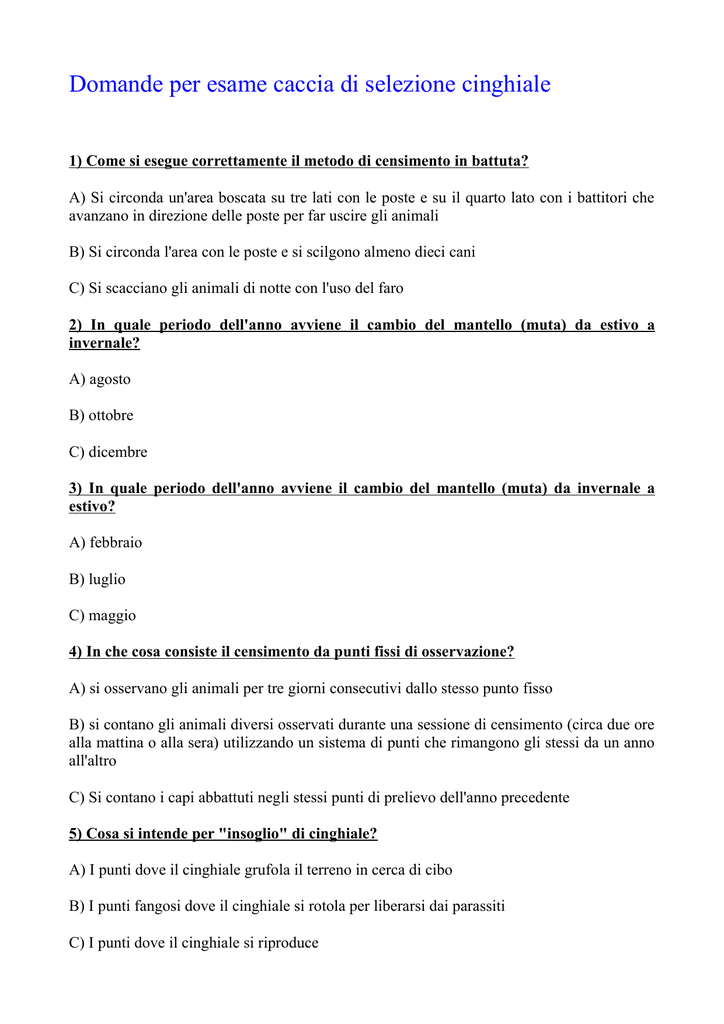 Domande per esame caccia di selezione cinghiale 1) Come si esegue correttamente il metodo di censimento in battuta? A) Si circonda un'area boscata su tre lati con le poste e su il quarto lato con i battitori che avanzano in direzione delle poste per far uscire gli animali B) Si circonda l'area con le poste e si scilgono almeno dieci cani C) Si scacciano gli animali di notte con l'uso del faro 2) In quale periodo dell'anno avviene il cambio del mantello (muta) da estivo a invernale? A) agosto B) ottobre C) dicembre 3) In quale periodo dell'anno avviene il cambio del mantello (muta) da invernale a estivo? A) febbraio B) luglio C) maggio 4) In che cosa consiste il censimento da punti fissi di osservazione? A) si osservano gli animali per tre giorni consecutivi dallo stesso punto fisso B) si contano gli animali diversi osservati durante una sessione di censimento (circa due ore alla mattina o alla sera) utilizzando un sistema di punti che rimangono gli stessi da un anno all'altro C) Si contano i capi abbattuti negli stessi punti di prelievo dell'anno precedente 5) Cosa si intende per "insoglio" di cinghiale? A) I punti dove il cinghiale grufola il terreno in cerca di cibo B) I punti fangosi dove il cinghiale si rotola per liberarsi dai parassiti C) I punti dove il cinghiale si riproduce 6) Cosa si intende per "grattatoio" di cinghiale A) I punti, in genere tronchi di alberi o rocce, dove i cinghiali si strofinano dopo l'insoglio per liberarsi dai parassiti B) I punti dove il cinghilae gratta il terreno in cerca di cibo C) i punti rocciosi dove il cinghiale si rifugia per proteggersi dalle intemperie 7) Cosa sono le "lestre" delle scrofe? A) Lastre di pietra sotto le quali le scofe si rifugiano per proteggersi dalle intemperie B) Il periodo riproduttivo delle femmine di cinghiale C) Una depressione del terreno riempita di vegetazione (foglie erba felci) dove la scrofa partorisce i piccoli 8) Di cosa si alimenta prevalentemente il cinghiale? A) Erbe, frutti forestali, colture agricole B) Vermi ed insetti C) Prede animali e carcasse 9) Cosa si intende per "grufolate" dei cinghiali? A) Il verso di richiamo della femmina per richiamare i piccoli B) I siti dove la femmina partoricse i piccoli C) Gli scavi del terreno fatti dai cinghiali in cerca di cibo 10) Cosa si intende per "aree di rimessa" dei cinghiali? A) Aree ristrette con vegetazione molto fitta dove i cinghiali si rifugiano soprattutto nelle ore diurne B) Aree dove i cinghiali si alimentano prevalentemente nelle ore notturne C) Aree dove si radunano i capi abbattuti dopo l'abbattimento in braccata 11) In ambiente appenninico quale è il principale predatore naturale del cinghiale? A) Aquila reale B) Volpe C) Lupo 12) Verso quali specie di selvaggina il cinghiale si può comportare da predatore? A) Cervo e muflone B) Fasianidi C) Corvidi 13) Quale dei seguenti fattori influisce positivamente sull'incremento di una popolazione di cinghiale? A) Annate di abbondante produzione di ghiande castagne e faggiole B) Primavere piovose C) Inverni nevosi 14) Quali soggetti di cinghiale sono prevalentamente predati dalle volpi? A) striati B) anziani C) rossi 15) quali soggetti di cinghiale sono prevalentemente predati dal lupo? A) Anziani B) femmine gravide C) piccoli sotto l'anno 16) Cosa sono le "difese" nei cinghiali? A) atteggiamento aggressivo verso i predatori o cani B) Il canino inferiore dei soggetti adulti C) I combattimenti fra verri per la conquista delle femmine 17) Cosa sono i "coti" nei cinghiali? A) L'apparato digerente dei cinghiali B) Gli zoccoli anteriori C) Il canino superiore dei soggetti adulti 18) Quanto dura il periodo dell'allattamento dei piccoli di cinghiale? A) 1 mese B) 3/4 mesi C) 12 mesi 19) Cosa si intende per densità biotica del cinghiale? A) La densità di cinghiali che un determinato ambiente è in grado di sostenere B) La densità compatibile con le attività agricole C) Il numero dei soggetti malati nella popolazione di cinghiali 20) Come si riconoscono le orme dei cinghiali dagli altri ungulati? A) nelle orme dei cinghiali sono spesso visibili anche gli "speroni" o "guardie" (secondo e quinto dito) B) nelle orme dei cinghiali sono esclusivamente visibili i due zoccoli principali (terzo e quarto dito) C) il cinghiale ha sempre un andamento al galoppo 21) Quale senso è più sviluppato nel cinghiale e negli altri ungulati selvatici? A) La vista B) L’udito C) L’olfatto 22) Quale comportamento è più sbagliato se vogliamo che il cinghiale non percepisca la nostra presenza? A) Indossare abiti colorati B) Fumare con il vento che proviene dalle nostre spalle C) Rimanere immobili anche se in vista 23) Riguardo al censimento in battuta, quale di queste affermazioni è sbagliata? A) Vengono utilizzati battitori e poste B) E’ adatto per censire grandi superfici con poco personale C) E’ utilizzato per censire le aree boscate 24 Quale è la percentuale di bosco che deve essere censita con il censimento in battuta per ottenere risultati validi? A) Il 10% circa B) Il 50% circa C) Almeno il 2% 25) Il censimento notturno con il faro: A) Si utilizza di norma per ottenere la consistenza di una popolazione di cinghiali B) Si utilizza di norma per ricavare un indice di abbondanza o di densità relativa C) Si utilizza prevalentemente per effettuare la caccia di notte in ambienti boscati 26) Per l’identificazione della specie animale osservato nel censimento notturno con il faro, è utile osservare: A) La reazione dell’animale al fascio di luce B) Il colore dello specchio anale C) Il colore della pupilla illuminata 27) Quale metodo di censimento, tra i seguenti, permette di fornire la migliore indicazione sia della consistenza che della struttura della popolazione di cinghiale? A) Censimento dalle impronte B) Indice di Lincoln C) Censimento da punti fissi di osservazione 28) L’aumento del peso medio dei capi abbattuti, suddivisi per classi di sesso ed età, quale indicazione può dare? A) Può indicare che la popolazione 
