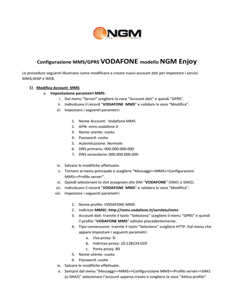 Configurazione MMS/GPRS VODAFONE modello NGM Enjoy Le procedure seguenti illustrano come modificare e creare nuovi account dati per impostare i servizi MMS,WAP e WEB. 1) Modifica Account MMS a. Impostazione parametri MMS: i. Dal menu “Servizi” scegliere la voce “Account dati” e quindi “GPRS”. ii. Individuare il record “VODAFONE MMS” e validare la voce “Modifica”. iii. Impostare i seguenti parametri: 1. 2. 3. 4. 5. 6. 7. Nome Account: Vodafone MMS APN: mms.vodafone.it Nome utente: vuoto Password: vuoto Autenticazione: Normale DNS primario: 000.000.000.000 DNS secondario: 000.000.000.000 iv. Salvare le modifiche effettuate. v. Tornare al menu principale e scegliere “Messaggi>>MMS>>Configurazioni MMS>>Profilo server”. vi. Quindi selezionare lo slot assegnato alla SIM “VODAFONE” (SIM1 o SIM2). vii. Individuare il record “VODAFONE MMS” e validare la voce “Modifica”. viii. Impostare i seguenti parametri: 1. Nome profilo: VODAFONE MMS 2. Indirizzo MMSC: http://mms.vodafone.it/servlets/mms 3. Account dati: tramite il tasto “Seleziona” scegliere il menu “GPRS” e quindi il profilo “VODAFONE MMS” editato precedentemente. 4. Tipo connessione: tramite il tasto “Seleziona” scegliere HTTP. Dal menu che appare impostare i seguenti parametri: a. Usa proxy: Sì b. Indirizzo proxy: 10.128224.010 c. Porta proxy: 80 5. Nome utente: vuoto 6. Password: vuoto ix. Salvare le modifiche effettuate. x. Sempre dal menu “Messaggi>>MMS>>Configurazione MMS>>Profilo server>>SIM1 (o SIM2)” selezionare l’account appena creato e scegliere la voce “Attiva profilo”. b. Impostazione parametri WEB: i. Dal menu “Servizi” scegliere la voce “Account dati” e quindi “GPRS”. ii. Individuare il record “VODAFONE WEB” e validare la voce “Modifica”. iii. Impostare i seguenti parametri: 1. 2. 3. 4. 5. 6. 7. Nome Account: Vodafone Web APN: web.omnitel.it Nome utente: vuoto Password: vuoto Autenticazione: Normale DNS primario: 000.000.000.000 DNS secondario: 000.000.000.000 iv. Salvare le modifiche effettuate. c. Impostazione parametri WAP: i. Dal menu “Servizi” scegliere la voce “Account dati” e quindi “GPRS”. ii. Individuare il record “VODAFONE WAP” e validare la voce “Modifica”. iii. Impostare i seguenti parametri: 1. 2. 3. 4. 5. 6. 7. 8. 9. 10. Nome Account:VODAFONE WAP APN: wap.omnitel.it Nome utente: vuoto Password: vuoto Autenticazione: Normale Indirizzo proxy: 10.128.201.76 Porta proxy: 80 Home Page: http://wap.omnitel.it DNS primario: 000.000.000.000 DNS secondario: 000.000.000.000 iv. Dal menu “Servizi>>Wap>>Impostazioni>>Profili”>> SIM1 (o SIM2) Selezionare il profilo e attivarlo 2) Creazione nuovo Account a. Impostazione parametri MMS: i. Dal menu “Servizi” scegliere la voce “Account dati” e quindi “GPRS”. ii. Selezionare un record disponibile e validare la voce “Modifica”. iii. Seguire quindi i passi da 1)a.iii a 1)a.vi iv. Scegliere la voce “Aggiungi nuovo” v. Seguire quindi i passi da 1)a.viii fino a 1)a.x b. Impostazione parametri WEB: i. Dal menu “Servizi” scegliere la voce “Account dati” e quindi “GPRS”. ii. Selezionare un record disponibile e validare la voce “Modifica”. iii. Seguire quindi i passi da 1)b.iii a 1)b.iv c. Impostazione parametri WAP: i. Dal menu “Servizi” scegliere la voce “Account dati” e quindi “GPRS”. ii. Selezionare un record disponibile e validare la voce “Modifica”. iii. Seguire quindi i passi da 1)c.iii a 1)c.iv.