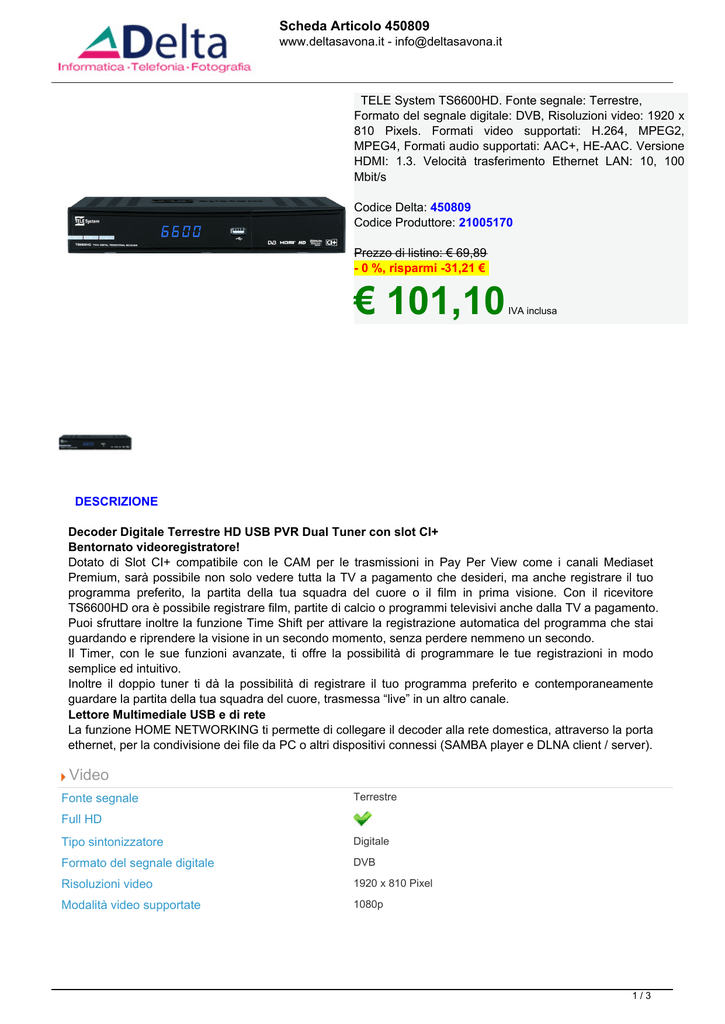 Scheda Articolo 450809 www.deltasavona.it - [email protected] TELE System TS6600HD. Fonte segnale: Terrestre, Formato del segnale digitale: DVB, Risoluzioni video: 1920 x 810 Pixels. Formati video supportati: H.264, MPEG2, MPEG4, Formati audio supportati: AAC+, HE-AAC. Versione HDMI: 1.3. Velocità trasferimento Ethernet LAN: 10, 100 Mbit/s Codice Delta: 450809 Codice Produttore: 21005170 Prezzo di listino: € 69,89 - 0 %, risparmi -31,21 € € 101,10 IVA inclusa DESCRIZIONE Decoder Digitale Terrestre HD USB PVR Dual Tuner con slot CI+ Bentornato videoregistratore! Dotato di Slot CI+ compatibile con le CAM per le trasmissioni in Pay Per View come i canali Mediaset Premium, sarà possibile non solo vedere tutta la TV a pagamento che desideri, ma anche registrare il tuo programma preferito, la partita della tua squadra del cuore o il film in prima visione. Con il ricevitore TS6600HD ora è possibile registrare film, partite di calcio o programmi televisivi anche dalla TV a pagamento. Puoi sfruttare inoltre la funzione Time Shift per attivare la registrazione automatica del programma che stai guardando e riprendere la visione in un secondo momento, senza perdere nemmeno un secondo. Il Timer, con le sue funzioni avanzate, ti offre la possibilità di programmare le tue registrazioni in modo semplice ed intuitivo. Inoltre il doppio tuner ti dà la possibilità di registrare il tuo programma preferito e contemporaneamente guardare la partita della tua squadra del cuore, trasmessa “live” in un altro canale. Lettore Multimediale USB e di rete La funzione HOME NETWORKING ti permette di collegare il decoder alla rete domestica, attraverso la porta ethernet, per la condivisione dei file da PC o altri dispositivi connessi (SAMBA player e DLNA client / server). Video Fonte segnale Terrestre Full HD Tipo sintonizzatore Digitale Formato del segnale digitale DVB Risoluzioni video 1920 x 810 Pixel Modalità video supportate 1080p 1/3 Scheda Articolo 450809 www.deltasavona.it - [email protected] Formati del file Formati video supportati H.264,MPEG2,MPEG4 Formati audio supportati AAC+,HE-AAC Unità rigida Disco rigido integrato Connettività Quantità porte HDMI 1 Quantità porte USB 2.0 1 Numero prese Scart 1 Uscita audio digitale coassiale 1 Quantità porte Ethernet LAN (RJ-45) 1 Porta uscita S/PDIF Versione HDMI 1.3 Collegamento in rete Collegamento ethernet LAN Wi-Fi Velocità trasferimento Ethernet LAN 10,100 Mbit/s Dettagli tecnici Colore del prodotto Nero Electronic Programme Guide (EPG) Telecomando portatile HDCP Formato audio integrato Dolby Digital,Dolby Digital Plus Timeshift Timer/promemoria On Screen Display (OSD) Teletext Funzione Televideo Contenuto dell'imballo Manuale dell'utente Batterie incluse 2/3 Scheda Articolo 450809 www.deltasavona.it - [email protected] Vienici a trovare nel nostro nuovo Showroom! ORARI PUNTO VENDITA Lunedì dalle 10 alle 12:30 e dalle 15 alle 19 dal martedì al sabato dalle 8:30 alle 12:30 e dalle 15 alle 19 Domenica riposo Delta Informatica Via Alle Cave 9R (Zona Parco Doria) 17100 Savona Telefono: +39 019 4500771 Fax +39 019 4502241 Email [email protected] 3/3 Powered by TCPDF (www.tcpdf.org)