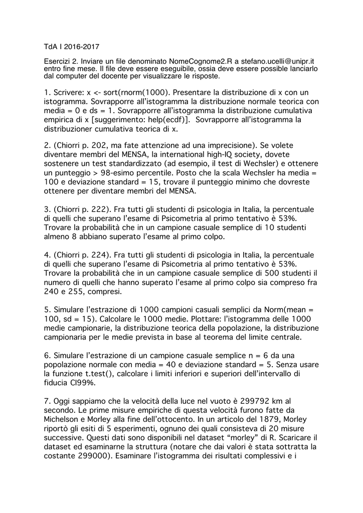 TdA I 2016-2017 Esercizi 2. Inviare un file denominato NomeCognome2.R a [email protected] entro fine mese. Il file deve essere eseguibile, ossia deve essere possible lanciarlo dal computer del docente per visualizzare le risposte. 1. Scrivere: x <- sort(rnorm(1000). Presentare la distribuzione di x con un istogramma. Sovrapporre all’istogramma la distribuzione normale teorica con media = 0 e ds = 1. Sovrapporre all’istogramma la distribuzione cumulativa empirica di x [suggerimento: help(ecdf)]. Sovrapporre all’istogramma la distribuzioner cumulativa teorica di x. 2. (Chiorri p. 202, ma fate attenzione ad una imprecisione). Se volete diventare membri del MENSA, la international high-IQ society, dovete sostenere un test standardizzato (ad esempio, il test di Wechsler) e ottenere un punteggio > 98-esimo percentile. Posto che la scala Wechsler ha media = 100 e deviazione standard = 15, trovare il punteggio minimo che dovreste ottenere per diventare membri del MENSA. 3. (Chiorri p. 222). Fra tutti gli studenti di psicologia in Italia, la percentuale di quelli che superano l’esame di Psicometria al primo tentativo è 53%. Trovare la probabilità che in un campione casuale semplice di 10 studenti almeno 8 abbiano superato l’esame al primo colpo. 4. (Chiorri p. 224). Fra tutti gli studenti di psicologia in Italia, la percentuale di quelli che superano l’esame di Psicometria al primo tentativo è 53%. Trovare la probabilità che in un campione casuale semplice di 500 studenti il numero di quelli che hanno superato l’esame al primo colpo sia compreso fra 240 e 255, compresi. 5. Simulare l’estrazione di 1000 campioni casuali semplici da Norm(mean = 100, sd = 15). Calcolare le 1000 medie. Plottare: l’istogramma delle 1000 medie campionarie, la distribuzione teorica della popolazione, la distribuzione campionaria per le medie prevista in base al teorema del limite centrale. 6. Simulare l’estrazione di un campione casuale semplice n = 6 da una popolazione normale con media = 40 e deviazione standard = 5. Senza usare la funzione t.test(), calcolare i limiti inferiori e superiori dell’intervallo di fiducia CI99%. 7. Oggi sappiamo che la velocità della luce nel vuoto è 299792 km al secondo. Le prime misure empiriche di questa velocità furono fatte da Michelson e Morley alla fine dell’ottocento. In un articolo del 1879, Morley riportò gli esiti di 5 esperimenti, ognuno dei quali consisteva di 20 misure successive. Questi dati sono disponibili nel dataset “morley” di R. Scaricare il dataset ed esaminarne la struttura (notare che dai valori è stata sottratta la costante 299000). Esaminare l’istogramma dei risultati complessivi e i cinque box-plot in funzione dell’esperimento. Quanto sono precise le misure di Morley? Sono accurate o sembra esserci un errore sistematico? A partire dal campione di Morley, costruire un intervallo di fiducia CI95% per stimare la velocità della luce. Ripetere per ogni esperimento separatamente. Quali conclusioni potete trarre? 8. Scaricate il dataset “nlschools” (discusso anche in classe). Plottate il punteggio nel test linguistico in funzione dello status socio-economico. Fittate un modello lineare e stimate la pendenza della retta. Sembra esserci un effetto dello status socio-economico sulla competenza linguistica? Se sì come potete quantificarlo? Calcolate l’intervallo di fiducia CI95% attorno alla pendenza e valutate se la pendenza media è diversa da zero. 9. Caricare il dataset PlantGrowth dal package preinstallato datasets. Esaminare la struttura dei dati. Riassumere con un grafico le distribuzioni del peso nelle tre condizioni. Riassumerle con i corrispondenti 5-number summary. Stimare la media delle popolazioni da cui sono stati estratti i tre campioni di misure e costruire i relativi intervalli di fiducia al 95%. Interpretare il risultato: si è verificata una crescita delle piante? la crescita è maggiore nei gruppi trattati rispetto al controllo? Effettuare due test t di Student per confrontare la media del primo trattamento e la media del secondo trattamento con il controllo. Confrontare con gli intervalli di fiducia. 10. Vi invitano a giocare a dadi ma sospettate che il dado sia truccato. Il vettore sotto rappresenta trenta lanci; in base a queste osservazioni stimare la probabilità che esca il sei. [1] 6 6 2 6 4 1 2 2 5 1 6 4 6 6 5 4 5 6 6 4 6 5 6 3 4 6 6 2 6 6 Effettuare un test dell’ipotesi nulla p(6) = p(tutte le altre facce) = 1/6. Potete concludere che il dado è truccato?
