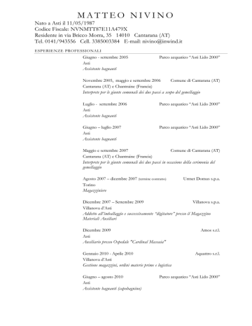 MATTEO NIVINO Nato a Asti il 11/05/1987 Codice Fiscale: NVNMTT87E11A479X Residente in via Bricco Morra, 35 14010 Cantarana (AT) Tel. 0141/943556 Cell. 3385003384 E-mail: [email protected] ESPERIENZE PROFESSIONALI Giugno - settembre 2005 Asti Assistente bagnanti Parco acquatico “Asti Lido 2000” Novembre 2005, maggio e settembre 2006 Comune di Cantarana (AT) Cantarana (AT) e Chantraine (Francia) Interprete per le giunte comunali dei due paesi a scopo del gemellaggio Luglio - settembre 2006 Asti Assistente bagnanti Parco acquatico “Asti Lido 2000” Giugno – luglio 2007 Asti Assistente bagnanti Parco acquatico “Asti Lido 2000” Maggio e settembre 2007 Comune di Cantarana (AT) Cantarana (AT) e Chantraine (Francia) Interprete per le giunte comunali dei due paesi in occasione della cerimonia del gemellaggio Agosto 2007 – dicembre 2007 (termine contratto) Torino Magazziniere Urmet Domus s.p.a. Dicembre 2007 – Settembre 2009 Villanova s.p.a. Villanova d’Asti Addetto all’imballaggio e successivamente “digitatore” presso il Magazzino Materiali Ausiliari Dicembre 2009 Asti Ausiliario presso Ospedale "Cardinal Massaia" Gennaio 2010 - Aprile 2010 Villanova d’Asti Gestione magazzini, ordini materie prime e logistica Giugno – agosto 2010 Asti Assistente bagnanti (capobagnino) Amos s.r.l. Aquattro s.r.l. Parco acquatico “Asti Lido 2000” ISTRUZIONE 2001-2006 Istituto Magistrale Statale “Augusto Monti” Diploma di Liceo Linguistico Votazione 92/100 Lingue studiate: francese, inglese e tedesco Asti Maggio 2003 Partecipazione al corso e conseguimento del brevetto di Assistente Bagnanti della Federazione Italiana Nuoto Giugno 2003 Conseguimento dell’esame per la lingua inglese KET con valutazione “Pass with Merit”, rilasciato da “University of Cambridge” 16/06/2004 Conseguimento dell’esame per la lingua francese “DELF scolaire niveau 1” con valutazione di 15,58/20, rilasciato dal “Centre culturel français” di Torino 18/04/2005 Conseguimento dell’esame per la lingua francese “DELF scolaire niveau 2” con valutazione di 15,50/20, rilasciato da “Centre d’Examen” di Torino Maggio 2006 Partecipazione al corso di preparazione e conseguimento dell’ultimo esame “DELF scolaire niveau 3” presso l’Istituto “A. Monti” di Asti con esito: 81,50/100 rilasciato da “Centre d’examen - Alliance française” di Cuneo Conseguimento dell’attestato di qualifica professionale per “Agente di turismo” presso l’A.P.I. (Associazione Piccole e medie Industrie) di Asti con valutazione di 86/100. Nell’ambito di tale corso: stage formativo della durata di un mese presso il tour operator “Vela tour” di Asti. PATENTE In possesso di patente tipo A, B e C Automunito In possesso di abilitazione alla guida di carrelli elevatori COMPETENZA INFORMATICA Ottima conoscenza del pacchetto Microsoft Office (Word, PowerPoint, Excel, FrontPage, Publisher e PhotoDraw) Molto buona conoscenza generica dell’ambiente hardware e software Conoscenza del programma IDEAL, applicativo gestione magazzini Urmet, JDEdwards e Gamma Enterprise Ottima conoscenza della navigazione in internet, gestione e-mail e realizzazione siti web amatoriali Consento al trattamento dei miei dati personali in ottemperanza al decreto legislativo 675/1996. Matteo Nivino