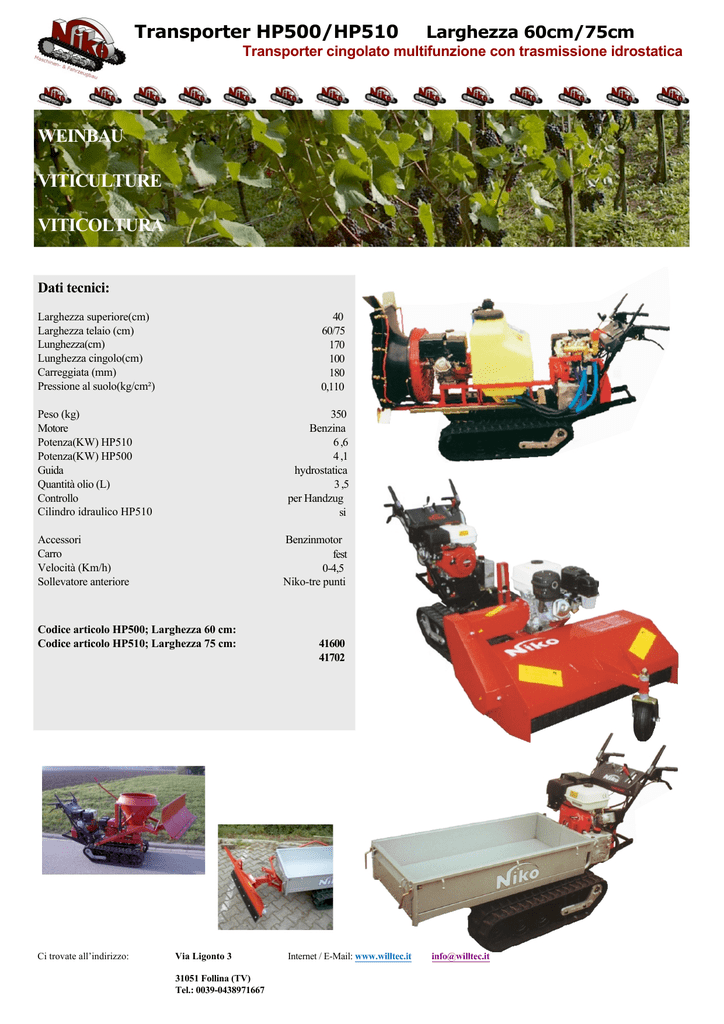 Transporter HP500/HP510 Larghezza 60cm/75cm Transporter cingolato multifunzione con trasmissione idrostatica WEINBAU VITICULTURE VITICOLTURA Dati tecnici: Larghezza superiore(cm) Larghezza telaio (cm) Lunghezza(cm) Lunghezza cingolo(cm) Carreggiata (mm) Pressione al suolo(kg/cm²) 40 60/75 170 100 180 0,110 Peso (kg) Motore Potenza(KW) HP510 Potenza(KW) HP500 Guida Quantità olio (L) Controllo Cilindro idraulico HP510 350 Benzina 6 ,6 4 ,1 hydrostatica 3 ,5 per Handzug si Accessori Carro Velocità (Km/h) Sollevatore anteriore Benzinmotor fest 0-4,5 Niko-tre punti Codice articolo HP500; Larghezza 60 cm: Codice articolo HP510; Larghezza 75 cm: Ci trovate all’indirizzo: Via Ligonto 3 31051 Follina (TV) Tel.: 0039-0438971667 41600 41702 Internet / E-Mail: www.willtec.it [email protected]
