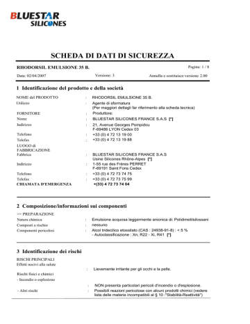 SCHEDA DI DATI DI SICUREZZA Pagina: 1 / 8 RHODORSIL EMULSIONE 35 B. Versione: 3 Data: 02/04/2007 Annulla e sostituisce versione 2.00 1 Identificazione del prodotto e della società NOME del PRODOTTO Utilizzo : RHODORSIL EMULSIONE 35 B. : Agente di sformatura (Per maggiori dettagli far riferimento alla scheda tecnica) FORNITORE Nome : : Produttore: BLUESTAR SILICONES FRANCE S.A.S [*] Indirizzo : Telefono : Telefax : 21, Avenue Georges Pompidou F-69486 LYON Cedex 03 +33 (0) 4 72 13 19 00 +33 (0) 4 72 13 19 88 LUOGO di FABBRICAZIONE Fabbrica : Indirizzo : Telefono Telefax CHIAMATA D'EMERGENZA : : BLUESTAR SILICONES FRANCE S.A.S Usine Silicones Rhône-Alpes [*] 1-55 rue des Frères PERRET F-69191 Saint Fons Cedex +33 (0) 4 72 73 74 75 +33 (0) 4 72 73 75 99 +(33) 4 72 73 74 04 2 Composizione/informazioni sui componenti >> PREPARAZIONE Natura chimica Composti a rischio Componenti pericolosi Emulsione acquosa leggermente anionica di: Polidimetilsilossani nessuno Alcol tridecilico etossilato (CAS : 24938-91-8) : < 5 % - Autoclassificazione : Xn; R22 - Xi, R41 [*] : : : 3 Identificazione dei rischi RISCHI PRINCIPALI Effetti nocivi alla salute Lievemente irritante per gli occhi e la pelle. : Rischi fisici e chimici - Incendio o esplosione - Altri rischi : : NON presenta particolari pericoli d'incendio o d'esplosione. Possibili reazioni pericolose con alcuni prodotti chimici (vedere lista delle materie incompatibili al § 10 :"Stabilità-Reattività") SCHEDA DI DATI DI SICUREZZA Pagina: 2/8 RHODORSIL EMULSIONE 35 B. Versione: 3 Data: 02/04/2007 Rischi specifici : Annulla e sostituisce versione 2.00 Questo prodotto non è classificato come "preparazione pericolosa" secondo i criteri CE. 4 Primi soccorsi Inalazione Contatto con la pelle : : Contatto con gli occhi : Ingestione : Altre informazioni : Non specificamente applicabile. [*] Togliere ogni vestito o scarpa contaminata. Lavare con acqua. In caso d'infiammazione (rossore, irritazione,..), consultare un medico. Mostrare questa scheda al medico. [*] Lavare con acqua corrente mantenendo le palpebre ben aperte. (almeno 15 minuti). [*] NON provocare assolutamente il vomito. Sciacquare la bocca con acqua. [*] Raccogliere i vestiti contaminati in un sacchetto chiuso ermeticamente per successiva decontaminazione. Utilizzare i dispositivi di protezione appropriati per trattare una persona contaminata. [*] 5 Mezzi di lotta anti-incendio Mezzi di estinzione - Addatti : - controindicati : Pericoli specifici : Metodi particolari d'intervento Protezione degli operatori : : Schiuma Polveri Anidride carbonica (CO2) Nessuno, a nostra conoscenza. In prossimità di un incendio, utilizzare mezzi di estinzione idonei. Combustibile dopo evaporazione dell'acqua Per maggiori informazioni vedere il § 10 :" Stabilità e reattività ". Raffreddare con acqua nebulizzata i contenitori esposti al calore. Apparecchio respiratorio isolante autonomo. 6 Misure in caso di dispersione accidentale Precauzioni individuali : Precauzioni per l'ambiente Sistemi di pulizia : Protezione individuale : - guanti in PVC Occhiali di sicurezza Non scaricare in fogna e nei fiumi. In caso di spandimento rilevante arginare per contenere il riversamento. SCHEDA DI DATI DI SICUREZZA Pagina: 3/8 RHODORSIL EMULSIONE 35 B. Versione: 3 Data: 02/04/2007 - Recuperi : - Neutralizzazione : - Pulizia/decontaminazione - Eliminazione : : Annulla e sostituisce versione 2.00 Recuperare il prodotto in un contenitore idoneo : - etichettato in modo adeguato - ben chiuso Conservare il prodotto recuperato per successiva eliminazione. Assorbire il liquido non recuperabile con : - della sabbia asciutta o un assorbente asciutto inerte Poi lavare il suolo con moltaacqua Fare incenerire il materiale contaminato in centri autorizzati. 7 Manipolazione e stoccaggio MANIPOLAZIONE Misure tecniche Precauzioni Consigli per l'uso STOCCAGGIO Misure tecniche : : : Ventilazione. Non superare i valori limite d'esposizione (VLE) Rispettare le condizioni d'uso. (Riferirsi al bollettino tecnico). : Prendere tutte le misure necessarie per evitare il riversamento accidentale del prodotto in fogne o corsi d'acqua, in caso di rottura dei contenitori o dei sistemi di travaso. Condizioni di stoccaggio - Raccomandate : - Controindicate : Sostanze incompatibili Condizioni d'imballaggio : : Per garantire la qualità e le proprietà del prodotto, conservare: - il contenitore ben chiuso. - al riparo dal gelo - a una temperatura non superiore a 30°C Possibile sviluppo di una contaminazione batterica, in caso di stoccaggio prolungato e/o in un contenitore pulito male o chiuso male Prodotti che reagiscono con l'acqua. -Contenitori di plastica Fusti di plastica Fusti in acciaio con rivestimento interno a base epossidica. Materiali d'imballaggio - Raccomandati : - Controindicati : Polietilene Acciai rivestiti Metalli non rivestiti SCHEDA DI DATI DI SICUREZZA Pagina: 4/8 RHODORSIL EMULSIONE 35 B. Versione: 3 Data: 02/04/2007 Annulla e sostituisce versione 2.00 8 Controllo dell'esposizione/protezione individuale Misure di carattere tecnico Procedure di controllo : : Assicurare una buona ventilazione del posto di lavoro Sorvegliare l'aria dell'ambiente utilizzando dosimetri/rivelatori adatti Protezioni individuali - Protezione respiratoria : - Protezione delle mani - Protezione degli occhi Misure collettive d'emergenza : : : Durante le polverizzazione portare : Apparecchio di protezione respiratoria con filtro anti-pulviscolo Se la ventilazione è adeguata, non è indispensabile indossare una maschera di protezione respiratoria Guanti di protezione in PVC Occhiali di sicurezza Fontana oculare Docce di sicurezza 9 Proprietà fisiche e chimiche ASPETTO - Stato fisico - Forma - Colore Odore pH Temperature caratteristiche - Indurimento - Ebollizione Caratteristiche di infiammabilità - Punto di infiammabilità Proprietà comburenti Pressione di vapore Peso specifico Solubilità - in acqua - nei solventi organici : : : Liquido : : viscoso bianco lattiginos