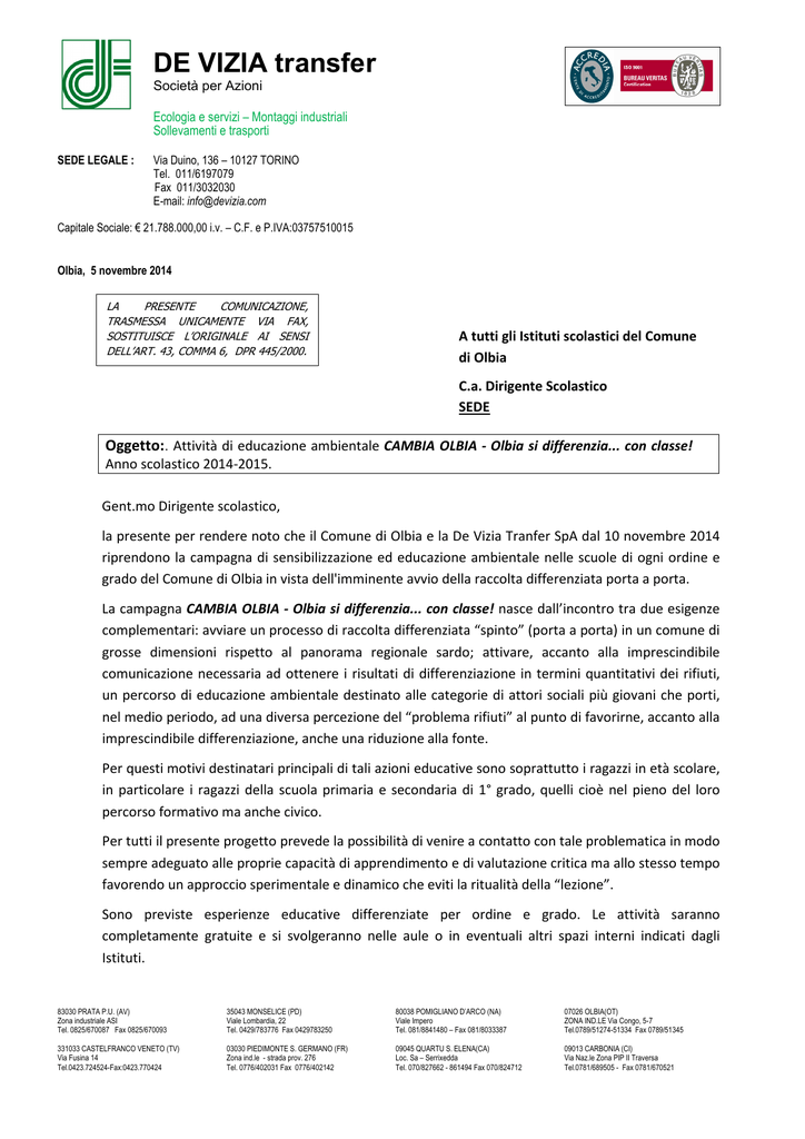 DE VIZIA transfer Società per Azioni Ecologia e servizi – Montaggi industriali Sollevamenti e trasporti SEDE LEGALE : Via Duino, 136 – 10127 TORINO Tel. 011/6197079 Fax 011/3032030 E-mail: [email protected] Capitale Sociale: € 21.788.000,00 i.v. – C.F. e P.IVA:03757510015 Olbia, 5 novembre 2014 LA PRESENTE COMUNICAZIONE, TRASMESSA UNICAMENTE VIA FAX, SOSTITUISCE L’ORIGINALE AI SENSI DELL’ART. 43, COMMA 6, DPR 445/2000. A tutti gli Istituti scolastici del Comune di Olbia C.a. Dirigente Scolastico SEDE Oggetto:. Attività di educazione ambientale CAMBIA OLBIA - Olbia si differenzia... con classe! Anno scolastico 2014-2015. Gent.mo Dirigente scolastico, la presente per rendere noto che il Comune di Olbia e la De Vizia Tranfer SpA dal 10 novembre 2014 riprendono la campagna di sensibilizzazione ed educazione ambientale nelle scuole di ogni ordine e grado del Comune di Olbia in vista dell'imminente avvio della raccolta differenziata porta a porta. La campagna CAMBIA OLBIA - Olbia si differenzia... con classe! nasce dall’incontro tra due esigenze complementari: avviare un processo di raccolta differenziata “spinto” (porta a porta) in un comune di grosse dimensioni rispetto al panorama regionale sardo; attivare, accanto alla imprescindibile comunicazione necessaria ad ottenere i risultati di differenziazione in termini quantitativi dei rifiuti, un percorso di educazione ambientale destinato alle categorie di attori sociali più giovani che porti, nel medio periodo, ad una diversa percezione del “problema rifiuti” al punto di favorirne, accanto alla imprescindibile differenziazione, anche una riduzione alla fonte. Per questi motivi destinatari principali di tali azioni educative sono soprattutto i ragazzi in età scolare, in particolare i ragazzi della scuola primaria e secondaria di 1° grado, quelli cioè nel pieno del loro percorso formativo ma anche civico. Per tutti il presente progetto prevede la possibilità di venire a contatto con tale problematica in modo sempre adeguato alle proprie capacità di apprendimento e di valutazione critica ma allo stesso tempo favorendo un approccio sperimentale e dinamico che eviti la ritualità della “lezione”. Sono previste esperienze educative differenziate per ordine e grado. Le attività saranno completamente gratuite e si svolgeranno nelle aule o in eventuali altri spazi interni indicati dagli Istituti. 83030 PRATA P.U. (AV) Zona industriale ASI Tel. 0825/670087 Fax 0825/670093 35043 MONSELICE (PD) Viale Lombardia, 22 Tel. 0429/783776 Fax 0429783250 80038 POMIGLIANO D’ARCO (NA) Viale Impero Tel. 081/8841480 – Fax 081/8033387 07026 OLBIA(OT) ZONA IND.LE Via Congo, 5-7 Tel.0789/51274-51334 Fax 0789/51345 331033 CASTELFRANCO VENETO (TV) Via Fusina 14 Tel.0423.724524-Fax:0423.770424 03030 PIEDIMONTE S. GERMANO (FR) Zona ind.le - strada prov. 276 Tel. 0776/402031 Fax 0776/402142 09045 QUARTU S. ELENA(CA) Loc. Sa – Serrixedda Tel. 070/827662 - 861494 Fax 070/824712 09013 CARBONIA (CI) Via Naz.le Zona PIP II Traversa Tel.0781/689505 - Fax 0781/670521 DE VIZIA transfer Società per Azioni SCUOLA PRIMARIA - 1° CICLO Percorso articolato in 2 appuntamenti di 2 ore ciascuno, da svolgersi in orario curricolare. • 1° appuntamento: C’erano una volta; Tocco, annuso, ascolto e vedo… ma è proprio un rifiuto? • 2° appuntamento: Idea! Transformer! - Il riciclaggio e il riutilizzo, anche creativo: il progetto e il gioco SCUOLA PRIMARIA - 2° CICLO Percorso articolato in 2 appuntamenti di 2 ore ciascuno, da svolgersi in orario curricolare. • 1° appuntamento: Mangio cioccolatini; Per fare tutto ci vuole… un fiore • 2° appuntamento: Trova l’intruso; Dal rifiuto non nasce niente, dal riciclo nascono i… SCUOLA SECONDARIA 1° Percorso articolato in 2 appuntamenti di 2 ore ciascuno, da svolgersi in orario curricolare. • 1° appuntamento: Imballaggi e tanto altro; Profumato “pasticcio” di terra • 2° appuntamento: Gli oggetti hanno molte vite; L’impronta del nostro “pesante” vivere Per l'anno scolastico 2014-15 è prevista la partecipazione di un numero complessivo di 42 classi, da coinvolgersi secondo il seguente schema: SCUOLA PRIMARIA - 1° CICLO 16 classi SCUOLA PRIMARIA - 2° CICLO 16 classi SCUOLA SECONDARIA 1° grado 10 classi L’istituto scolastico che fosse interessato a far partecipare una o più classi dovrà contattare la segreteria organizzativa ai seguenti recapiti: Tel./Fax 0783299033; e-mail: [email protected] Le adesioni saranno accettate secondo l'ordine cronologico di iscrizione e sino ad esaurimento dei posti disponibili. Confidando in un Vs. interesse e favorevole accoglimento porgiamo cordiali saluti. Pagina 2 di 2