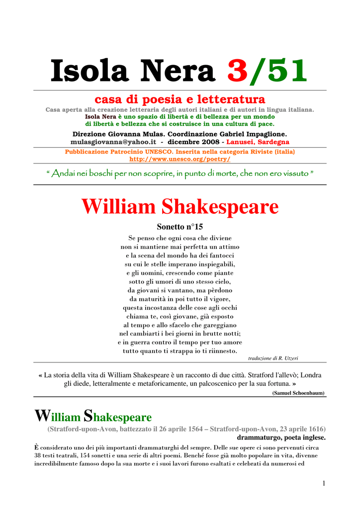 Isola Nera 3/51 casa di poesia e letteratura Casa aperta alla creazione letteraria degli autori italiani e di autori in lingua italiana. Isola Nera è uno spazio di libertà e di bellezza per un mondo di libertà e bellezza che si costruisce in una cultura di pace. Direzione Giovanna Mulas. Coordinazione Gabriel Impaglione. [email protected] - dicembre 2008 - Lanusei, Sardegna Pubblicazione Patrocinio UNESCO. Inserita nella categoria Riviste (italia) http://www.unesco.org/poetry/ “ Andai nei boschi per non scoprire, in punto di morte, che non ero vissuto ” William Shakespeare Sonetto n°15 Se penso che ogni cosa che diviene non si mantiene mai perfetta un attimo e la scena del mondo ha dei fantocci su cui le stelle imperano inspiegabili, e gli uomini, crescendo come piante sotto gli umori di uno stesso cielo, da giovani si vantano, ma pèrdono da maturità in poi tutto il vigore, questa incostanza delle cose agli occhi chiama te, così giovane, già esposto al tempo e allo sfacelo che gareggiano nel cambiarti i bei giorni in brutte notti; e in guerra contro il tempo per tuo amore tutto quanto ti strappa io ti riinnesto. traduzione di R. Utzeri « La storia della vita di William Shakespeare è un racconto di due città. Stratford l'allevò; Londra gli diede, letteralmente e metaforicamente, un palcoscenico per la sua fortuna. » (Samuel Schoenbaum) William Shakespeare (Stratford-upon-Avon, battezzato il 26 aprile 1564 – Stratford-upon-Avon, 23 aprile 1616) drammaturgo, poeta inglese. È considerato uno dei più importanti drammaturghi del sempre. Delle sue opere ci sono pervenuti circa 38 testi teatrali, 154 sonetti e una serie di altri poemi. Benché fosse già molto popolare in vita, divenne incredibilmente famoso dopo la sua morte e i suoi lavori furono esaltati e celebrati da numerosi ed 1 importanti personaggi dei secoli seguenti; è spesso considerato inoltre il poeta rappresentativo del popolo inglese, soprannominato anche il Bardo dell'Avon (o semplicemente Il Bardo) oppure il Cigno dell'Avon. Studiosi ortodossi sostengono che scrisse la maggior parte dei suoi lavori tra il 1586 e il 1612, benché la cronologia esatta delle sue opere sia ancora al centro di numerosi dibattiti, così come la paternità di alcune di esse. È considerato uno dei pochi scrittori capaci di eccellere sia nelle tragedie sia nelle commedie, oltre ad essere uno dei pochi capaci di combinare il gusto popolare con la complessa caratterizzazione dei personaggi, poetica e profondità filosofica. Le sue opere sono state tradotte nelle maggiori lingue e inscenate in tutto il mondo. Inoltre è lo scrittore maggiormente citato nella storia della letteratura inglese e molte delle sue espressioni linguistiche sono entrate nella lingua quotidiana inglese. Negli anni, molti studiosi si sono interessati alla vita di Shakespeare, portando alla luce questioni riguardo alla sua sessualità e religiosità. Shakespeare visse a cavallo fra il XVI e il XVII secolo, un periodo in cui si stava realizzando il passaggio dalla società medioevale al mondo moderno. Nel 1558 sul trono del regno era salita Elisabetta I d'Inghilterra, inaugurando un periodo di fioritura artistica e culturale che da lei prese il nome. Documentata al giorno 26 aprile 1564 è la data di battesimo di William Shakespeare a Stratford-uponAvon, in Inghilterra, figlio di John Shakespeare, fabbricante di guanti, proveniente da una famiglia di contadini e piccoli proprietari terrieri (yeomen) del Warwickshire, e di Mary Arden, figlia del nobile Robert Arden di Wilmcote, nella cui tenuta il nonno del Bardo, Richard Shakespeare, era mezzadro. Non è documentata la data di nascita che tradizionalmente si suppone sia avvenuta tre giorni prima, il 23 aprile, giorno in cui si festeggia San Giorgio, patrono dell'Inghilterra. Suo padre, persona di discreta importanza nel suo paese, negli anni seguenti cadde in disgrazia: fu sottoposto ad indagine per aver partecipato al mercato nero della lana, ed in seguito perse la sua posizione di funzionario locale (nel 1568 aveva assunto la carica di balivo). Esistono alcuni indizi che entrambi i rami della famiglia avessero simpatie per la Chiesa Cattolica Romana. William probabilmente frequentò la prestigiosa "King's New School" locale. Non ricevette un'educazione molto estesa ma conosceva la logica, la grammatica, la retorica e soprattutto il latino. Non si può inoltre affermare con certezza che frequentò l'università. Quando nel 1576 la famiglia ebbe dei problemi economici, William non solo aiutò il padre nei suoi affari ma si fece assumere anche come "assistant master" nella scuola locale. Dopo il suo matrimonio con Anne Hathaway, il 27 novembre 1582, a Stratford-upon-Avon (testimoniato da Fulk Sandalls e John Richardson) che, considerata la data di nascita della prima figlia è probabile sia stato affrettato dalla gravidanza della sposa, poco si sa sulle attività di William Shakespeare, fino alla sua comparsa sulla scena letteraria inglese. Il 26 maggio 1583 la prima figlia di Shakespeare, Susannah, venne battezzata a Stratford. Due anni dopo, il 2 febbraio 1585, vennero battezzati due gemelli: un maschio, Hamnet (che morì a undici anni), e una femmina, Judith. La figlia di Judith e del vinaio Thomas Quinley, Elisabeth, sarà l'ultima discendente della famiglia. Nel periodo dal 1585 al 1591 (chiamato dai biografi "gli anni perduti") non si dispongono di altri documenti. Si suppone che in questi anni il giovane Shakespeare si sia trasferito a Londra, lavorando come attore e scrittore. Diversi documenti del 1592 ci informano del successo di Shakespeare in ambito teatrale. Sappiamo che sue opere sono già state rappresentate dalle compagnie dei conti di Derby, di Pembroke e del Sussex; si ha notizia, inoltre, della rappresentazione il 3 marzo 1592 della prima parte dell'Enrico VI. La fama di Shakespeare era in ascesa vertiginosa, tanto da attirarsi le gelosie dei colleghi più anziani. Proprio in quest'anno Robert 