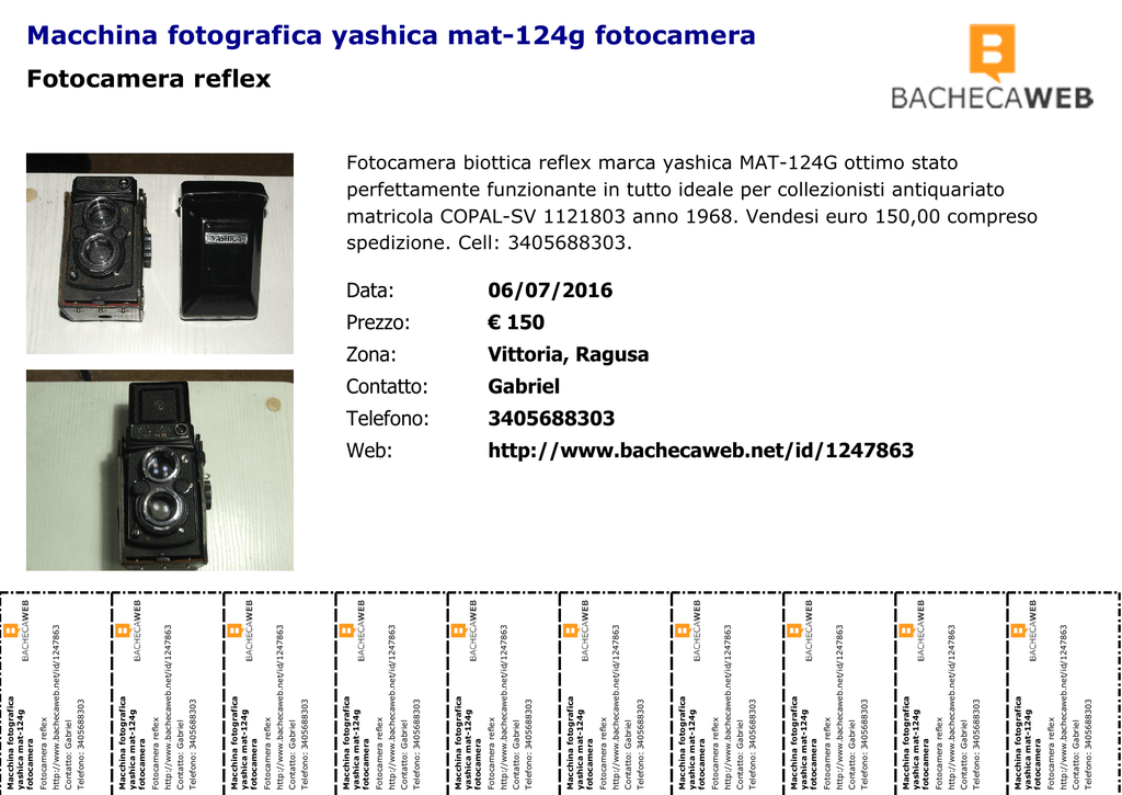 Telefono: 3405688303 Web: http://www.bachecaweb.net/id/1247863 Telefono: 3405688303 Gabriel Contatto: Gabriel Contatto: http://www.bachecaweb.net/id/1247863 Vittoria, Ragusa Fotocamera reflex Zona: Macchina fotografica yashica mat-124g fotocamera € 150 Telefono: 3405688303 Prezzo: Contatto: Gabriel 06/07/2016 http://www.bachecaweb.net/id/1247863 Data: Fotocamera reflex Macchina fotografica yashica mat-124g fotocamera Telefono: 3405688303 Contatto: Gabriel http://www.bachecaweb.net/id/1247863 Fotocamera reflex Macchina fotografica yashica mat-124g fotocamera Telefono: 3405688303 Contatto: Gabriel http://www.bachecaweb.net/id/1247863 Fotocamera reflex Macchina fotografica yashica mat-124g fotocamera Telefono: 3405688303 Contatto: Gabriel http://www.bachecaweb.net/id/1247863 Fotocamera reflex Macchina fotografica yashica mat-124g fotocamera Telefono: 3405688303 Contatto: Gabriel http://www.bachecaweb.net/id/1247863 Fotocamera reflex Macchina fotografica yashica mat-124g fotocamera Telefono: 3405688303 Contatto: Gabriel http://www.bachecaweb.net/id/1247863 Fotocamera reflex Macchina fotografica yashica mat-124g fotocamera Telefono: 3405688303 Contatto: Gabriel http://www.bachecaweb.net/id/1247863 Fotocamera reflex Macchina fotografica yashica mat-124g fotocamera Telefono: 3405688303 Contatto: Gabriel http://www.bachecaweb.net/id/1247863 Fotocamera reflex Macchina fotografica yashica mat-124g fotocamera Telefono: 3405688303 Contatto: Gabriel http://www.bachecaweb.net/id/1247863 Fotocamera reflex Macchina fotografica yashica mat-124g fotocamera Macchina fotografica yashica mat-124g fotocamera Fotocamera reflex Fotocamera biottica reflex marca yashica MAT-124G ottimo stato perfettamente funzionante in tutto ideale per collezionisti antiquariato matricola COPAL-SV 1121803 anno 1968. Vendesi euro 150,00 compreso spedizione. Cell: 3405688303.