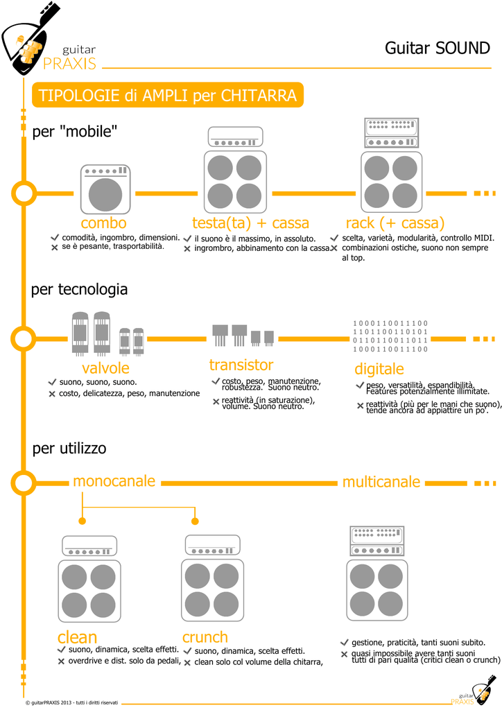 Guitar SOUND TIPOLOGIE di AMPLI per CHITARRA per "mobile" combo comodità, ingombro, dimensioni. se è pesante, trasportabilità. testa(ta) + cassa il suono è il massimo, in assoluto. ingrombro, abbinamento con la cassa. rack (+ cassa) scelta, varietà, modularità, controllo MIDI. combinazioni ostiche, suono non sempre al top. per tecnologia 1 1 0 1 transistor valvole suono, suono, suono. costo, delicatezza, peso, manutenzione costo, peso, manutenzione, robustezza. Suono neutro. reattività (in saturazione), volume. Suono neutro. 0 1 1 0 0 0 1 0 0 1 0 0 1 1 1 1 1 0 1 1 0 0 0 0 0 1 0 0 1 1 1 1 1 0 1 1 1 1 0 1 0 0 1 0 0 1 1 0 digitale peso, versatilità, espandibilità. Features potenzialmente illimitate. reattività (più per le mani che suono), tende ancora ad appiattire un po'. per utilizzo monocanale clean suono, dinamica, scelta effetti. overdrive e dist. solo da pedali, © guitarPRAXIS 2013 - tutti i diritti riservati multicanale crunch suono, dinamica, scelta effetti. clean solo col volume della chitarra, gestione, praticità, tanti suoni subito. quasi impossibile avere tanti suoni tutti di pari qualità (critici clean o crunch)