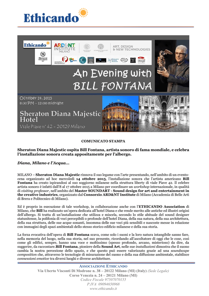 COMUNICATO STAMPA Sheraton Diana Majestic ospita Bill Fontana, artista sonoro di fama mondiale, e celebra l’installazione sonora creata appositamente per l’albergo. Diana, Milano e l’Acqua… MILANO – Sheraton Diana Majestic rinnova il suo legame con l’arte presentando, nell’ambito di un eventocena organizzato ad hoc mercoledì 14 ottobre 2015, l’installazione sonora che l’artista americano Bill Fontana ha creato ispirandosi al suo soggiorno milanese nella struttura liberty di viale Piave 42. Il celebre artista sonoro è infatti dall’8 al 17 ottobre 2015 a Milano per coordinare un workshop internazionale, in qualità di visiting professor, nell’ambito del Master SOUNDART - Sound design for art and entertainment in the creative industries, organizzato dal Consorzio ARD&NT Institute di Milano (Accademia di Belle Arti di Brera e Politecnico di Milano). Ed è proprio in esecuzione di tale workshop, in collaborazione anche con l’ETHICANDO Association di Milano, che Bill ha realizzato un’opera dedicata all’hotel Diana e che rende merito alle antiche ed illustri origini dell’albergo. Si tratta di un’installazione che utilizza e miscela, secondo lo stile abituale del sound designer statunitense, la polifonia di voci percepibili o profonde dell’hotel Diana, della sua natura, della sua architettura, della sua struttura, delle sue acque sonanti, insomma delle sue voci più sensibili e nascoste messe in relazione con immagini degli spazi ambientali dello stesso storico edificio milanese e della sua storia. La forza evocativa dell’opera di Bill Fontana scava, come solo i suoni e la loro natura intangibile sanno fare, nella memoria del luogo, nella sua storia, nel suo presente, ricordando all’ascoltatore di oggi che le cose, così come gli edifici, sempre, hanno una voce e moltissimo (spesso profondo, arcano, misterioso) da dire, da suggerire, da raccontare.Bill Fontana, pioniere della Sound Art, nelle sue installazioni dimostra che il suono cambia la nostra percezione dello spazio, e che questo può essere valorizzato grazie ad una soundscape composition che, attraverso le tecnologie di misurazione del suono e della sua diffusione ambientale, stabilisce connessioni emotive tra diversi luoghi e diverse architetture. ASSOCIAZIONE ETHICANDO Via Uberto Visconti Di Modrone n. 38 – 20122 Milano (MI) (Italy) (Sede Legale) Corso Venezia n. 24 – 20121 Milano (MI) Codice Fiscale 97507070155 P.IVA 09094650968 www.ethicando.it Tutto questo è alla base dell’installazione sonora in questione, dove l’artista, ispirato dall’elegante struttura Liberty dello Sheraton Diana Majestic e dai sui lussureggianti spazi esterni vuole celebrare il ricordo della presenza di una piscina posta, una volta, sotto la fontana in giardino, per valorizzare il rapporto tra storia e modernità milanesi, attraverso l’elemento acqua, cardine della sua ricerca artistica da oltre quarant’anni. I “Bagni di Diana” – oggi hotel Sheraton Diana Majestic - sono stati la prima piscina pubblica italiana e sono stati realizzati nel 1842. Lo stabilimento aveva una piscina lunga 100 mt e larga 25 mt: un vero paradiso, meta del bon ton milanese e non solo. Oggi la fontana dell’hotel con l’omonima dea ne ricorda i fasti ed il prestigio. L’acqua è elemento primordiale portatore di vita, quintessenza spagirica e veicolo di civiltà: la storia dell’hotel Diana parte da essa, ed attraverso di essa si lega alla storia di Milano. Bill Fontana sound designer ed artista di fama mondiale, celebra l’hotel Diana e la sua storia attraverso l’acqua mediante un’istallazione unica nel valore e nel significato. I suoni della fontana collegati alle immagini del sito dell’antica piscina – ad oggi esistente ma nascosto e custodito come tesoro di una tradizione – si trasformano attraverso l’ingegno dell’artista in un’opera d’arte. In essa, oltre ad un luogo pregno di storicità quale l’hotel Diana ed ai suoi suoni, si ritrova Milano ed il suo divenire attraverso l’acqua: il suono animico di una fontana nascosta del Castello Sforzesco captato dall’artista ne è testimone e guardiano fedele. Modernità sonora e sperimentazione acustica, intenso dialogo con il luogo e la sua anima, godibilissima esperienza polisensoriale e audiovisiva, e l’albergo come nuovo spazio performativo e di ascolto, come stimolatore di ideazioni artistiche sperimentali e insieme piacevolissime: l’installazione sonora dello statunitense Bill Fontana, massimo esponente mondiale del sound design, per Sheraton Diana Majestic di Milano rappresenta un unicum di straordinario fascino uditivo ed esperienziale. Sheraton Diana Majestic è ancora una volta al centro del panorama artistico milanese, punto di ritrovo per collezionisti, appassionati e giovani promesse. L’iniziativa fa infatti parte di un più ampio calendario di appuntamenti in collaborazione con Ethicando Association e l’Accademia di Belle Arti di Brera. *** Bill Fontana, sin dai primi anni 70’ ha usato il suono come medium sculturale per interagire e per trasformare la nostra percezione di spazi visivi ed acustici. Vincitore del premio Ars Electronica e del Collide@CERN, ha realizzato sculture sonore e progetti radiofonici per musei e per organismi di diffusione a livello globale. Il suo lavoro è stato esposto presso il Whitney Museum of American Art, il San Francisco Museum of Modern Art, il Museum Ludwig (Colonia), il Post Museum di Francoforte, i musei storici d’arte e scienze naturali a Vienna, il Tate Modern e il Tate Britain a Londra, la 48ma Biennale di Venezia, il National Gallery of Victoria di Melbourne, l’Art Gallery NSE a Sydney e il nuovo Kolumba Museum. Ha creato i maggiori progetti radiofonici di sound art per: la BBC, l’Unione europea di radiodiffusione, la corporazione australiana di radiodiffusione, la National Public Radio, la Radio della Germania Occidentale (WDR), la Radio svedese, la Radio France e la radio austriaca 