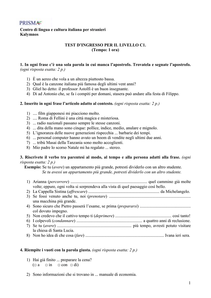 Centro di lingua e cultura italiana per stranieri Kalymnos TEST D’INGRESSO PER IL LIVELLO C1. (Tempo: 1 ora) 1. In ogni frase c’è una sola parola in cui manca l’apostrofo. Trovatela e segnate l’apostrofo. (ogni risposta esatta: 2 p.) 1) 2) 3) 4) È un aereo che vola a un altezza piuttosto bassa. Qual è la canzone italiana più famosa degli ultimi vent anni? Gliel ho detto: il professor Astolfi è un buon insegnante. Di ad Antonio che, se fa i compiti per domani, stasera può andare alla festa di Filippo. 2. Inserite in ogni frase l’articolo adatto al contesto. (ogni risposta esatta: 2 p.) 1) 2) 3) 4) 5) 6) 7) 8) .... film giapponesi mi piacciono molto. .... Roma di Fellini è una città magica e misteriosa. ... radio nazionali passano sempre le stesse canzoni. ... dita della mano sono cinque: pollice, indice, medio, anulare e mignolo. L’ignoranza delle nuove generazioni rispecchia ... barbarie dei tempi. ... personal computer hanno avuto un boom di vendite negli ultimi due anni. ... tribù Masai della Tanzania sono molto accoglienti. Mio padre lo scorso Natale mi ha regalato ... stereo. 3. Riscrivete il verbo tra parentesi al modo, al tempo e alla persona adatti alla frase. (ogni risposta esatta: 2 p.) Esempio: Se tu (avere) un appartamento più grande, potresti dividerlo con un altro studente. Se tu avessi un appartamento più grande, potresti dividerlo con un altro studente. 1) Arianna (percorrere) ........................................................................ quel cammino già molte volte; eppure, ogni volta si sorprendeva alla vista di quel paesaggio così bello. 2) La Cappella Sistina (affrescare) ................................................................... da Michelangelo. 3) Se fossi venuto anche tu, noi (prenotare) ............................................................................. una macchina più grande. 4) Sono sicuro che Pietro passerà l’esame, se prima (prepararsi) ................................................ col dovuto impegno. 5) Non credevo che il cattivo tempo ti (deprimere) ..................................................... così tanto! 6) I colpevoli (condannare) .............................................................. a quattro anni di reclusione. 7) Se tu (avere) ...................................................................... più tempo, avresti potuto visitare la chiesa di Santa Lucia. 8) Non ho idea di che cosa (fare) .......................................................................... Ivana ieri sera. 4. Riempite i vuoti con la parola giusta. (ogni risposta esatta: 2 p.) 1) Hai già finito ... preparare la cena? (□ a □ in □ con □ di) 2) Sono informazioni che si trovano in ... manuale di economia. 1 (□ chiunque □ qualsiasi □ ognuno □ tutto) 3) ... prega la gentile clientela di non toccare gli oggetti esposti. (□ Vi □ Le □ Si □ Gli) 4) Potresti parlare più ...? Non sento nulla. (□ fortemente □ forte □ lentamente □ con forza) 5) Per questo lavoro va bene ... persona laureata in matematica. (□ qualunque □ chiunque □ ciascuna □ quella) 6) È la prima volta che vedo Chiara ... buon umore. (□ con □ di □ a □ per). 7) Posso richiamarti più tardi? Sto ... uscire. (□ ad □ per □ di □ in). 5. Sottolineate in ogni frase l’opzione corretta. (ogni frase esatta: 2 p.) Esempio: Nessuno di noi sa chi è/sia il nuovo direttore. 1) 2) 3) 4) 5) 6) 7) 8) 9) Benché/Poiché la città abbia pochi abitanti, ci sono ben dieci teatri. Tutto il paese si chiedeva che/se Maria fosse partita quella notte. Pur/Per essendo una persona intelligente, non riesce a passare l’esame. Il paesaggio è più verde di quanto/perché mi aspettassi in una stagione così calda. Non ho dubbi che Marco sia/è il miglior specialista in materia. Prima di/che andare a casa, passa in edicola e compra il giornale! È un paese così bello che attira/attiri ogni giorno moltissimi turisti. Come/Quanto a ballare, Luigi è un vero disastro. Per quanto me ne intenda/intendo, è stato un bel concerto. 6. Riempite i vuoti con la parola giusta. (ogni risposta esatta: 2 p.) 1) L’assassino ha premuto il ... una sola volta, colpendo la vittima alla testa. (□ calcio □ grilletto □ cavalletto □ colpo) 2) Giangiacomo Feltrinelli è stato una delle figure più importanti dell’... italiana. (□ editoria □ editing □ edizione □ editrice) 3) Tutte le forme di ... di potere sono punite dalla legge. (□ sopruso □ abuso □ riuso □ disuso) 4) I fiumi portano al mare enormi quantità di ... (□ rovine □ riflussi □ discariche □ detriti) 5) Non riesco a risolvere il problema! La matematica non mi è affatto ... (□ connaturata □ conveniente □ congenita □ congeniale) 6) Mio fratello ha trovato lavoro in una società di ... (□ consulenza □ consulta □ consultazione □ consolato) 7. Leggete attentamente il testo qui sotto e segnate con una crocetta sulla V solo le affermazioni che corrispondono al contenuto del testo. (ogni risposta esatta: 2 p.) 2 È possibile trasformare un pianeta inospitale come Marte in un luogo capace di sostenere la vita? Alcuni ingegneri spaziali hanno immaginato vari interventi che l’uomo potrebbe realizzare in queste lande desolate per cambiarne completamente l’aspetto e renderle abitabili. Un tale ambizioso progetto è conosciuto con questo nome: “Terraforming”. Come è noto, su Marte le temperature medie si aggirano intorno a – 60° C e la pressione atmosferica è debolissima. Per prima cosa, dunque, bisogna far risalire la temperatura. Come? Pompando nell’atmosfera di Marte i famigerati clorofluorocarburi (i gas capaci di distruggere l’ozono). Ciò farebbe aumentare l’effetto serra sul pianeta rosso e la temperatura dovrebbe arrivare a 0° C. Il problema è che, per pompare clorofluorocarburi nell’atmosfera di Marte, bisognerebbe costruire su quel pianeta varie fabbriche. Un’impresa non da poco. Secondo intervento: coprire d