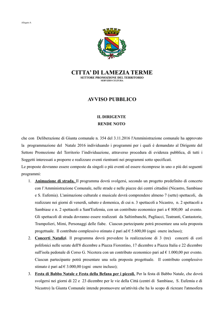 Allegato A CITTA’ DI LAMEZIA TERME SETTORE PROMOZIONE DEL TERRITORIO SERVIZIO CULTURA AVVISO PUBBLICO IL DIRIGENTE RENDE NOTO che con Deliberazione di Giunta comunale n. 354 del 3.11.2016 l'Amministrazione comunale ha approvato la programmazione del Natale 2016 individuando i programmi per i quali è demandato al Dirigente del Settore Promozione del Territorio l’individuazione, attraverso procedura di evidenza pubblica, di tutti i Soggetti interessati a proporre e realizzare eventi rientranti nei programmi sotto specificati. Le proposte dovranno essere composte da singoli o più eventi ed essere ricomprese in uno o più dei seguenti programmi: 1. Animazione di strada. Il programma dovrà svolgersi, secondo un progetto predefinito di concerto con l’Amministrazione Comunale, nelle strade e nelle piazze dei centri cittadini (Nicastro, Sambiase e S. Eufemia). L'animazione culturale e musicale dovrà comprendere almeno 7 (sette) spettacoli, da realizzare nei giorni di venerdi, sabato e domenica, di cui n. 3 spettacoli a Nicastro, n. 2 spettacoli a Sambiase e n. 2 spettacoli a Sant'Eufemia, con un contributo economico pari a € 800,00 ad evento. Gli spettacoli di strada dovranno essere realizzati da Saltimbanchi, Pagliacci, Teatranti, Cantastorie, Trampolieri, Mimi, Personaggi delle fiabe. Ciascun partecipante potrà presentare una sola proposta progettuale. Il contributo complessivo stimato è pari ad € 5.600,00 (ogni onere incluso); 2. Concerti Natalizi. Il programma dovrà prevedere la realizzazione di 3 (tre) concerti di cori polifonici nelle serate dell'8 dicembre a Piazza Fiorentino, 17 dicembre a Piazza Italia e 22 dicembre sull'isola pedonale di Corso G. Nicotera con un contributo economico pari ad € 1.000,00 per evento. Ciascun partecipante potrà presentare una sola proposta progettuale. Il contributo complessivo stimato è pari ad € 3.000,00 (ogni onere incluso); 3. Festa di Babbo Natale e Festa della Befana per i piccoli. Per la festa di Babbo Natale, che dovrà svolgersi nei giorni di 22 e 23 dicembre per le vie della Città (centri di Sambiase, S. Eufemia e di Nicastro) la Giunta Comunale intende promuovere un'attività che ha lo scopo di ricreare l'atmosfera tipica del Natale con due spettacoli di strada, ricchi di avvenimenti, con l'animazione di artisti e/o di strutture e allestimenti anche gonfiabili e la presenza di Babbo Natale che distribuirà dolciumi e regali a tutti i bambini nei tre centri cittadini. Il contributo stimato per la Festa di Babbo Natale dei giorni 22 e 23 dicembre è pari complessivamente ad Euro 1.400,00 (ogni onere incluso) per entrambi gli spettacoli. La festa della Befana dovrà svolgersi o il 5 o il 6 Gennaio 2016 con l'arrivo della Befana che sfilerà per le vie della Città (centri di Sambiase, S. Eufemia e di Nicastro) regalando calze di dolciumi a tutti i bambini nei tre centri cittadini. Il contributo stimato per le Festa della Befana è pari ad Euro 800,00 (ogni onere incluso); 4. Animazione al Chiostro del Complesso Monumentale del S. Domencio E' intenzione della Giunta Comunale promuovere la realizzazione, anche in forma singola o associata tra più soggetti, di animazione all'interno del piano terra del Complesso Monumentale del S. Domenico per la durata minima di 15 giorni decorrenti dal 18 dicembre. Il progetto dovrà contenere attività di intrattenimento tipiche della tradizione natalizia e rivolte soprattutto ai piccoli che dovranno essere coinvolti dai personaggi del natale e delle fiabe secondo i valori della solidarietà e fratellanza. Le attività dovranno prevedere per i più piccoli brevi laboratori, scambi di piccoli doni, raccolta a anche scambio di giocattoli riciclati. Inoltre, il progetto dovrà contenere attività di esposizione e riporduzione degli antichi mestieri con maestri tornitori, tessitori al telaio, cucito e ricamo della tradizione, ricicli, intagliatori del legno e cestai. Alla predetta attività di esposizione si riservano le stanze n. 1, 2 e 5 del piano terra. Si prevede un contributo stimato per la realizzazione del progetto per un importo complessivo di Euro 3.750,00 da intendersi come esonero del pagamento del canone d'uso della struttura comunale per la durata di 15 giorni. 5. Realizzazione di tre presepi. Il programma dovrà prevedere: • l'allestimento di tre presepi statici raffiguranti la natività presso isola pedonale di Corso G. Nicotera, Piazza 5 Dicembre, Piazza Italia con un contributo economico di € 3.000,00 ad allestimento (ogni onere incluso). La proposta progettuale dovrà essere unica per tutti e tre i presepi, le dimensioni dell'allestimento non potranno essere inferiore ad altezza due metri, larghezza 4 metri, profondità 3 metri e la natività di dovrà avere un'altezza minima di 1,60 metri. • il contributo di euro 1.000,00 per l'allestimento e realizzazione di tre presepi viventi nei tre centri cittadini (Nicastro, Sambiase e S. Eufemia). Ciascun partecipante potrà presentare una sola proposta progettuale. Il contributo complessivo stimato è pari ad € 3.000,00 (ogni onere incluso). 6. Festa in piazza di fine anno (concerto e animazione musicale). L'Amministrazione Comunale intende organizzare, in collaborazione con soggetti proponenti, la Festa in piazza di fine anno con un concerto e l'animazione musicale della Notte di S. Silvestro che dovrà essere realizzata sul Corso Numistrano o in un’altra area che sarà indicata dall’Amministrazione Comunale. L'importo massimo del contributo previsto per la realizzazione dell'evento è pari ad € 16.0000,00 € (ogni onere incluso). Non è prevista la vendita di biglietti di ingresso; 7. Concerto di Musica Classica di Inizio Anno . Il concerto dovrà essere realizzato l'1 gennaio 2017 al Teatro Grandinetti, o eventualmente in un’altra sede che sarà indicata dall’Amministrazione Comunale. Il contributo stimato per la realizzazione del Concerto è pari a 6.450,00 € (IVA inclusa) ed è relativo ai costi da sostenere p