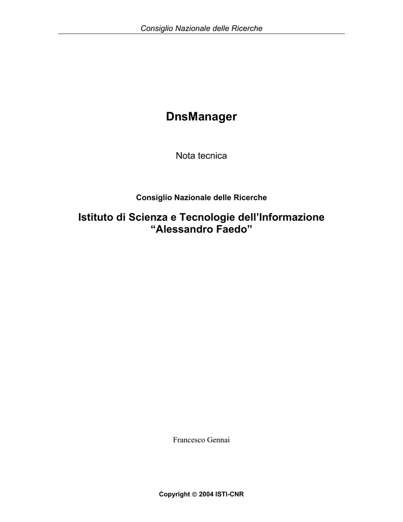 Consiglio Nazionale delle Ricerche DnsManager Nota tecnica Consiglio Nazionale delle Ricerche Istituto di Scienza e Tecnologie dell’Informazione “Alessandro Faedo” Francesco Gennai Copyright 2004 ISTI-CNR Consiglio Nazionale delle Ricerche Indice Introduzione ..........................................................................................................1 Descrizione del sistema ........................................................................................2 Gestione indirizzi IP ....................................................................................................... 2 Regole di referenza e di conflitto.................................................................................... 3 Interazione del sistema con i server SMTP...........................................................3 Funzionalità e loro applicazioni .............................................................................3 L’ambiente operativo.............................................................................................5 Strutture dati.................................................................................................................... 5 File di zona...................................................................................................................... 5 File di configurazione DnsManager.......................................................................6 Attivazione di un nuovo dominio ...........................................................................8 Rimozione di un dominio.....................................................................................10 Descrizione dei file di configurazione..................................................................11 Appendice A .......................................................................................................13 Release notes................................................................................................................. 13 DnsManager Copyright 2003 ISTI-CNR I Introduzione DnsManager è un software per la gestione via web di un name server (Domain Name System), basato sul modello Centralizzato con Delega Amministrativa. Il sistema risulta particolarmente utile nel CNR dove, in attuazione della riforma dell’Ente, un Istituto può essere costituito da sezioni geograficamente distribuite, come risultato della fusione di più organi di ricerca. Un Istituto può avere in dotazione un dominio e diversi indirizzi di rete IP, o parti di esse, presso ciascuna delle sue sezioni. La gestione dello spazio dei nomi può avvenire anche assegnando un sottodominio a ciascuna sezione e opzionalmente delegando l’amministrazione della relativa zona. A questo punto però è importante chiarire come la consuetudine di creare una zona per ogni sottodominio possa essere rivista in base alle nuove possibilità che DnsManager introduce. E’ molto importante non ritenere strettamente associate l’operazione di creazione di un sottodominio con quella di delega della relativa zona. Non sempre vi è la necessità di definire una nuova zona per un nuovo dominio !! (in particolare se questo è visto come sottodominio interno ad una stessa unità organizzativa). Il mantenimento di un sottodominio all’interno della stessa zona del dominio padre permette una maggiore flessibiltà nella gestione dei nomi. L’esigenza primaria di creare una zona separata per un determinato dominio (sottodominio) nasce sovente dalla necessità di delegarne il controllo amministrativo. Con l’utilizzo di DnsManager la delega può avvenire ad un livello superiore (delega virtuale) con il risultato che la creazione di una zona per un sottodominio non è più strettamente necessaria. DnsManager consente, con notevole flessibilità, la scelta della soluzione più adatta ad ogni singolo caso. Utilizzando DnsManager, l’amministratore può gestire il proprio dominio senza doversi preoccupare della gestione operativa del name server e senza dover necessariamente ricorrere alla definizione di zone per la delega amministrativa di eventuali sottodomini. In questo modo la gestione dell’intero spazio dei nomi di un Istituto risulta più flessibile e gli utenti possono avere tempi di risposta veloci. L’interfaccia web abilita l’uso ed il controllo del sistema anche a gestori remoti. Per una migliore distribuzione delle competenze sono state previste interfacce indirizzate a differenti categorie di amministratori: personale tecnico esperto, personale non tecnico (senza particolari conoscenze dei fondamenti del DNS). In questo modo informazioni delicate, come la definizione di record NS o record MX vengono trattate solo da un numero limitato di persone. DnsManager Copyright 2003 ISTI-CNR 1 Il sistema verifica che tutte le informazioni passate dal gestore al server siano congruenti, evitando in tal modo gli errori che normalmente si possono commettere nella gestione di un name server. Descrizione del sistema L’amministrazione del servizio avviene attraverso una interfaccia WEB a cui si accede via sessione criptata (https). Il gestore può essere abilitato alla creazione ed alla cancellazione di record di tipo: A, NS, MX, CNAME, PTR. Può inoltre associare a ciascun record informazioni amministrative come la data di scadenza del record, il nome del referente dell’host o la dislocazione dell’apparato registrato. L’amministrazione si basa su una struttura gerarchica composta da tre livelli di accesso, per ognuno dei quali è possibile definire più utenti di amministrazione: - supervisore per il controllo di tutti i gruppi amministrativi del dominio; - amministratori privilegiati che possono controllare uno o più gruppi con possibilità di accedere a tutti i tipi di record (A, NS …); - amministratori non-privilegiati che controllano uno o più gruppi, limitatamente ai record di tipo A. Ad ogni utente è associato un file di configurazione che ne descrive le caratteritiche ope