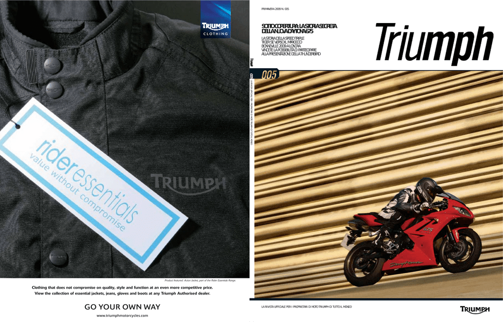 PRIMAVERA 2009 N. 005 SOTTO COPERTURA: LA STORIA SEGRETA DELLA NUOVA DAYTONA 675 C LOTH I N G LA STORIA DELLA SPEED TRIPLE TIGER SE VERSO IL MAROCCO BONNEVILLE 2009 A LONDRA VINCETE LA POSSIBILITÀ DI PARTECIPARE ALLA PRESENTAZIONE DELLA THUNDERBIRD 005 LA RIVISTA UFFICIALE PER I PROPRIETARI DI MOTO TRIUMPH DI TUTTO IL MONDO Product featured: Acton Jacket, part of the Rider Essentials Range. Clothing that does not compromise on quality, style and function at an even more competitive price. View the collection of essential jackets, jeans, gloves and boots at any Triumph Authorised dealer. GO YOUR OWN WAY www.triumphmotorcycles.com LA RIVISTA UFFICIALE PER I PROPRIETARI DI MOTO TRIUMPH DI TUTTO IL MONDO TAKE THE LONG WAY HOME SOMMARIO N. 005 CARI LETTORI, Basta accendere la TV o leggere il giornale in questi giorni per sentire storie di recessione e mercati finanziari in difficoltà. La crisi ha avuto ripercussioni senza precedenti in pressoché ogni settore, incluso quello motociclistico. La buona notizia è che l’ultima neve si è finalmente sciolta, le strade si stanno pian piano asciugando e i giorni si stanno allungando, il che fa di questo periodo il momento migliore per tornare a far girare la moto in strada! Ma la notizia ancora migliore è che tutti i discorsi sulla recessione non hanno fermato Triumph dal continuare a investire nello sviluppo di strabilianti nuove moto e il 2009 sarà uno dei nostri anni più forti. Che cos’è che più conta nella vita? Se lo chiedete al personale di Triumph, vi risponderanno che è progettare e costruire moto fantastiche! Ed è ciò che abbiamo sempre fatto e che intendiamo continuare a fare. Abbiamo già ricevuto il plauso internazionale per i nostri nuovi modelli. La pubblicazione giapponese Motonavi ha predisposto un test di 22 nuovi modelli e ha votato la Street Triple R come la migliore nuova moto del 2009, un successo davvero importante specialmente perché ottenuto proprio a casa dei più grandi produttori del mondo. Devo ammettere che ci ha fatto sentire tutti molto orgogliosi a Hinckley! La nostra nuova Daytona 675 è stata persino definita “la migliore moto sportiva di tutti i tempi” dallo stimato giornalista Alan Cathcart. Potrete leggere del suo sviluppo proprio in queste pagine. Desidero ringraziare le molte persone che ci hanno dedicato il loro tempo rispondendo al nostro sondaggio a seguito dell’ultimo numero di Triumph Magazine. Abbiamo apprezzato i vostri commenti e abbiamo adottato molte delle vostre brillanti idee nella rivista. A partire da questo numero, Triumph Magazine verrà pubblicato due volte l’anno, ma troverete una rivista con meno pubblicità e più articoli del tipo che ci avete detto di desiderare. E potrete accedere alla nostra rivista in un modo del tutto nuovo, grazie all’edizione online disponibile sul nostro sito web: www.triumphmotorcycles.com Speriamo che gli approfondimenti sui nostri nuovi modelli e le fantastiche esperienze di guida raccontate vi siano di ispirazione per montare in sella alla vostra Triumph e divertirvi. Dopo tutto, un colpetto di acceleratore e qualche chilometro di serenità possono essere la miglior cura contro le tristi notizie che ci arrivano dai media. The new Triumph Tiger, with the unique and torquey triple cylinder engine, puts sport back into adventure. For more information on our 2009 range of Motorcycles, Clothing and Accessories or to create your own dream Guidate con la testa! Triumph visit www.triumphmotorcycles.com or contact your nearest authorised dealer. GO YOUR OWN WAY www.triumphmotorcycles.com TUE MANTONI CEO, Triumph Motorcycles 01 LA PERFEZIONE FATTA MOTO 02 DANIEL DAY-LEWIS 03 MAROCCO, DAI MONTI ATLAS ALL’ATLANTICO p18 p8 La nuova Daytona 675, raccontata in prima persona dal suo progettista. p16 Intervista esclusiva all’attore premio Oscar. Di cosa abbiamo parlato? Di moto, naturalmente. La splendida Tiger SE si è messa alla prova in un viaggio dalla Spagna fino al cuore del Marocco. 04 BRUNTINGTHORPE 05 LA CITTÀ NASCOSTA 06 ACCESSORI 07 EVOLUZIONE 08 IL SIGNORE DEGLI ANELLI 09 INEGUAGLIABILE. DI NUOVO 10 CHE PASSIONE p26 Pensate che fare il collaudatore per Triumph sia un lavoro affascinante? Leggete questo articolo e poi ne riparliamo... p28 La nuova Bonneville ci accompagna in un viaggio nella Londra che non vedrete mai in cartolina. p32 Cosa c’entra un fucile con i test che Triumph riserva ai suoi accessori ufficiali? p34 La storia della Speed Triple e un’introduzione alla 1050 “15th Anniversary SE”. p40 L’incredibile vita di un pistone... p42 Le prime impressioni di guida della nuova Thunderbird, cruiser con un bicilindrico parallelo da 1600cc. Nessuna è come lei. p46 Il gusto degli italiani è unico anche quando elaborano le loro moto. CONCORSO p45 In palio un premio unico! L’invito alla presentazione stampa ufficiale della Thunderbird, in Spagna. TR05 CONTENTS ITAL AW P1 12/3/09 15:50 Page 1 SOMMARIO N. 005 CARI LETTORI, Basta accendere la TV o leggere il giornale in questi giorni per sentire storie di recessione e mercati finanziari in difficoltà. La crisi ha avuto ripercussioni senza precedenti in pressoché ogni settore, incluso quello motociclistico. La buona notizia è che l’ultima neve si è finalmente sciolta, le strade si stanno pian piano asciugando e i giorni si stanno allungando, il che fa di questo periodo il momento migliore per tornare a far girare la moto in strada! Ma la notizia ancora migliore è che tutti i discorsi sulla recessione non hanno fermato Triumph dal continuare a investire nello sviluppo di strabilianti nuove moto e il 2009 sarà uno dei nostri anni più forti. Che cos’è che più conta nella vita? Se lo chiedete al personale di Triumph, vi risponderanno che è progettare e costruire moto fantastiche! Ed è ciò che abbiamo sempre fatto e che intendiamo continuare a fare. Abbiamo già ricevuto il plauso internazionale per i nostri nuovi modelli. La pubblicazione giapponese Motonavi ha pred