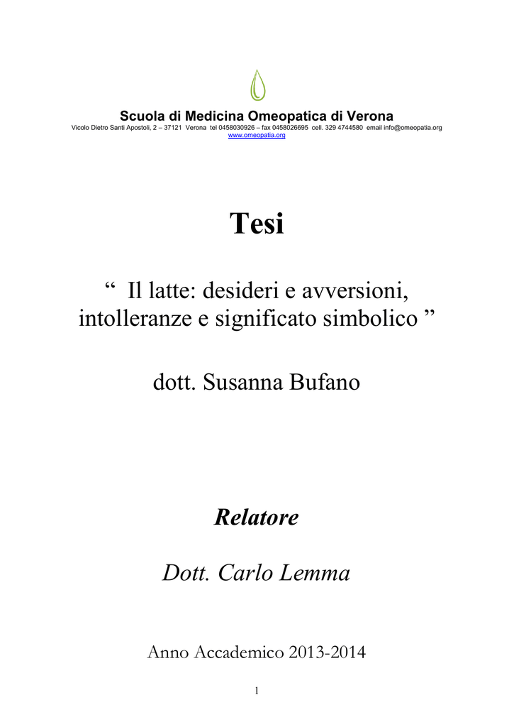 Scuola di Medicina Omeopatica di Verona Vicolo Dietro Santi Apostoli, 2 – 37121 Verona tel 0458030926 – fax 0458026695 cell. 329 4744580 email [email protected] www.omeopatia.org Tesi “ Il latte: desideri e avversioni, intolleranze e significato simbolico ” dott. Susanna Bufano Relatore Dott. Carlo Lemma Anno Accademico 2013-2014 1 INTRODUZIONE E’ nozione consolidata come una corretta alimentazione sia alla base della salute. Su quali siano pero’ i cibi salutari abbiamo le opinioni più diverse. Purtroppo, come spesso avviene, si vanno formando le due fazioni opposte: i “tradizionalisti” e gli “alternativi”, come se i medici si dividessero in tifoserie calcistiche. Manca un confronto pacato che si basi su un metodo scientifico (non solamente statistico), cioè osservazione libera da pregiudizio. In particolare ci sono alcuni alimenti, come carne, vino, frumento e, appunto, il latte, su cui si crea un vero e proprio campo di battaglia ideologica. Forse perché oltre al valore alimentare essi contengono un profondo significato nell’inconscio collettivo, luogo in cui dimorano le esperienze e le tradizioni di migliaia e milioni di generazioni che ci hanno preceduti… Come medico e come madre, mi sono posta spesso il dubbio se sia giusto o no utilizzare il latte vaccino nell’alimentazione, se seguire le linee guida della Medicina Ufficiale o altre opinioni… Come Omeopati siamo chiamati in prima persona a fornire indicazioni ai nostri pazienti e, secondo me, non ci possiamo accontentare di seguire passivamente le idee prese in prestito da altri. Io non ho interessi economici, non aderisco a nessun gruppo politico o religioso. Pur avendo un profondo amore per gli animali, non seguo una dieta vegana. Quando ho iniziato questa tesi non avevo idea di quali informazioni avrei trovato. Mi ha spinto un unico interesse: la curiosità. 2 IL LATTE: ALIMENTO DEL CUCCIOLO NEONATO Secondo l’Enciclopedia Treccani si definisce latte il prodotto di secrezione delle ghiandole mammarie; si presenta come un liquido bianco opaco, di composizione chimica complessa; è destinato ad alimentare la prole dei Mammiferi, per la quale rappresenta un alimento completo e indispensabile del primo periodo della vita. La parola latte deriva dal latino lact (lact-lactis), detto (g)lac nella forma antica originaria, a sua volta derivata dal greco gàla (gàla-gàlaktos) e dal cretese klàgos. Secondo alcuni il termine sarebbe di origine onomatopeica, derivato dal rumore provocato dal movimento di suzione del latte. Anche il termine galassia (Via Lattea) deriva dal tardo latino galaxias e dal greco kyklos, gàla, gàlaktos e ha origine mitologica. Secondo la mitologia la Dea Era fu costretta da Zeus, su consiglio di Atena, ad allattare Ercole (Eracle) per renderlo immortale. Da alcune gocce del latte che sgorgava dal seno di Era (Giunone per i latini) ebbe origine la Via Lattea. Pieter Paul Rubens Origine della via lattea - 1636 3 I cuccioli degli animali sono svezzati quando la madre è nuovamente incinta o si prepara a un’altra gravidanza . Nella cultura occidentale, oggi, la ragione più frequentemente riportata per svezzare i cuccioli umani è quella di prepararsi a rientrare al lavoro. Le balene hanno bisogno di mantenere la loro sagoma levigata e idrodinamica. Le ghiandole mammarie della madre si trovano al di sotto di uno spesso strato di grasso. Questa sede interna protegge il latte dal freddo. Il piccolo dà colpetti in quell’area e ne fuoriesce latte spesso come crema. Un piccolo di balena grigia del pacifico può ingerire quasi 40 kg di latte materno al giorno. Negli ippopotami nascita e allattamento avvengono sott’acqua. Il piccolo riesce a tenere chiusi istintivamente orecchie e narici mentre succhia, ogni trenta quaranta secondi viene sospinto dalla madre verso la superficie per respirare. 4 La leonessa e i piccoli vivono in gruppo. In un branco ciascuna leonessa si prende cura di tutti i cuccioli e, a differenza della maggior parte degli altri mammiferi, qualsiasi leonessa allatta qualsiasi cucciolo. Una leonessa appisolata dopo aver cacciato tutta la notte non fa granché caso a chi le stia succhiando il latte. E poiché è così strettamente imparentata con le altre, una leonessa aiuta la famiglia senza che le importi quale cucciolo stia allattando. La foca incappucciata vive circa trent’anni, ma passa solo 4 giorni ad allattare e ad essere prole: il più breve periodo d’allattamento di tutti i mammiferi. Vive in mare, ma ha bisogno di partorire e allattare fuori dell’acqua. La sola superficie disponibile è quella del ghiaccio che galleggia. I cuccioli sono partoriti quando il ghiaccio comincia a sciogliersi e spezzarsi. Un’improvvisa tempesta potrebbe far scontrare i pezzi, schiacciando madre e cuccioli. Oppure un banco di ghiaccio potrebbe spaccarsi e separare la madre dai cuccioli. Una infanzia breve aiuta ad evitare questi pericoli. Gli oranghi allattano, stanno a cavalcioni sulle spalle delle madri e dormono nel loro nido per sette anni. Uno tra i più lunghi periodi d’allattamento fra tutti i mammiferi. I piccoli stanno con le madri almeno fino a quando arriva un nuovo nato. Sono delle acrobate esperte, che spesso allattano appese ad un ramo con una mano e una zampa.(1) 5 Non allatta solo chi ha mammelle e capezzoli: gli animali appartenenti all’ordine dei Monotremi, Echidna e Ornitorinco dopo la fuoriuscita dei piccoli dalle uova, secernono latte da pori della pelle. I piccoli leccano il latte che trasuda fra la cute e il pelo della madre.(2,3) Non tutti sanno che il latte viene prodotto anche da alcune specie avicole, ad esempio il piccione o colombo e il fenicottero. (4) I piccoli sono nutriti dai genitori con un particolare prodotto della degenerazione caseosa dell’epitelio che riveste internamente l’ingluvie: il latte del gozzo. Esso, nei primi giorni di vita, rappresenta l’unica fonte di nutrimento fino a quando cominciano a ricevere anche aliment