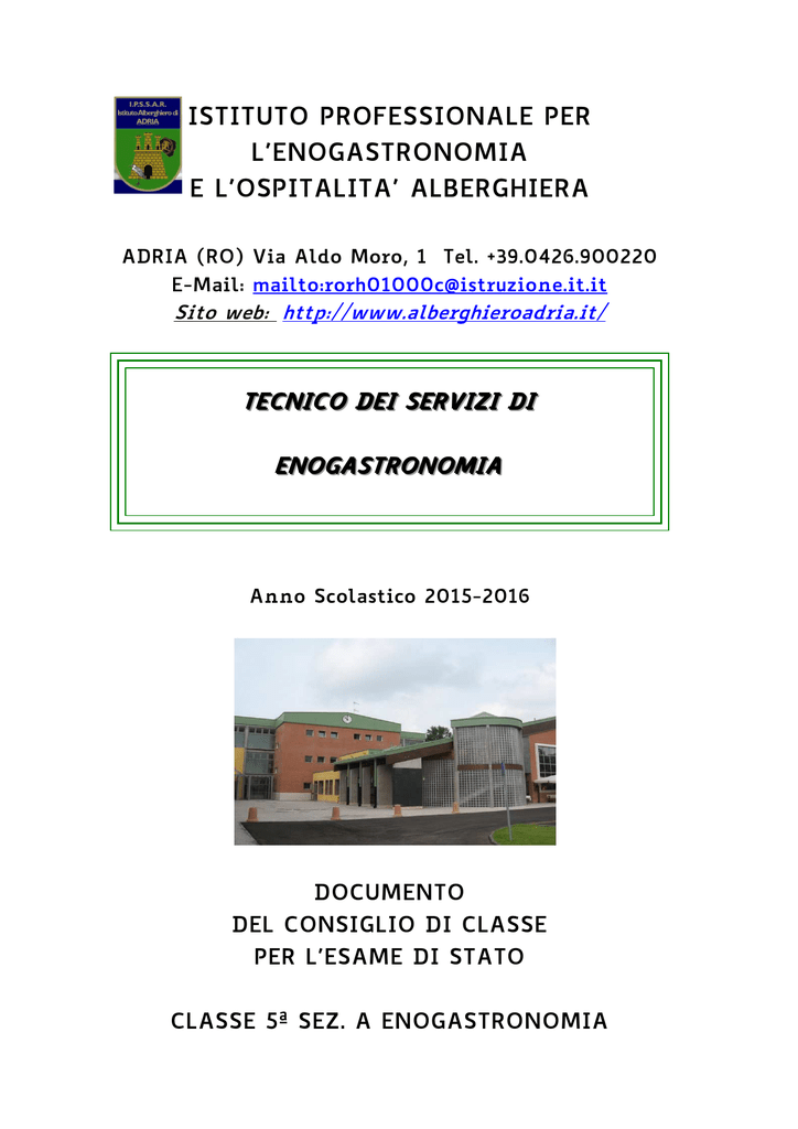 ISTITUTO PROFESSIONALE PER L’ENOGASTRONOMIA E L’OSPITALITA’ ALBERGHIERA ADRIA (RO) Via Aldo Moro, 1 Tel. +39.0426.900220 E-Mail: mailto:[email protected] Sito web: http://www.alberghieroadria.it/ TTEEC CN NIIC CO OD DEEII SSEER RV VIIZ ZII D DII EEN NO OG GA ASSTTR RO ON NO OM MIIA A Anno Scolastico 2015-2016 DOCUMENTO DEL CONSIGLIO DI CLASSE PER L’ESAME DI STATO CLASSE 5ª SEZ. A ENOGASTRONOMIA I.P.S.E.O.A. “G. Cipriani ” - ADRIA Anno Scolastico 2015 - 2016 INDICE Configurazione della Classe ............................................................................................. 12 Obiettivi generali formativi ............................................................................................ 14 Prove Scritte-Colloquio-Valutazione........................................................................... 16 Esperienze di Alternanza Scuola Lavoro ................................................................... 17 RELAZIONI DEI DOCENTI Materia: Materia: Materia: Materia: Materia: Materia: Materia: Materia: Materia: Materia: Materia: 32 ITALIANO ................................................................ ................................................................................................ ..................................................................................... ..................................................... 33 STORIA ................................................................ ................................................................................................ .......................................................................................... .......................................................... 37 INGLESE ................................................................ ................................................................................................ ....................................................................................... ....................................................... 40 FRANCESE ................................................................ ................................................................................................ ..................................................................................... ..................................................... 45 MATEMATICA MATEM ATICA ................................................................ ................................................................................................ ............................................................................. ............................................. 48 D.T.A ................................................................ ................................................................................................ ............................................................................................... ............................................................... 52 Scienza e cultura dell’Alimentazione ............................................................. ............................................................. 57 Laboratorio dei servizi Enogastronomici settore CUCINA ..................... 59 Laboratorio dei servizi Enogastronomici settore Sala e Vendita ....... 62 Scienze motorie e sportive ................................................................ ................................................................................... ................................................... 65 RELIGIONE ................................................................ ................................................................................................ .................................................................................... .................................................... 67 ALLEGATO 2 : ATTIVITA’ PLURIDISCIPLINARI……………………69 TITOLO ITOLO DEL PERCORSO : CIBO E RELIGIONE ............................................................... ............................................................... 70 TITOLO DEL PERCORSO : DAL GLOBALE AL SOLIDALE ............................................. ............................................. 72 TITOLO DEL PERCORSO : FUTURE DAY............................................................................ DAY......... ...................................................................74 ...................................................................74 TITOLO DEL PERCORSO : “LA SICUREZZA ALIMENTARE e LA PREVENZIONE SUL LAVORO”LAVORO” - ASSE TECNOLOGICO ................................................................ ..................................................................................... ..................................................... 75 ALLEGATO 3 : PROVE DI SIMULAZIONE………………77 GRIGLIE DI VALUTAZIONE (si veda il fascicolo unitario di istituto ) IL CONSIGLIO DI CLASSE DELLA 5 A Enogastronomia ................................... 97 DOCUMENTO DEL CONSIGLIO DI CLASSE 5 A ENOGASTRONOMIA Pag. 2 di 97 I.P.S.E.O.A. “G. Cipriani ” - ADRIA Anno Scolastico 2015 - 2016 DOCUMENTO DEL CONSIGLIO DI CLASSE Classe 5 A ENOGASTRONOMIA Anno Scolastico 2015 - 2016 Coordinatore di classe Prof.ssa Natalia Previato INFORMAZIONI GENERALI SULL’ISTITUTO L'istituto Alberghiero di Adria può vantare quasi 50 anni di esperienza nella formazione di personale qualificato nel settore turistico - alberghiero. Sorto come sezione annessa dell'Istituto Professionale per il Commercio nel lontano 1966 è costantemente cresciuto negli anni, fino a diventare autonomo alla fine degli anni Ottanta. Il bacino di utenza è molto vasto, comprendendo una parte del retroterra veneziano (riviera del Brenta), la parte sud-orientale della provincia di Padova, le zone orientali limitrofe del ferrarese ed ovviamente, il Polesine, la cui estensione in lunghezza sfiora i 140 chilometri. Attualmente conta circa, 1200 studenti ai qual