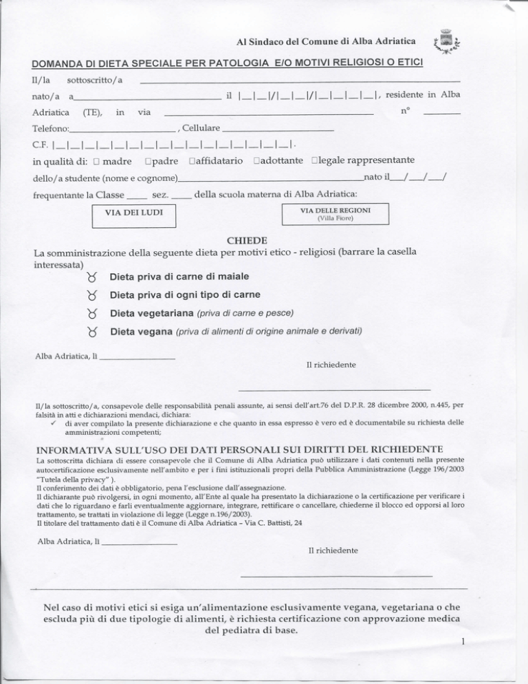 domanda di dieta speciale per patologia e/o motivi religiosi o etici