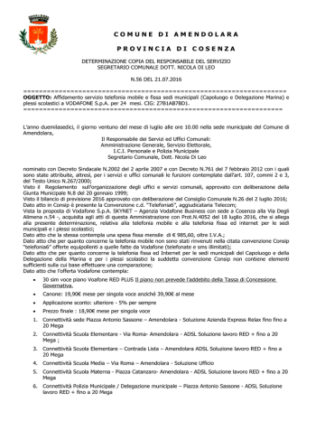 COMUNE DI AMENDOLARA PROVINCIA DI COSENZA DETERMINAZIONE COPIA DEL RESPONSABILE DEL SERVIZIO SEGRETARIO COMUNALE DOTT. NICOLA DI LEO N.56 DEL 21.07.2016 =================================================================== OGGETTO: Affidamento servizio telefonia mobile e fissa sedi municipali (Capoluogo e Delegazione Marina) e plessi scolastici a VODAFONE S.p.A. per 24 mesi. CIG: Z7B1AB7BD1. ================================================================== L’anno duemilasedici, il giorno ventuno del mese di luglio alle ore 10.00 nella sede municipale del Comune di Amendolara, Il Responsabile dei Servizi ed Uffici Comunali: Amministrazione Generale, Servizio Elettorale, I.C.I. Personale e Polizia Municipale Segretario Comunale, Dott. Nicola Di Leo nominato con Decreto Sindacale N.2002 del 2 aprile 2007 e con Decreto N.761 del 7 febbraio 2012 con i quali sono state attribuite, altresì, per i servizi e uffici comunali le funzioni contemplate dall'art. 107, commi 2 e 3, del Testo Unico N.267/2000; Visto il Regolamento sull'organizzazione degli uffici e servizi comunali, approvato con deliberazione della Giunta Municipale N.8 del 20 gennaio 1999; Visto il bilancio di previsione 2016 approvato con deliberazione del Consiglio Comunale N.26 del 2 luglio 2016; Dato atto in Consip è presente la Convenzione c.d. “Telefonia6”, aggiudicataria Telecom; Vista la proposta di Vodafone S.p.A. SKYNET – Agenzia Vodafone Business con sede a Cosenza alla Via Degli Alimena n.54 -, acquisita agli atti di questa Amministrazione con Prot.N.4052 del 18 luglio 2016, che si allega alla presente determinazione, relativa alla telefonia mobile e alla telefonia fissa ed internet per le sedi municipali e i plessi scolastici; Dato atto che la stessa contempla una spesa fissa mensile di € 985,60, oltre I.V.A.; Dato atto che per quanto concerne la telefonia mobile non sono stati rinvenuti nella citata convenzione Consip “telefonia6” offerte equipollenti a quelle fatte da Vodafone (telefonate e sms illimitati); Dato atto che per quanto concerne la telefonia fissa ed Internet per le sedi municipali del Capoluogo e della Delegazione della Marina e per i plessi scolastici la suddetta convenzione Consip non contiene elementi sufficienti sulla cui base effettuare una comparazione; Dato atto che l’offerta Vodafone contempla: • 30 sim voce piano Voafone RED PLUS Il piano non prevede l’addebito della Tassa di Concessione Governativa. • Canone: 19,90€ mese per singola voce anziché 39,90€ al mese • Applicazione sconto: ulteriore - 5% per sempre • Prezzo finale : 18,90€ mese per singola voce 1. Connettività sede Piazza Antonio Sassone – Amendolara - Soluzione Azienda Express Relax fino fino a 20 Mega 2. Connettività Scuola Elementare - Via Roma- Amendolara - ADSL Soluzione lavoro RED + fino a 20 Mega ; 3. Connettività Scuola Elementare – Contrada Lista – Amendolara ADSL Soluzione lavoro RED + fino a 20 Mega 4. Connettività Scuola Media – Via Roma – Amendolara - Soluzione Ufficio 5. Connettività Scuola Materna - Piazza Catanzaro- Amendolara - ADSL Soluzione lavoro RED + fino a 20 Mega 6. Connettività Polizia Municipale / Delegazione municipale – Piazza Antonio Sassone - ADSL Soluzione lavoro RED + fino a 20 Mega prodotto /servizio 1 soluzione Express Relax costo mensile quantità sconto comprensivo di sconto 1 20% costo di installazione sim voce red + ( + promo speciale luglio) adsl soluzione lavoro red+ 8,00 € 30 20,00 € 4 costo di attivazione / installazione soluzione ufficio costo di attivazione/ installazione totale /mese 192,00 € 567,00 € 119,60 € 20,00 € 1 75,00 € 4,00 € 985,60 € Visto il decreto-legge 24 giugno 2014, n. 90 e successive modifiche ed integrazioni, recante Misure urgenti per la semplificazione e la trasparenza amministrativa e visto, in particolare, l'art. 23-ter, comma 3, ai sensi del quale − fermi restando l'articolo 26, comma 3, della legge 23 dicembre 1999, n. 488, l'articolo 1, comma 450, della legge 27 dicembre 2006, n. 296, e l'articolo 9, comma 3, del decreto-legge 24 aprile 2014, n. 66 − i comuni possono procedere autonomamente agli acquisti di beni, servizi e lavori di valore inferiore a 40.000 euro; Visto l’art. 1, comma 7 del decreto-legge 6 luglio 2012, n. 95, convertito, con modificazioni, dalla legge 7 agosto 2012, n. 135, come modificato dall'art. 1, comma 494 della Legge 28 dicembre 2015, n. 208, nel quale vengono dettate specifiche disposizioni relative alle seguenti categorie merceologiche: - energia elettrica; - gas; - carburanti rete; - carburanti extra-rete; - combustibili per riscaldamento; - telefonia fissa; - telefonia mobile; Dato atto, inoltre, che, ai sensi del predetto art. 1, comma 7, del D.L. n. 95/2012 la possibilità di procedere ad affidamenti mediante adesione ad altre centrali di committenza non regionali oppure mediante ricorso ad autonome procedure di evidenza pubblica è subordinata alla condizione che tali affidamenti autonomi prevedano corrispettivi inferiori rispetto ai corrispettivi indicati nelle convenzioni e accordi quadro messi a disposizione da CONSIP e dalle centrali di committenza regionali di almeno: il 10% per le categorie merceologiche della telefonia fissa e della telefonia mobile; il 3% per le categorie merceologiche dei carburanti extra-rete, dei carburanti rete, dell’energia elettrica, del gas e dei combustibili per il riscaldamento; Dato atto che ai sensi del citato art. 1, comma 7, del D.L. n. 95/2012, detti contratti devono essere trasmessi all’Autorità nazionale anticorruzione e devono essere sottoposti a condizione risolutiva con possibilità per il contraente di adeguamento ai migliori corrispettivi nel caso di intervenuta disponibilità di convenzioni CONSIP e - delle centrali di committenza regionali che prevedano condizioni di maggior vantaggio economico in percentuale superiore al 10 per cento rispetto ai contratti già stipulati; Rilevato che l’accettazione della sudd