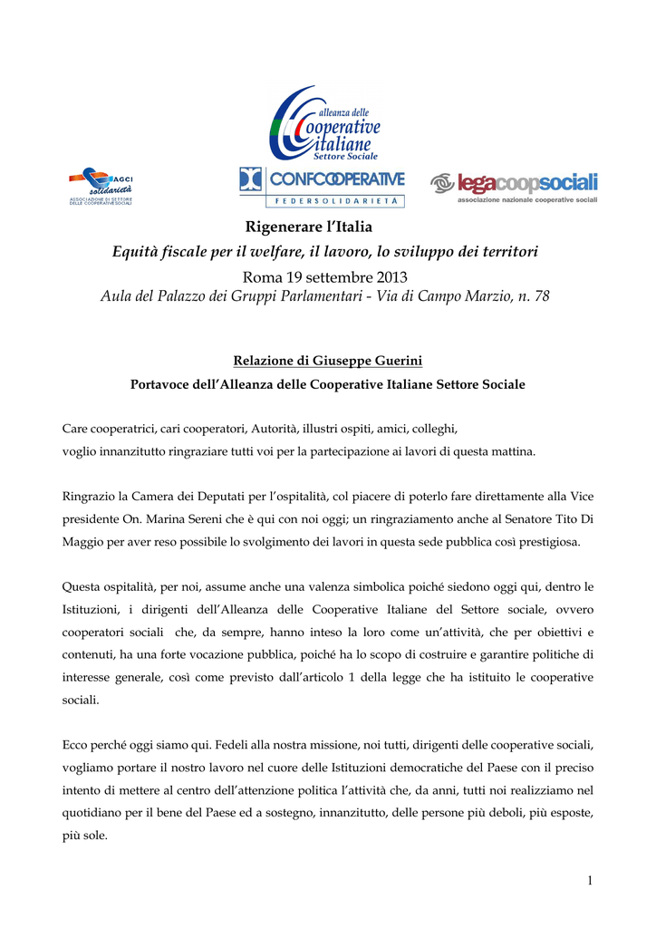 Rigenerare l’Italia Equità fiscale per il welfare, il lavoro, lo sviluppo dei territori Roma 19 settembre 2013 Aula del Palazzo dei Gruppi Parlamentari - Via di Campo Marzio, n. 78 Relazione di Giuseppe Guerini Portavoce dell’Alleanza delle Cooperative Italiane Settore Sociale Care cooperatrici, cari cooperatori, Autorità, illustri ospiti, amici, colleghi, voglio innanzitutto ringraziare tutti voi per la partecipazione ai lavori di questa mattina. Ringrazio la Camera dei Deputati per l’ospitalità, col piacere di poterlo fare direttamente alla Vice presidente On. Marina Sereni che è qui con noi oggi; un ringraziamento anche al Senatore Tito Di Maggio per aver reso possibile lo svolgimento dei lavori in questa sede pubblica così prestigiosa. Questa ospitalità, per noi, assume anche una valenza simbolica poiché siedono oggi qui, dentro le Istituzioni, i dirigenti dell’Alleanza delle Cooperative Italiane del Settore sociale, ovvero cooperatori sociali che, da sempre, hanno inteso la loro come un’attività, che per obiettivi e contenuti, ha una forte vocazione pubblica, poiché ha lo scopo di costruire e garantire politiche di interesse generale, così come previsto dall’articolo 1 della legge che ha istituito le cooperative sociali. Ecco perché oggi siamo qui. Fedeli alla nostra missione, noi tutti, dirigenti delle cooperative sociali, vogliamo portare il nostro lavoro nel cuore delle Istituzioni democratiche del Paese con il preciso intento di mettere al centro dell’attenzione politica l’attività che, da anni, tutti noi realizziamo nel quotidiano per il bene del Paese ed a sostegno, innanzitutto, delle persone più deboli, più esposte, più sole. 1 Tutte le nostre attività, come il lavoro di cura, l’impegno sui temi educativi, nell’assistenza, l’inserimento lavorativo delle persone svantaggiate e tante altre ancora, danno a noi tutti il coraggio necessario per affermare che il nostro primo desiderio ed il nostro principale compito è quello di impegnarci per “Rigenerare l’Italia” con il nostro stile, con il nostro peculiare modo di intraprendere attivamente la solidarietà e di promuovere l’autorganizzazione delle persone intorno ai loro bisogni. E’ questo il nostro modo di interpretare l’Impresa Sociale. Fare della solidarietà un valore imprenditoriale è il nostro desiderio e il nostro saper fare; mettere in gioco noi stessi nella relazione con l’altro per promuoverne l’emancipazione è il nostro rischio d’impresa. Grandi rischi, grandi desideri per un progetto concreto di tante persone che hanno investito nelle cooperative sociali italiane. Tante, tantissime persone, ed i dati lo dimostrano. Il Censimento ISTAT certifica che il settore più dinamico nel decennio 2001 – 2011 è proprio il nostro, quello della cooperazione sociale. Abbiamo fatto registrare, e dobbiamo esserne orgogliosi, le performance migliori rispetto a tutto il panorama imprenditoriale italiano, ma anche rispetto a tutto il non profit. In questo decennio il numero delle cooperative sociali è cresciuto del +98,5%, da 5.674 ad 11.264 coop sociali, mentre la crescita dell’occupazione è stata ancora superiore, ovvero del + 114,9%. Oggi gli occupati sono 365.006, i soci volontari sono 42.368. Rispetto all’incremento complessivo degli occupati nel non profit verificatosi tra il 2001 e il 2011 la cooperazione sociale ha contribuito con il 56,5%. In questo arco temporale di crescita occupazione limitata, la nostra cooperazione sociale ha contribuito per il 38% al saldo occupazionale complessivo in Italia. E lo abbiamo fatto garantendo la tenuta della coesione sociale del nostro Paese, anche e soprattutto in questi anni di crisi. Abbiamo stimato in circa 7 milioni le persone utenti che si interfacciano quotidianamente con i nostri servizi. Siamo oramai una grande infrastruttura di welfare, di politiche attive del lavoro, di sviluppo locale, siamo certamente la più grande rete d’impresa sociale d’Europa ed una delle più significative al mondo. 2 Forse anche per questo, l’interesse dell’Europa per le Imprese Sociali è cresciuto in modo esponenziale. E noi siamo quotidianamente in Europa a dimostrare che la più peculiare delle imprese sociali è proprio la cooperativa sociale secondo il modello Italiano. Negli ultimi anni a livello europeo, le più importanti iniziative di promozione dell’impresa sociale ci vedono pienamente coinvolti. Con l’Azione della Commissione Europea dell’ottobre 2011, l’impresa sociale è entrata tra le leve della strategia europea per uscire dalla crisi e per promuovere una crescita intelligente, sostenibile e inclusiva (Europa 2020). Entro quest’anno saranno approvate le nuove direttive europee su appalti e concessioni con misure specifiche per le imprese sociali di inserimento lavorativo e saranno finalmente riconosciute le clausole sociali sulla base del modello previsto dall’art. 5 della legge 381 del 1991 sulle cooperative sociali. Inoltre, la direttiva prevede l’obbligo di affidare gli appalti di servizi socio sanitari con la formula dell’offerta economicamente più vantaggiosa e non col massimo ribasso. Sulla partita delle clausole sociali per l’inserimento lavorativo dopo l’approvazione della legge 381, l’Unione Europea aveva avviato una procedura di infrazione che aveva portato l’Italia ha modificare le previsioni sugli affidamenti. Noi italiani, in questo caso, non ci siamo fatti intimidire perché avevamo ragione. Era necessario che fosse l’Europa a cambiare posizione e così è successo. Ora quella norma italiana, che 20 anni fa si riteneva violasse la concorrenza, è stata pienamente recepita e diventerà una previsione della Direttiva Europea sugli appalti e sulle concessioni. Ciò conferma la nostra grande specificità cooperativa e le potenzialità della nostra interpretazione di non profit e di impresa sociale. Ma conferma anche che se le nostre idee sono buone, il dibattito europeo le sa rece