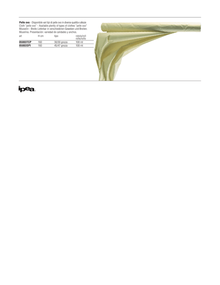 Pelle ovo - Disponibile vari tipi di pelle ovo in diverse qualità e altezze Cloth ”pelle ovo” - Available plently of types of clothes ”pelle ovo” Musselin - Breite Lieferbar in verschiedenen Geweben und Breiten. Muselina. Presentación: variedad de calidades y anchos. art H cm tipo rotolo/roll rolle/rollo 05003TCP 160 30/30 grezza 100 mt 05003SPI 160 45/47 grezza 100 mt