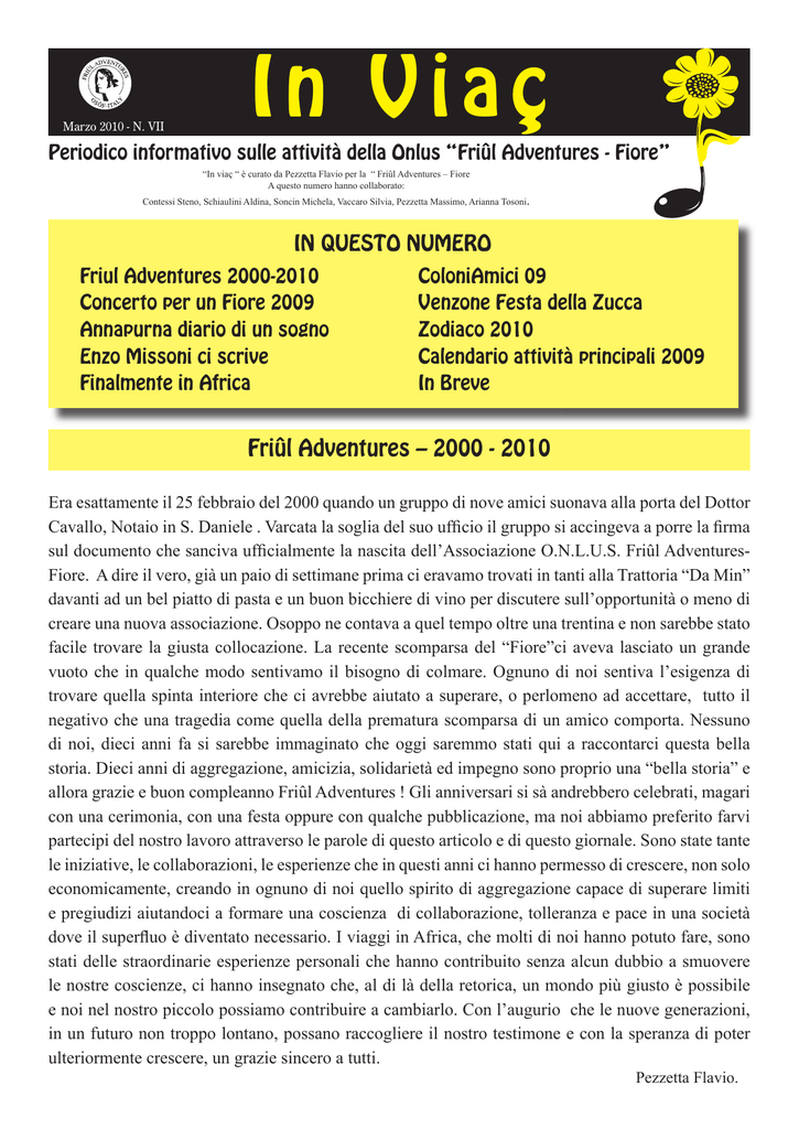 Marzo 2010 - N. VII In Viaç Periodico informativo sulle attività della Onlus “Friûl Adventures - Fiore” “In viaç “ è curato da Pezzetta Flavio per la “ Friûl Adventures – Fiore A questo numero hanno collaborato: Contessi Steno, Schiaulini Aldina, Soncin Michela, Vaccaro Silvia, Pezzetta Massimo, Arianna Tosoni. IN QUESTO NUMERO Friul Adventures 2000-2010 Concerto per un Fiore 2009 Annapurna diario di un sogno Enzo Missoni ci scrive Finalmente in Africa ColoniAmici 09 Venzone Festa della Zucca Zodiaco 2010 Calendario attività principali 2009 In Breve Friûl Adventures – 2000 - 2010 Era esattamente il 25 febbraio del 2000 quando un gruppo di nove amici suonava alla porta del Dottor Cavallo, Notaio in S. Daniele . Varcata la soglia del suo ufficio il gruppo si accingeva a porre la firma sul documento che sanciva ufficialmente la nascita dell’Associazione O.N.L.U.S. Friûl AdventuresFiore. A dire il vero, già un paio di settimane prima ci eravamo trovati in tanti alla Trattoria “Da Min” davanti ad un bel piatto di pasta e un buon bicchiere di vino per discutere sull’opportunità o meno di creare una nuova associazione. Osoppo ne contava a quel tempo oltre una trentina e non sarebbe stato facile trovare la giusta collocazione. La recente scomparsa del “Fiore”ci aveva lasciato un grande vuoto che in qualche modo sentivamo il bisogno di colmare. Ognuno di noi sentiva l’esigenza di trovare quella spinta interiore che ci avrebbe aiutato a superare, o perlomeno ad accettare, tutto il negativo che una tragedia come quella della prematura scomparsa di un amico comporta. Nessuno di noi, dieci anni fa si sarebbe immaginato che oggi saremmo stati qui a raccontarci questa bella storia. Dieci anni di aggregazione, amicizia, solidarietà ed impegno sono proprio una “bella storia” e allora grazie e buon compleanno Friûl Adventures ! Gli anniversari si sà andrebbero celebrati, magari con una cerimonia, con una festa oppure con qualche pubblicazione, ma noi abbiamo preferito farvi partecipi del nostro lavoro attraverso le parole di questo articolo e di questo giornale. Sono state tante le iniziative, le collaborazioni, le esperienze che in questi anni ci hanno permesso di crescere, non solo economicamente, creando in ognuno di noi quello spirito di aggregazione capace di superare limiti e pregiudizi aiutandoci a formare una coscienza di collaborazione, tolleranza e pace in una società dove il superfluo è diventato necessario. I viaggi in Africa, che molti di noi hanno potuto fare, sono stati delle straordinarie esperienze personali che hanno contribuito senza alcun dubbio a smuovere le nostre coscienze, ci hanno insegnato che, al di là della retorica, un mondo più giusto è possibile e noi nel nostro piccolo possiamo contribuire a cambiarlo. Con l’augurio che le nuove generazioni, in un futuro non troppo lontano, possano raccogliere il nostro testimone e con la speranza di poter ulteriormente crescere, un grazie sincero a tutti. Pezzetta Flavio. CONCERTO PER UN FIORE 2009 DALL’ITALIA AL NEPAL A RITMO DI MUSICA Anche quest’anno la Friûl Adventures ha organizzato l’evento canoro che, da più di dieci anni, colora con le sue note l’estate friulana. Sabato 18 luglio 2009 alle ore 21.00 presso il Parco Colonia di Osoppo, si è dato inizio al “Concerto per un Fiore”. Sul palco sono saliti gli Echoes (Pink Floyd cover band), i Power Flower’s (rock anni ’70), e le Vocinconsuete (quartetto vocale). Una serata di solidarietà, aggregazione, entusiasmo ed amicizia sulle note di una dolce colonna sonora che ci ha preso per mano e ci ha fatto ballare sognando un mondo diverso, un mondo in cui tutti abbiano il diritto di vivere, curarsi, istruirsi ed avere obiettivi di vita. L’edizione 2009 è stata dedicata al progetto dell’Associazione Onlus “Friul Mandi-Nepal Namastè” di Malborghetto impegnata nella costruzione di una scuola a Badhikel, un piccolo paesino a 20 km a sud di Patan in Nepal. In questo luogo così puro e lontano dalle contaminazioni occidentali si vuole costruire una scuola in cui dei bambini possano istruirsi e crescere, un luogo altrettanto puro e rispettoso, ricco di insegnamenti che aiuteranno questi bambini ad avere un futuro nella loro terra. Da noi l’istruzione si dà ormai quasi per scontata, è una naturale tappa nella vita dei nostri figli, ma se vivessimo in un’altra realtà tutto questo non sarebbe poi così normale, è solamente per un caso del destino che qualcuno nasce in un luogo piuttosto che in un altro. Noi non possiamo cambiare il destino,ma possiamo aiutare a migliorarlo semplicemente sorridendo, divertendoci assieme, in una serata unica che ci ha permesso di vivere serenità, gioia e pace attraverso la musica del Fiore. Per la cronaca, in quest’occasione sono stati raccolti 13.000 euro, un contributo importante a favore dei nostri piccoli amici nepalesi di Badhikel. Grazie a tutti: amici vecchi e nuovi, simpatizzanti, cantanti, musicisti, per aver condiviso con noi ancora una volta questa bella esperienza di impegno, solidarietà, aggregazione e divertimento. Un grazie sincero alle Associazioni: Comitato per la Solidarietà, Buteghe dal Mont, Asia, Friuli Guatemala, Amnesty International, A.C.A.T., Pense e Maravee, Nepal Namastè, Italia Cuba. Con affetto, Friûl Adventures-Fiore Gli amici di “Nepal Namaste” ci scrivono.... Tendopoli Globo – L’Aquila, 20 agosto 2009 Malborgetto, venerdì 27 novembre 2009 Cari Amici di Friûl Adventures. Mandi Amis Impegni inderogabili precedentemente fissati non mi consentono di partecipare al vostro incontro. Mi spiace molto non potervi ringraziare personalmente per l’eccezionale contributo di 13.000 euro che ci avete consegnato, frutto del vostro lavoro, solidarietà e amicizia. Sarà mia premura continuare a farvi avere tutti gli stati di avanzamento dei lavori di costruzione della Puchoki School. La struttura a due piani è stata completata, e sono in corso i 