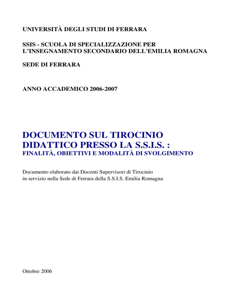 UNIVERSITÀ DEGLI STUDI DI FERRARA SSIS - SCUOLA DI SPECIALIZZAZIONE PER L’INSEGNAMENTO SECONDARIO DELL'EMILIA ROMAGNA SEDE DI FERRARA ANNO ACCADEMICO 2006-2007 DOCUMENTO SUL TIROCINIO DIDATTICO PRESSO LA S.S.I.S. : FINALITÀ, OBIETTIVI E MODALITÀ DI SVOLGIMENTO Documento elaborato dai Docenti Supervisori di Tirocinio in servizio nella Sede di Ferrara della S.S.I.S. Emilia Romagna Ottobre 2006 Università di Ferrara - S.S.I.S. - Scuola di Specializzazione per l'Insegnamento Secondario Il tirocinio didattico nella SSIS: finalità, obiettivi, modalità di svolgimento Competenze dell’insegnante e finalità del tirocinio didattico Il tirocinio è una parte essenziale della formazione iniziale dell’insegnante, compito istituzionale della Scuola di Specializzazione per l’Insegnamento Secondario. “Alle attività di tirocinio, ivi comprese le fasi di progettazione e di verifica, è destinato non meno del 25% dei crediti della Scuola di Specializzazione.” (Bando di ammissione al VII Ciclo della SSIS Emilia Romagna, 2005-2006). Il corso biennale di specializzazione prevede che un quarto delle ore complessive, ed un quarto dei crediti complessivi (30 crediti, su un totale di 120 crediti complessivi), sia dedicato al tirocinio. Il tirocinio, in particolare, ha l’obiettivo di far conseguire alcune competenze fondamentali nella formazione iniziale del futuro insegnante. Tali competenze possono essere collocate nei seguenti quattro ambiti: Competenze disciplinari e didattiche; Competenze relazionali; Competenze organizzative; Competenze istituzionali. Il tirocinio dovrà consentire allo specializzando di integrare le conoscenze teoriche, ricavate dai corsi e dai laboratori della Scuola di Specializzazione all’Insegnamento, con le esperienze in classe, al fine di contribuire alla costruzione iniziale della sua professionalità di docente. La conclusione della S.S.I.S., con il conseguimento del diploma di specializzazione, non sarà un punto di arrivo, ma una tappa importante per un percorso di riflessione sulla propria pratica di insegnamento in una prospettiva di formazione continua dell’insegnante. Finalità e obiettivi del tirocinio Il tirocinio didattico persegue alcune finalità principali: Rendere espliciti, analizzare e rielaborare criticamente i modelli di insegnamento che lo specializzando ha incontrato nel suo curricolo di studi; Rendere consapevoli della molteplicità dei fattori che influenzano la situazione di insegnamento-apprendimento nella classe (contesto scolastico, ambiente, dinamiche interpersonali, contenuti disciplinari,…); Riflettere sulla singolarità del processo di apprendimento individuale (fascia di età, interessi e motivazioni, risorse individuali, …); Introdurre lo specializzando nella vita e nell’attività delle scuole secondarie per favorire l’acquisizione delle competenze proprie della professione docente nei seguenti ambiti: 2 o Della pratica didattica riguardante gli insegnamenti propri della/e classe/i di abilitazione (strategie di intervento educativo, costruzione di unità didattiche, analisi di libri di testo, scelta di strumenti e procedure di controllo dell' apprendimento…); o Degli aspetti relazionali, collegiali, di programmazione e di gestione della scuola; o Delle competenze istituzionali (saper svolgere le proprie azioni didattiche, relazionali, organizzative nell’osservanza dei diritti-doveri sanciti dalla Costituzione italiana, dallo stato giuridico degli insegnanti, da ogni altra normativa vigente,…). Soggetti coinvolti nel tirocinio didattico Tirocinante (o specializzando) È l’insegnante in formazione che concorda i contenuti e le modalità di attuazione del modulo di tirocinio con il docente supervisore del tirocinio (SVT) presso la Scuola di Specializzazione e con il docente “tutor” delle scuole; il tirocinante analizza l’esperienza con il docente “tutor” e con il SVT. Compila il “diario del tirocinio”, eventuali schede strutturate (o semistrutturate) di osservazione e scrive una traccia delle lezioni svolte nella fase del tirocinio attivo. Questi materiali serviranno come base di documentazione per la preparazione della "Relazione finale " che sarà svolta dallo specializzando al termine delle sua esperienza di tirocinio. Per alcune indicazioni sull’uso di questi strumenti e la stesura concreta della relazione finale, si rinvia alla documentazione allegata. Tutor (o docente “accogliente”) È l’insegnante che, all’interno delle Istituzioni scolastiche che hanno aderito alla Convenzione sul tirocinio didattico con l' Università di Ferrara, accoglie nelle proprie classi il tirocinante. Collabora ad organizzare la struttura del modulo di tirocinio con il supervisore (SVT in servizio nella SSIS) per definire contenuti, tempi e metodi; presenta i contenuti specifici e ne concorda l’attuazione con il tirocinante. Al termine del tirocinio traccia con lo specializzando un bilancio dell’esperienza; su tale esperienza invia una relazione finale, di cui si allega un modello, al supervisore del tirocinio. Supervisore del tirocinio (SVT) È l’insegnante in servizio alla S.S.I.S. responsabile di seguire il tirocinio; definisce i metodi e le finalità generali del tirocinio con gli specializzandi e ne segue il lavoro “in itinere”. Il SVT nella prima fase della sua attività approfondisce con gli specializzandi (tirocinio “indiretto”) gli aspetti organizzativi dell' istituzione scolastica (articolazione amministrativa di tipo dirigenziale, organi collegiali, autonomia scolastica, Piano dell’Offerta Formativa, curricoli nazionali, programmi disciplinari, documenti dell' insegnante,…) e quelli direttamente legati alla didattica (progetti, percorsi pluridisciplinari, cicli di lezioni, moduli, unità didattiche, valutazione, strumenti didattici, libri di testo, uso di computer e di strumenti multimediali,…). Successivamente il SVT propone agli specializzandi di predisporre lo schema di perco