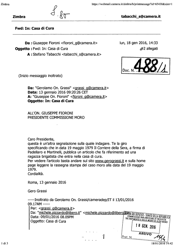 https://webmail.came ra.it/zimbra/h/printmessage?id=65430&xim=l Zimbra [email protected] Zimbra Fwd: In: Casa di Cura Da : Giuseppe Fioroni <fì[email protected]> Oggetto : Fwd: In: Casa di Cura A : Stefano Tabacchi <[email protected]> lun, 18 gen 2016, 14:33 <#>2 allegati À Doc. N/TlJ (Inizio messaggio inoltrato) Da: "Gerolamo On. Grassi" <grassi [email protected]> Data: 13 gennaio 2016 09:20:26 CET A: "Giuseppe On. Fioroni" <fioroni [email protected]> Oggetto: In: Casa di Cura ALTON. GIUSEPPE FIORONI PRESIDENTE COMMISSIONE MORO Caro Presidente, questa è un'altra segnalazione sulla quale indagare. Te la giro specificando che in data 19 maggio 1979 II Corriere della Sera, a firma di Padellaro e Martinelli, pubblica un articolo che fa riferimento ad una ragazza brigatista che entra nella casa di cura. Per vedere l'articolo basta andare sul sito www.aeroarassi.it e sulla home page leggere la rassegna stampa del caso moro alla data del 19 maggio 1979. Cordialità. Roma, 13 gennaio 2016 Gero Grassi Inoltrato da Gerolamo On. Grassi/cameradep/IT il 13/01/2016 09.17AM - — Per: <arassi [email protected]> 1 di 3 18/01/2016 14:42 https://webrmilxamera.it/zimbra/r^printmessage?id=65430&xim=l (Vedere file allegato: Villa Maria Pia del 1962 dossier.pdf) (Vedere file allegato: Villa Maria Pia Srl.pdf) Ciao Gero, come Ti accennavo, in allegato la documentazione da cui emerge che la Casa di Cura Villa Maria Pia in via del forte trionfale, quasi davanti a casa Moro, è collegata a Bonanni Eleonora, amministratrice e unica proprietaria. La società e stata costituita nel 1987. La Casa di Cura esisteva comunque già nel 1978. Una precedente società con la stessa ragione sociale costituita nel 1962 è stata chiusa nel 2005. Di quest'ultima non riesco a trovare chi fossero i soci/amministratori. Trovo solo come liquidatore una signora egiziana. Sarebbe interessante se tu riuscissi ad approfondire. Mi farebbe piacere poter essere tenuto informato sugli sviluppi. Grazie. Ciao. Michele P.s. ho chiesto info a Carlo D'Adamo il quale mi ha confermato che Bonanni Eleonora è certamente collegata per parentela al Bonanni dell'Austin Morris di Via Fani. AVVISO: Questo messaggio ed i suoi eventuali allegati sono rivolti esclusivamente ai destinatari e possono contenere informazioni riservate. Qualsiasi utilizzo, diffusione o riproduzione senza autorizzazione è proibita. Qualora vi fosse pervenuto questo messaggio per errore, esso va cancellato immediatamente con preghiera di avvisare il mittente. Grazie. AVVISO: Questo messaggio ed i suoi eventuali allegati sono rivolti esclusivamente ai destinatari e possono contenere informazioni riservate. Qualsiasi utilizzo, diffusione o riproduzione senza autorizzazione è proibita. Qualora vi fosse pervenuto questo messaggio per errore, esso va cancellato immediatamente con preghiera di avvisare il mittente. Grazie. 2 18/01/2016 14:42 Zimbra https://webmail.camera.it/zimbra/h/printmessage?id=65430&xim=l r - Villa Maria Pia del 1962 dossier.pdf I[pn7l r 118 KB . Villa Maria Pia Srl.pdf l m 175 KB *» 0 3 di 3 18/01/2016 14:42 Cerved BUSINESS INFORMATION DOSSIER APPROFONDITO Con elenco soci VILLA MARIA PIA - SOCIETÀ A RESPONSABILITÀ LIMITATA prodoltoil: 15/12/2015 alle ore: 17:47:39 visualizzalo il: 15/12/2015 m m Controllò Automatico Éventi Pregiudizievoli NESSUN EVENTO DÀ SEGNALARE Altre Segnalazioni NESSUNA SEGNALAZIONE Rilevanza Storicadéi Fenomeni di Insolvibilità NESSUNA Indirizzo Sede ROMA (RIVI) VIA DEL FORTE TRIONFALE 36 CAP 00135 Codice Fiscale • 08161070589 Partita Iva 01975541002 • RM/645055 CCIAA/REA Forma Giuridica ., SOCIETÀ' A RESPONSABILITÀ' LIMITATA . Situazione Impresa ATTIVA Attività Economica (Rettificata Cerved . Group)-. • • ••. Ospedali e case di cura generici Data Costituzione 06/11/1987 Data Iscrizione CCIAA 30/11/1987 Data Inizio Attività CCIAA • 02/03/1990 . 41.600 Capitale Sociale (Versato) - Euro • Nr. Addetti nel 2015 - 39 Interrogazioni su Cerved Group 2 Nr. Uffici e Sedi Secondane Attive Nessuno Movimentazioni R. I: (ultimo semestre) Nessuna Telefono 06/3010024 .. . . Sito Internet . " , , " E-MAIL Certificata ; ;. r ' i — •,, ' ' • ': -, •. v> www.villamariapia.it [email protected] 4 pag. 1/10 DOSSIER APPROFONDITO Con elenco soci Bilanci, depositati/disponibili Comparto . 31/12/2014, 31/12/2013 , 31/12/2012 , 31/12/2011 , 31/12/2 010, annualità precedenti ' Industriali, Commerciali e di Servizi .'. ; (importi espressi in Euro) CONTO ECONOMICO VALORE DELLA PRODUZIONE 2.771.742 RICAVI 2.769.185 MOL 513.367 RIS. OP. CARATTERISTICO 255.060 - ONERI FINANZIARI 165 RIS. ANTE GESTIONE STRAORDINARIA 166.039 UTILE PERDITA DI ESERCIZIO 90.689 348.996 CASH FLOW STATO PATRIMONIALE: ATTIVO 0 CREDITO VERSO SOCI IMMOBILIZZAZIONI 6.051.385 CIRCOLANTE 1.608.781 RATEI E RISCONTI 1.521 7.661.687 TOTALE ATTIVO STATO PATRIMONIALE: PASSIVO PATRIMONIO NETTO 6.790.757 FONDO RISCHI E ONERI 0 TFR 535.635 DEBITI 335.294 RATEI E RISCONTI 1 TOTALE PASSIVO 7.661.687 INDICI DI REDDITIVITÀ' R.O.E. (RETURN O N EQUITY) 1,3% R.O.I. CERVED (RETURN O N INVESTMENT) 3,3% R.O.S. (RETURN O N SALES) 6,0% INDICI DI LIQUIDITÀ' RAPPORTO CORRENTE 394,4% INDICE DI LIQUIDITÀ IMMEDIATA (ACID TEST) 392,1% GIORNI DI CREDITO AL CLIENTI O DURATA DEI CREDITI VERSO CLIENTI 78,3 GIORNI DI CREDITO DAI FORNITORI 57,0 INDICI DI SVILUPPO 5 pag.2/10 ©Cerved BUSINESS INFORMATION DOSSIER APPROFONDITO Con elenco soci VARIAZIONE DEI RICAVI 1,5% VARIAZIONE DEL PATRIMONIO NETTO 1,3% R O E (Return On Equity); utile d esercizio/patrimonio netto ì v *"Vj.' « . '* R O S. (Return on Sales) - risultato ante gestione finanziarla/ricavi RAPPORTO CORRENTE - attivo corrente/passivo corrente ' , . i fc 1 ' R.O.I. GERVEDi(Return On Investlment);- risultato operatlvo*caratterlstico/;totàle attivo*'. 1 * , -,: . INDICE LIQUIDITÀ'. IMMEDIATA (ACID-TEST)'- [(attivo corfenterrimànenzeVpassivo corrente], > GIORNI DI CREDITO Al CLIENTI - 360 gg * (crediti verso clienti / ricavi)* l 