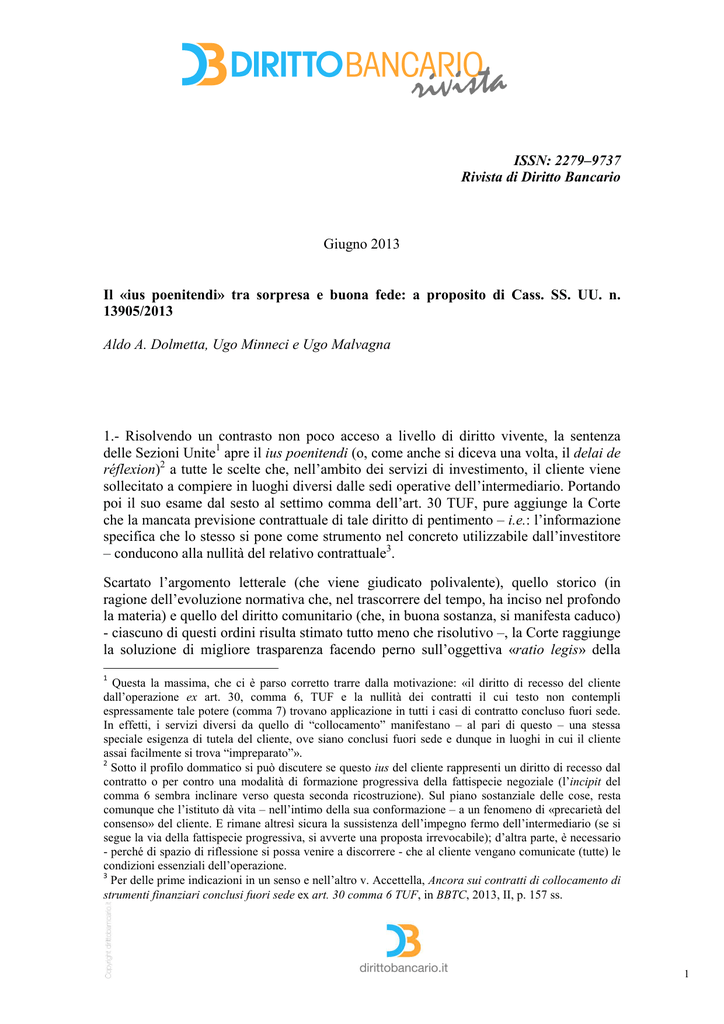 ISSN: 2279–9737 Rivista di Diritto Bancario Giugno 2013 Il «ius poenitendi» tra sorpresa e buona fede: a proposito di Cass. SS. UU. n. 13905/2013 Aldo A. Dolmetta, Ugo Minneci e Ugo Malvagna 1.- Risolvendo un contrasto non poco acceso a livello di diritto vivente, la sentenza delle Sezioni Unite1 apre il ius poenitendi (o, come anche si diceva una volta, il delai de réflexion)2 a tutte le scelte che, nell’ambito dei servizi di investimento, il cliente viene sollecitato a compiere in luoghi diversi dalle sedi operative dell’intermediario. Portando poi il suo esame dal sesto al settimo comma dell’art. 30 TUF, pure aggiunge la Corte che la mancata previsione contrattuale di tale diritto di pentimento – i.e.: l’informazione specifica che lo stesso si pone come strumento nel concreto utilizzabile dall’investitore – conducono alla nullità del relativo contrattuale3. Scartato l’argomento letterale (che viene giudicato polivalente), quello storico (in ragione dell’evoluzione normativa che, nel trascorrere del tempo, ha inciso nel profondo la materia) e quello del diritto comunitario (che, in buona sostanza, si manifesta caduco) - ciascuno di questi ordini risulta stimato tutto meno che risolutivo –, la Corte raggiunge la soluzione di migliore trasparenza facendo perno sull’oggettiva «ratio legis» della 1 Questa la massima, che ci è parso corretto trarre dalla motivazione: «il diritto di recesso del cliente dall’operazione ex art. 30, comma 6, TUF e la nullità dei contratti il cui testo non contempli espressamente tale potere (comma 7) trovano applicazione in tutti i casi di contratto concluso fuori sede. In effetti, i servizi diversi da quello di “collocamento” manifestano – al pari di questo – una stessa speciale esigenza di tutela del cliente, ove siano conclusi fuori sede e dunque in luoghi in cui il cliente assai facilmente si trova “impreparato”». 2 Sotto il profilo dommatico si può discutere se questo ius del cliente rappresenti un diritto di recesso dal contratto o per contro una modalità di formazione progressiva della fattispecie negoziale (l’incipit del comma 6 sembra inclinare verso questa seconda ricostruzione). Sul piano sostanziale delle cose, resta comunque che l’istituto dà vita – nell’intimo della sua conformazione – a un fenomeno di «precarietà del consenso» del cliente. E rimane altresì sicura la sussistenza dell’impegno fermo dell’intermediario (se si segue la via della fattispecie progressiva, si avverte una proposta irrevocabile); d’altra parte, è necessario - perché di spazio di riflessione si possa venire a discorrere - che al cliente vengano comunicate (tutte) le condizioni essenziali dell’operazione. 3 Per delle prime indicazioni in un senso e nell’altro v. Accettella, Ancora sui contratti di collocamento di strumenti finanziari conclusi fuori sede ex art. 30 comma 6 TUF, in BBTC, 2013, II, p. 157 ss. 1 norma dell’art. 30: per esprimersi con altre parole, sulla regola della necessaria coerenza della struttura nei confronti della funzione. E così sottolinea, appunto, che il luogo non abituale (come diverso da quello dei locali specialmente adibiti a propria attività dall’intermediario finanziario) con facilità può indurre il cliente «a una scelta negoziale non sufficientemente meditata», perché compiuta in una situazione di impreparazione (: la «sollecitazione ..., per ciò stesso, potrebbe aver colto l’investitore impreparato»)4. Pare a noi questa soluzione essere giusta. Non si può non constatare, in effetti, come «per il costume» degli italiani rappresenti tutt’oggi fatto di sorpresa «la stipulazione di contratti bancari [più genericamente, del ceppo finanziario] fuori dai “locali commerciali” della banca: i luoghi diversi dallo sportello [aut similia] appaiono, ancora oggi, contesto alieno»5. Come pure è appena il caso di ricordare il carattere storicamente «bancocentrico» del sistema finanziario italiano e anche che - per lunghissima, e pure attuale, tradizione – l’azione distributiva dei prodotti bancari/finanziari si snoda, nel suo costone principale (in tempi non remoti, costone esclusivo), a mezzo delle filiali bancarie. Sembra sicuro, insomma, che la attività bancaria/finanziaria «fuori sede» vada articolata con attenzione in ogni sua fase operativa6 e sottoposta a speciali cautele di tratto preventivo, nonché a tutele di ordine successivo. 2.- Così raggiunta la soluzione, la chiusa della motivazione della sentenza delle Sezioni Unite - nel ribadirne la trave portante [il rimarco è proprio alla «difficoltà di giustificare, anche sul piano costituzionale, una disparità di trattamento tra l’ipotesi di offerta fuori sede di strumenti finanziari che sia fondata sulla diversa tipologia di servizio di investimento reso dall’intermediario, quando … del tutto analoga è la situazione di maggiore vulnerabilità in cui viene a trovarsi il cliente» (il corsivo è aggiunto)] – viene a esplicitare un argomento ulteriore, per conferma della bontà della soluzione medesima. Il riferimento viene portato, in tal modo, ai «principi generali desumibili» dal TUF, che vengono dichiarati quali pure supportati dalla norma dell’art. 38 della Carta dei diritti fondamentali dell’UE, che, nel «garantire un “livello elevato di protezione dei consumatori”, per ciò stesso impone [per ogni buon conto] d’interpretare le norme ambigue nel senso più favorevole a questi ultimi». E pure questo passaggio, per quanto fatto per la sola abbondanza, si manifesta importante assai: in specie, perché evidentemente inteso a valorizzare – e sul piano direttamente negoziale dello svolgimento dell’attività di impresa finanziaria - la clausola generale predisposta nella 4 In apicibus impreparato, ben si può dire, rispetto all’evento. Prima ancora che alla sollecitazione, cioè, il riferimento va diretto all’operazione finanziaria tout court. In altri termi