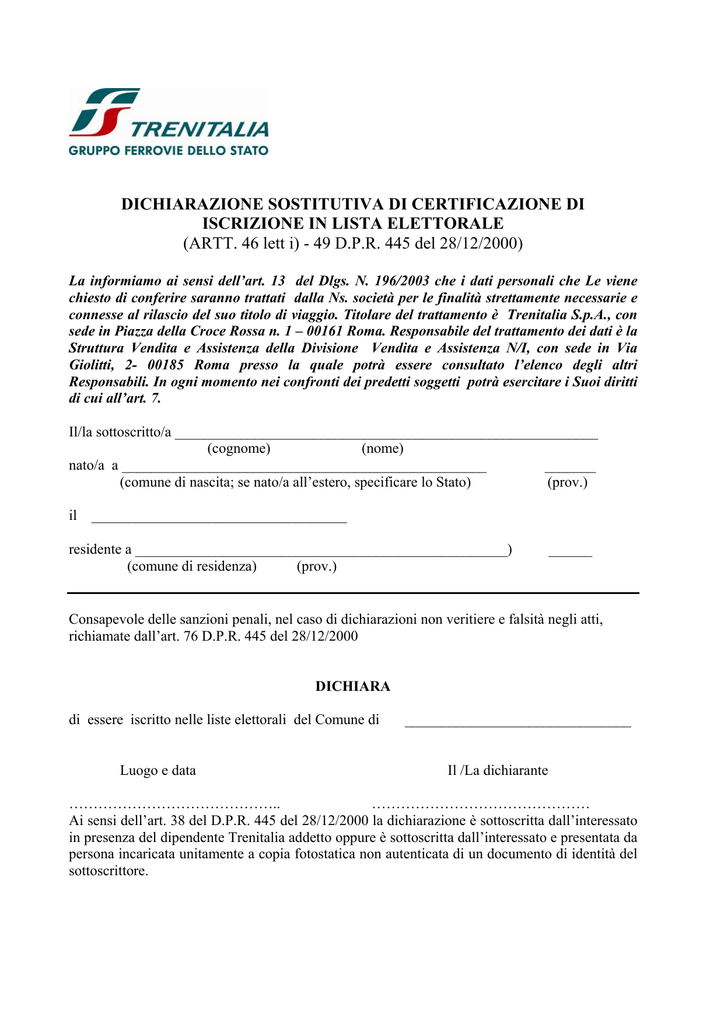 DICHIARAZIONE SOSTITUTIVA DI CERTIFICAZIONE DI ISCRIZIONE IN LISTA ELETTORALE (ARTT. 46 lett i) - 49 D.P.R. 445 del 28/12/2000) La informiamo ai sensi dell’art. 13 del Dlgs. N. 196/2003 che i dati personali che Le viene chiesto di conferire saranno trattati dalla Ns. società per le finalità strettamente necessarie e connesse al rilascio del suo titolo di viaggio. Titolare del trattamento è Trenitalia S.p.A., con sede in Piazza della Croce Rossa n. 1 – 00161 Roma. Responsabile del trattamento dei dati è la Struttura Vendita e Assistenza della Divisione Vendita e Assistenza N/I, con sede in Via Giolitti, 2- 00185 Roma presso la quale potrà essere consultato l’elenco degli altri Responsabili. In ogni momento nei confronti dei predetti soggetti potrà esercitare i Suoi diritti di cui all’art. 7. Il/la sottoscritto/a __________________________________________________________ (cognome) (nome) nato/a a __________________________________________________ _______ (comune di nascita; se nato/a all’estero, specificare lo Stato) (prov.) il ___________________________________ residente a ___________________________________________________) (comune di residenza) (prov.) ______ Consapevole delle sanzioni penali, nel caso di dichiarazioni non veritiere e falsità negli atti, richiamate dall’art. 76 D.P.R. 445 del 28/12/2000 DICHIARA di essere iscritto nelle liste elettorali del Comune di Luogo e data _______________________________ Il /La dichiarante …………………………………….. ……………………………………… Ai sensi dell’art. 38 del D.P.R. 445 del 28/12/2000 la dichiarazione è sottoscritta dall’interessato in presenza del dipendente Trenitalia addetto oppure è sottoscritta dall’interessato e presentata da persona incaricata unitamente a copia fotostatica non autenticata di un documento di identità del sottoscrittore.