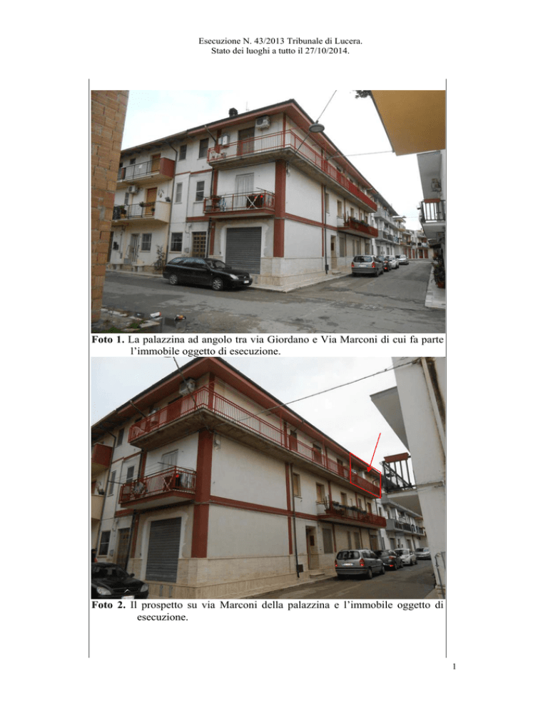 Esecuzione N. 43/2013 Tribunale di Lucera. Stato dei luoghi a tutto il 27/10/2014. Foto 1. La palazzina ad angolo tra via Giordano e Via Marconi di cui fa parte l’immobile oggetto di esecuzione. Foto 2. Il prospetto su via Marconi della palazzina e l’immobile oggetto di esecuzione. 1 Esecuzione N. 43/2013 Tribunale di Lucera. Stato dei luoghi a tutto il 27/10/2014. Foto 3. L’ingresso comune alla palazzina plurifamiliare. 2 Esecuzione N. 43/2013 Tribunale di Lucera. Stato dei luoghi a tutto il 27/10/2014. Foto 4. Il vano scala comune e l’impianto di autoclave. Foto 5. Particolare del parapetto e della scala comune. 3 Esecuzione N. 43/2013 Tribunale di Lucera. Stato dei luoghi a tutto il 27/10/2014. Foto 6. Particolare della porta di accesso all’appartamento. 4 Esecuzione N. 43/2013 Tribunale di Lucera. Stato dei luoghi a tutto il 27/10/2014. Foto 7. La caldaia ed il balcone prospiciente via Marconi. 5 Esecuzione N. 43/2013 Tribunale di Lucera. Stato dei luoghi a tutto il 27/10/2014. Foto 8. La parete del soggiorno il cortile interno. Foto 9. La parete della cucina prospiciente via Marconi. 6 Esecuzione N. 43/2013 Tribunale di Lucera. Stato dei luoghi a tutto il 27/10/2014. Foto 10. La parete della camera da letto prospiciente il cortile interno. 7 Esecuzione N. 43/2013 Tribunale di Lucera. Stato dei luoghi a tutto il 27/10/2014. Foto 11. Il bagno. 8 Esecuzione N. 43/2013 Tribunale di Lucera. Stato dei luoghi a tutto il 27/10/2014. Foto 12. La parete della cameretta prospiciente il cortile interno. Foto 13. Pavimento, porte e pareti ricorrenti. 9
