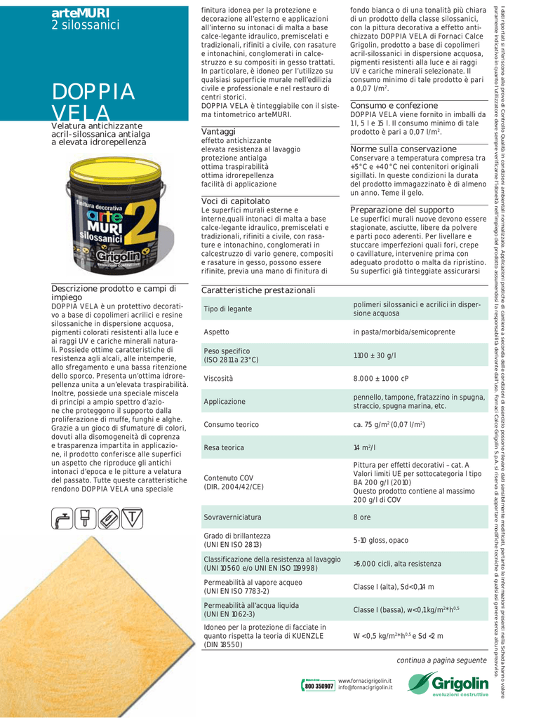 DOPPIA VELA Velatura antichizzante acril-silossanica antialga a elevata idrorepellenza finitura idonea per la protezione e decorazione all’esterno e applicazioni all’interno su intonaci di malta a base calce-legante idraulico, premiscelati e tradizionali, rifiniti a civile, con rasature e intonachini, conglomerati in calcestruzzo e su compositi in gesso trattati. In particolare, è idoneo per l’utilizzo su qualsiasi superficie murale nell’edilizia civile e professionale e nel restauro di centri storici. DOPPIA VELA è tinteggiabile con il sistema tintometrico arteMURI. Vantaggi effetto antichizzante elevata resistenza al lavaggio protezione antialga ottima traspirabilità ottima idrorepellenza facilità di applicazione DOPPIA VELA viene fornito in imballi da 1 l, 5 l e 15 l. Il consumo minimo di tale prodotto è pari a 0,07 l/m2. Conservare a temperatura compresa tra +5°C e +40°C nei contenitori originali sigillati. In queste condizioni la durata del prodotto immagazzinato è di almeno un anno. Teme il gelo. Preparazione del supporto Le superfici murali esterne e interne,quali intonaci di malta a base calce-legante idraulico, premiscelati e tradizionali, rifiniti a civile, con rasature e intonachino, conglomerati in calcestruzzo di vario genere, compositi e rasature in gesso, possono essere rifinite, previa una mano di finitura di DOPPIA VELA è un protettivo decorativo a base di copolimeri acrilici e resine silossaniche in dispersione acquosa, pigmenti colorati resistenti alla luce e ai raggi UV e cariche minerali naturali. Possiede ottime caratteristiche di resistenza agli alcali, alle intemperie, allo sfregamento e una bassa ritenzione dello sporco. Presenta un’ottima idrorepellenza unita a un’elevata traspirabilità. Inoltre, possiede una speciale miscela di principi a ampio spettro d’azione che proteggono il supporto dalla proliferazione di muffe, funghi e alghe. Grazie a un gioco di sfumature di colori, dovuti alla disomogeneità di coprenza e trasparenza impartita in applicazione, il prodotto conferisce alle superfici un aspetto che riproduce gli antichi intonaci d’epoca e le pitture a velatura del passato. Tutte queste caratteristiche rendono DOPPIA VELA una speciale Consumo e confezione Norme sulla conservazione Voci di capitolato Descrizione prodotto e campi di impiego fondo bianca o di una tonalità più chiara di un prodotto della classe silossanici, con la pittura decorativa a effetto antichizzato DOPPIA VELA di Fornaci Calce Grigolin, prodotto a base di copolimeri acril-silossanici in dispersione acquosa, pigmenti resistenti alla luce e ai raggi UV e cariche minerali selezionate. Il consumo minimo di tale prodotto è pari a 0,07 l/m2. Le superfici murali nuove devono essere stagionate, asciutte, libere da polvere e parti poco aderenti. Per livellare e stuccare imperfezioni quali fori, crepe o cavillature, intervenire prima con adeguato prodotto o malta da ripristino. Su superfici già tinteggiate assicurarsi Caratteristiche prestazionali Tipo di legante polimeri silossanici e acrilici in dispersione acquosa Aspetto in pasta/morbida/semicoprente Peso specifico (ISO 2811 a 23°C) 1.100 ± 30 g/l Viscosità 8.000 ± 1.000 cP Applicazione pennello, tampone, fratazzino in spugna, straccio, spugna marina, etc. Consumo teorico ca. 75 g/m2 (0,07 l/m2) Resa teorica 14 m2/l Contenuto COV (DIR. 2004/42/CE) Pittura per effetti decorativi – cat. A Valori limiti UE per sottocategoria l tipo BA 200 g/l (2010) Questo prodotto contiene al massimo 200 g/l di COV Sovraverniciatura 8 ore Grado di brillantezza (UNI EN ISO 2813) 5-10 gloss, opaco Classificazione della resistenza al lavaggio (UNI 10560 e/o UNI EN ISO 119998) >5.000 cicli, alta resistenza Permeabilità al vapore acqueo (UNI EN ISO 7783-2) Classe I (alta), Sd< 0,14 m Permeabilità all’acqua liquida (UNI EN 1062-3) Classe I (bassa), w< 0,1 kg/m2*h0,5 Idoneo per la protezione di facciate in quanto rispetta la teoria di KUENZLE (DIN 18550) W < 0,5 kg/m2*h0,5 e Sd <2 m continua a pagina seguente www.fornacigrigolin.it [email protected] I dati riportati si riferiscono alle prove di Controllo Qualità in condizioni ambientali normalizzate. Applicazioni pratiche di cantiere a seconda delle condizioni di esercizio possono rilevare dati sensibilmente modificati, pertanto le informazioni presenti nella Scheda hanno valore puramente indicativo in quanto l’utilizzatore deve sempre verificarne l’idoneità nell’impiego del prodotto assumendosi la responsabilità derivante dall’uso. Fornaci Calce Grigolin S.p.A. si riserva di apportare modifiche tecniche di qualsiasi genere senza alcun preavviso. arteMURI 2 silossanici Applicare con pennellessa, spugna, tampone, etc. uno strato avendo cura di distribuire il prodotto sul supporto con una lavorazione costante e poi sfumarlo con l’attrezzatura più idonea a seconda dell’effetto voluto. DOPPIA VELA delle condizioni del film e rimuovere totalmente le pitture degradate, a elevato spessore e non totalmente aderenti. Ripulire eventuali muffe o alghe presenti con il detergente SEI KO e igienizzare poi la superficie con il risanante SEI OK. Le possibili imperfezioni ancora presenti vanno, stuccate e livellate. Successivamente, eseguire la preparazione del fondo in funzione delle condizioni del supporto utilizzando i prodotti specifici della classe silossanici, quali PRIMER 2W o F2 COPRENTE. Sulla superficie da decorare, applicare la finitura riempitiva acril-silossanica XIL2 FILL bianca o in un colore comunque più chiaro di quello finale, come fondo di preparazione alla velatura, opportunamente diluito con circa il 15% in volume d’acqua per applicazione a rullo e 25-30% per applicazione a pennello. Se la superficie è già tinteggiata con colore scuro, difficile da ricoprire, o il supporto è irregolare e non uniforme, si consiglia di effettuare un pretrattamento con il fondo strutturale acril-silossanico BIS sempre opportunamente diluito. Preparazione del prodotto Dilu