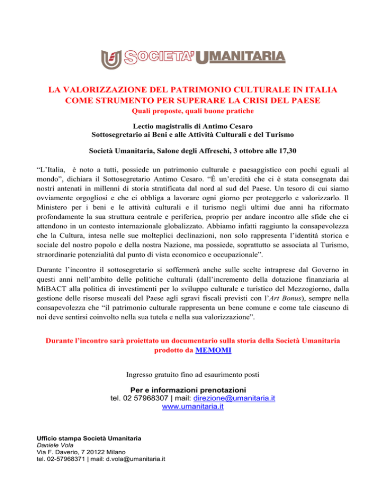 3 OTTOBRE - ore 17.30 LA VALORIZZAZIONE DEL PATRIMONIO CULTURALE IN ITALIA COME STRUMENTO PER SUPERARE LA CRISI DEL PAESE Quali proposte, quali buone pratiche Lectio magistralis di Antimo Cesaro Sottosegretario ai Beni e alle Attività Culturali e del Turismo Società Umanitaria, Salone degli Affreschi, 3 ottobre alle 17,30 “L’Italia, è noto a tutti, possiede un patrimonio culturale e paesaggistico con pochi eguali al mondo”, dichiara il Sottosegretario Antimo Cesaro. “È un’eredità che ci è stata consegnata dai nostri antenati in millenni di storia stratificata dal nord al sud del Paese. Un tesoro di cui siamo ovviamente orgogliosi e che ci obbliga a lavorare ogni giorno per proteggerlo e valorizzarlo. Il Ministero per i beni e le attività culturali e il turismo negli ultimi due anni ha riformato profondamente la sua struttura centrale e periferica, proprio per andare incontro alle sfide che ci attendono in un contesto internazionale globalizzato. Abbiamo infatti raggiunto la consapevolezza che la Cultura, intesa nelle sue molteplici declinazioni, non solo rappresenta l’identità storica e sociale del nostro popolo e della nostra Nazione, ma possiede, soprattutto se associata al Turismo, straordinarie potenzialità dal punto di vista economico e occupazionale”. Durante l’incontro il sottosegretario si soffermerà anche sulle scelte intraprese dal Governo in questi anni nell’ambito delle politiche culturali (dall’incremento della dotazione finanziaria al MiBACT alla politica di investimenti per lo sviluppo culturale e turistico del Mezzogiorno, dalla gestione delle risorse museali del Paese agli sgravi fiscali previsti con l’Art Bonus), sempre nella consapevolezza che “il patrimonio culturale rappresenta un bene comune e come tale ciascuno di noi deve sentirsi coinvolto nella sua tutela e nella sua valorizzazione”. Durante l’incontro sarà proiettato un documentario sulla storia della Società Umanitaria prodotto da MEMOMI Ingresso gratuito fino ad esaurimento posti Per e informazioni prenotazioni tel. 02 57968307 | mail: [email protected] www.umanitaria.it Ufficio stampa Società Umanitaria Daniele Vola Via F. Daverio, 7 20122 Milano tel. 02-57968371 | mail: [email protected]