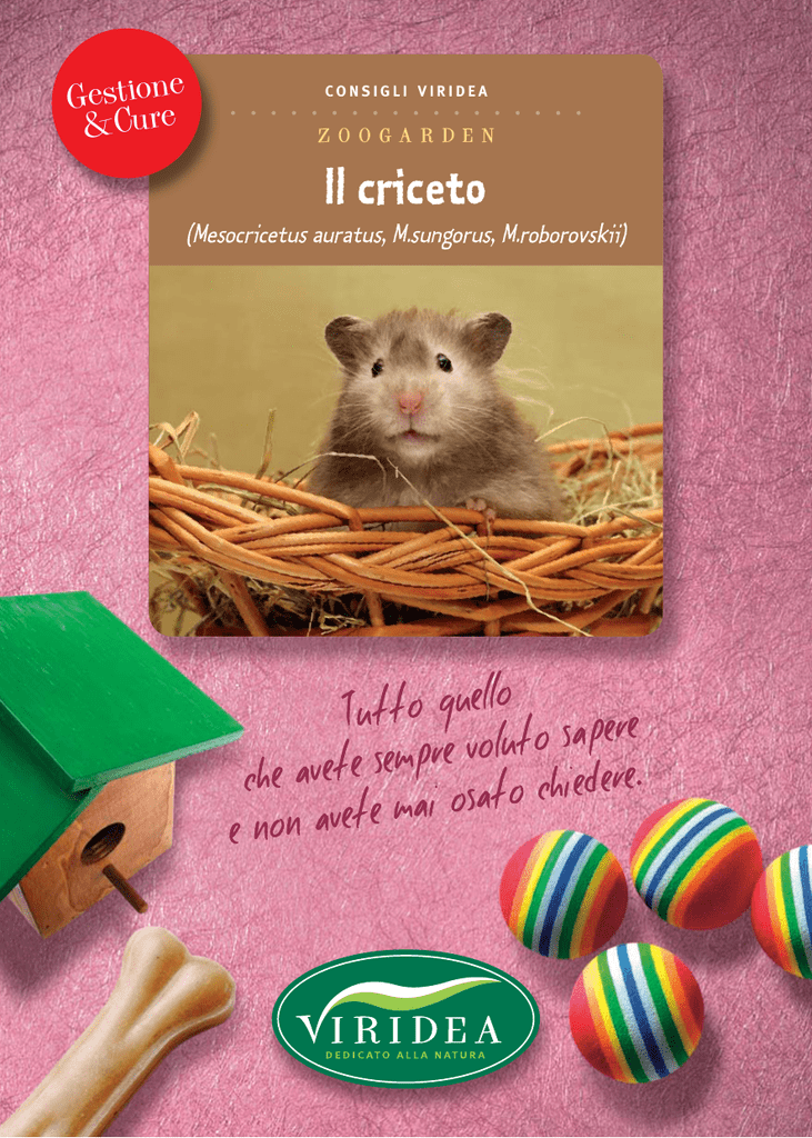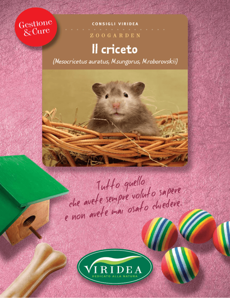 Gestionee &Cur CONSIGLI VIRIDEA . . . . . . . . . . . . . . . . . . Il criceto (Mesocricetus auratus, M.sungorus, M.roborovskii) CONSIGLI VIRIDEA Esistono varie specie di criceto, animaletto da compagnia di poche esigenze, adatto a tutti senza richiedere grossi impegni, che sin dall’infanzia noi tutti abbiamo imparato a conoscere dalle vetrine dei negozi di animali. Il criceto dorato è il più grosso e, fra tutti, se non abituato da piccolo ad essere maneggiato, quello dal carattere più scontroso, per cui il meno adatto per le dita dei bimbi più piccoli. Molto docili sono sempre i cricetini nani russo e roborovskii, anche se, essendo piccini, si baderà a che i bambini non li stringano Il trasporto fino a casa ed i primi giorni troppo nelle loro manine. Tra i criceti russi grigi striati vi è una bella varietà bianco-ghiaccio striata di grigio ed anche una colorazione miele, detta isabella. Hanno la simpatica caratteristica di possedere due sacche nelle guance dove vanno ad immagazzinare i semi. Vivono in media 3 anni. Al momento dell’acquisto dobbiamo considerare che sia il maschio che la femmina del criceto dorato vanno tenuti da soli e quindi saremo solo noi i compagni di gioco dei nostri cricetini; invece i criceti russi femmine possono convivere fra loro e, se si vuole farli riprodurre, con un maschio per gabbia. Acquisteremo, come sapranno consigliarci gli addetti del reparto, una gabbia in plastica piena, escludendo quelle a sbarre metalliche, fra le quali il nostro amico potrebbe incastrarsi le zampine e procurarsi delle fratture. Disponiamo nella gabbia una ruotina e strutture a tubi e bolle in polivinile. La lettiera ideale è in tutolo di mais che riesce perfettamente ad assorbire le deiezioni ed a eliminare del tutto i pur modesti odori organici. Doniamo al cricetino una casetta in cui rifugiarsi per dormire e, specialmente nei primi giorni dopo l’acquisto, preferiamo la sera per socializzare con lui visto che al crepuscolo questo animaletto è più attivo: ridurremo così il suo stress e sarà più facilmente ben disposto a farsi prendere in mano. Le principali cure La maturità sessuale dei criceti si ha nel maschio a 6-8 settimane, nella femmina a 4. La gestazione dura 15-18 giorni, 21 per i criceti nani. Nascono da 4 a 12 cuccioli che aprono gli occhi a 12-14 giorni e possono essere allontanati dalla madre a 21 giorni. Attenzione al fatto che già a 3 mesi di età il maschio giovane può già accoppiarsi con la madre, pertanto è bene separare i figli maschi dopo il primo mese di età. Forniremo al cricetino un beverino per l’acqua. Nell’introdurre in gabbia materiale per fare il nido, faremo attenzione che non sia sfilacciabile in quanto i fili potrebbero avvolgersi intorno alle dita impedendo la circolazione sanguigna. Controlliamo che le feci siano secche e formate, l’ano non imbrattato, gli occhietti neri brillanti e tra palpebre bene aperte. Nel caso convivessero fra loro più soggetti, controlliamo che non si mordano ferendosi a vicenda, ed in tal caso provvediamo a dividerli. L’alimentazione Sia il dorato che i nani si nutrono con semi di girasole, grano, orzo e semi per criceti o per pappagallini come miglio e panico. E’ bene integrare l’alimentazione con pellettati vitaminizzati addizionati in sali minerali. Possiamo mettere a disposizione vegetali freschi molto pigmentati purché ben lavati, asciugati e non freddi di frigorifero. Anche la frutta è molto gradita. Avremo cura di somministrare piccole quantità assortite, e rinnovate di frequente, perché il criceto mangia in continuazione ma non riesce ad ingerire grosse quantità, col rischio CONSIGLI VIRIDEA di riempire la gabbia di alimenti freschi che facilmente ammuffiranno. Quando è stagione, si può dare mezzo mandarino non sbucciato. Il criceto lo mangerà lasciando la coppetta di scorza ed avrà in questo modo un’ottima integrazione di vitamina C. Non daremo mai latte, formaggi e latticini, e mai il cioccolato. Norme sanitarie generali Gli inconvenienti maggiori sono i morsi e le fratture. In tarda età potrebbero comparire masse tumorali che il veterinario saprà valutare consigliandovi la terapia eventualmente più opportuna. Il criceto non trasmette alcuna malattia all’uomo, è un animaletto inodore e scrupolosamente pulito, che non ha bisogno di vaccinazioni. Dr. Marco Gentile Medico Veterinario Albo 1622 Torino