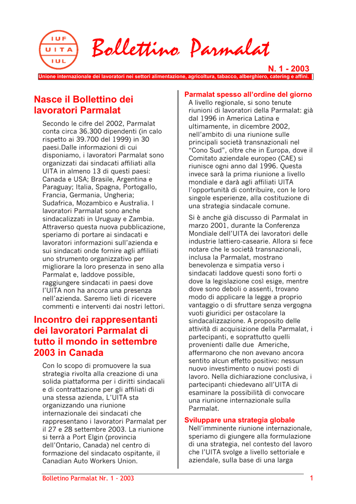 Bollettino Parmalat N. 1 - 2003 Unione internazionale dei lavoratori nei settori alimentazione, agricoltura, tabacco, alberghiero, catering e affini. Nasce il Bollettino dei lavoratori Parmalat Secondo le cifre del 2002, Parmalat conta circa 36.300 dipendenti (in calo rispetto ai 39.700 del 1999) in 30 paesi.Dalle informazioni di cui disponiamo, i lavoratori Parmalat sono organizzati dai sindacati affiliati alla UITA in almeno 13 di questi paesi: Canada e USA; Brasile, Argentina e Paraguay; Italia, Spagna, Portogallo, Francia, Germania, Ungheria; Sudafrica, Mozambico e Australia. I lavoratori Parmalat sono anche sindacalizzati in Uruguay e Zambia. Attraverso questa nuova pubblicazione, speriamo di portare ai sindacati e lavoratori informazioni sull’azienda e sui sindacati onde fornire agli affiliati uno strumento organizzativo per migliorare la loro presenza in seno alla Parmalat e, laddove possible, raggiungere sindacati in paesi dove l’UITA non ha ancora una presenza nell’azienda. Saremo lieti di ricevere commenti e interventi dai nostri lettori. Incontro dei rappresentanti dei lavoratori Parmalat di tutto il mondo in settembre 2003 in Canada Con lo scopo di promuovere la sua strategia rivolta alla creazione di una solida piattaforma per i diritti sindacali e di contrattazione per gli affiliati di una stessa azienda, L’UITA sta organizzando una riunione internazionale dei sindacati che rappresentano i Iavoratori Parmalat per il 27 e 28 settembre 2003. La riunione si terrà a Port Elgin (provincia dell’Ontario, Canada) nel centro di formazione del sindacato ospitante, il Canadian Auto Workers Union. Bolletino Parmalat Nr. 1 - 2003 Parmalat spesso all’ordine del giorno A livello regionale, si sono tenute riunioni di lavoratori della Parmalat: già dal 1996 in America Latina e ultimamente, in dicembre 2002, nell’ambito di una riunione sulle principali società transnazionali nel “Cono Sud”, oltre che in Europa, dove il Comitato aziendale europeo (CAE) si riunisce ogni anno dal 1996. Questa invece sarà la prima riunione a livello mondiale e darà agli affiliati UITA l’opportunità di contribuire, con le loro singole esperienze, alla costituzione di una strategia sindacale comune. Si è anche già discusso di Parmalat in marzo 2001, durante la Conferenza Mondiale dell’UITA dei lavoratori delle industrie lattiero-casearie. Allora si fece notare che le società transnazionali, inclusa la Parmalat, mostrano benevolenza e simpatia verso i sindacati laddove questi sono forti o dove la legislazione così esige, mentre dove sono deboli o assenti, trovano modo di applicare la legge a proprio vantaggio o di sfruttare senza vergogna vuoti giuridici per ostacolare la sindacalizzazione. A proposito delle attività di acquisizione della Parmalat, i partecipanti, e soprattutto quelli provenienti dalle due Americhe, affermarono che non avevano ancora sentito alcun effetto positivo: nessun nuovo investimento o nuovi posti di lavoro. Nella dichiarazione conclusiva, i partecipanti chiedevano all’UITA di esaminare la possibilità di convocare una riunione internazionale sulla Parmalat. Sviluppare una strategia globale Nell’imminente riunione internazionale, speriamo di giungere alla formulazione di una strategia, nel contesto del lavoro che l’UITA svolge a livello settoriale e aziendale, sulla base di una larga 1 intesa relativa ai problemi ed alle priorità nel gruppo Parmalat. Gli affiliati avranno così l’occasione di esporre i problemi specifici dei loro membri e d’identificare un denominatore comune per le azioni future. Saranno esaminati e concordati anche gli obiettivi di una strategia Parmalat comune, oltre che discutere gli sviluppi e gli eventuali seguiti. L’UITA e Parmalat: le origini Le organizzazioni regionali dell’UITA in America Latina ed in Europa cominciarono ad avere rapporti con Parmalat nella metà degli anni ’90, mentre i rapporti dell’UITA con la direzione del gruppo furono avviati nel 1999, a seguito di una serie di vertenze in America Latina ed in Sudafrica, che provocarono azioni da parte dell’UITA e del sindacato di coordinamento Parmalat FAT-CISL (oggi FAI-CISL). Nel suo paese d’origine, Parmalat pretende di essere un’azienda socialmente responsabile e va fiera di avere buoni rapporti con i sindacati. Purtroppo, la sua politica di rapporti sindacali proattivi in Italia ed in Europa non l’ha sempre accompagnata nella sua espansione verso i mercati oltreoceano. Man mano che l’azienda s’impiantava in paesi con tradizioni e normative in materia sindacale estremamente diverse, l’UITA ed i suoi affiliati italiani hanno dovuto ricordare alla Parmalat l’impegno proclamato di mantenere buoni rapporti con i sindacati. Dopo interventi in una vertenza sindacale in Paraguay nel 1998, l’UITA ha continuato ad esercitare pressione sull’azienda nel 1999 a proposito di situazioni in Nicaragua e nella Repubblica dominicana e di una contrattazione collettiva particolarmente difficile in Sudafrica. Un incontro informale tra l’UITA e la direzione Parmalat avvenne in dicembre 1999, per esplorare la possibilità di creare un rapporto durevole, partendo dall’idea che è meglio affrontare problemi conflittuali prima che si trasformino in lotte sindacali di grandi dimensioni con azioni a livello internazionale. 2 Nel frattempo, i sindacati negli USA riferivano di difficoltà nell’ottenere riconoscimento e nel negoziare contratti collettivi con Parmalat. In Canada, l’azienda stava stravolgendo le politiche di rapporti sindacali positivi esistenti nelle aziende che aveva acquisito. Una seconda riunione si svolse in dicembre 2000, quando l’UITA introdusse il principio di un accordo globale in materia di diritti sindacali. L’interesse degli azionisti contro i diritti dei lavoratori Per spiegare la discrepanza tra il preteso impegno dell’azienda a mantenere buoni rapporti sindacali in Europa e il suo recente comportamento in America del nor