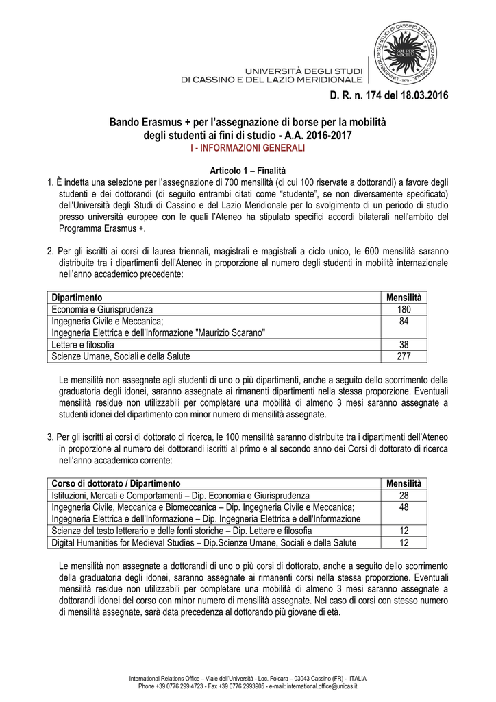 D. R. n. 174 del 18.03.2016 Bando Erasmus + per l’assegnazione di borse per la mobilità degli studenti ai fini di studio - A.A. 2016-2017 I - INFORMAZIONI GENERALI Articolo 1 – Finalità 1. È indetta una selezione per l’assegnazione di 700 mensilità (di cui 100 riservate a dottorandi) a favore degli studenti e dei dottorandi (di seguito entrambi citati come “studente”, se non diversamente specificato) dell'Università degli Studi di Cassino e del Lazio Meridionale per lo svolgimento di un periodo di studio presso università europee con le quali l’Ateneo ha stipulato specifici accordi bilaterali nell'ambito del Programma Erasmus +. 2. Per gli iscritti ai corsi di laurea triennali, magistrali e magistrali a ciclo unico, le 600 mensilità saranno distribuite tra i dipartimenti dell’Ateneo in proporzione al numero degli studenti in mobilità internazionale nell’anno accademico precedente: Dipartimento Economia e Giurisprudenza Ingegneria Civile e Meccanica; Ingegneria Elettrica e dell'Informazione "Maurizio Scarano" Lettere e filosofia Scienze Umane, Sociali e della Salute Mensilità 180 84 38 277 Le mensilità non assegnate agli studenti di uno o più dipartimenti, anche a seguito dello scorrimento della graduatoria degli idonei, saranno assegnate ai rimanenti dipartimenti nella stessa proporzione. Eventuali mensilità residue non utilizzabili per completare una mobilità di almeno 3 mesi saranno assegnate a studenti idonei del dipartimento con minor numero di mensilità assegnate. 3. Per gli iscritti ai corsi di dottorato di ricerca, le 100 mensilità saranno distribuite tra i dipartimenti dell’Ateneo in proporzione al numero dei dottorandi iscritti al primo e al secondo anno dei Corsi di dottorato di ricerca nell’anno accademico corrente: Corso di dottorato / Dipartimento Istituzioni, Mercati e Comportamenti – Dip. Economia e Giurisprudenza Ingegneria Civile, Meccanica e Biomeccanica – Dip. Ingegneria Civile e Meccanica; Ingegneria Elettrica e dell'Informazione – Dip. Ingegneria Elettrica e dell'Informazione Scienze del testo letterario e delle fonti storiche – Dip. Lettere e filosofia Digital Humanities for Medieval Studies – Dip.Scienze Umane, Sociali e della Salute Mensilità 28 48 12 12 Le mensilità non assegnate a dottorandi di uno o più corsi di dottorato, anche a seguito dello scorrimento della graduatoria degli idonei, saranno assegnate ai rimanenti corsi nella stessa proporzione. Eventuali mensilità residue non utilizzabili per completare una mobilità di almeno 3 mesi saranno assegnate a dottorandi idonei del corso con minor numero di mensilità assegnate. Nel caso di corsi con stesso numero di mensilità assegnate, sarà data precedenza al dottorando più giovane di età. International Relations Office – Viale dell’Università - Loc. Folcara – 03043 Cassino (FR) - ITALIA Phone +39 0776 299 4723 - Fax +39 0776 2993905 - e-mail: [email protected] 4.Lo status di Studente Erasmus comporta i seguenti benefici: - la garanzia del riconoscimento del periodo di studio trascorso presso l’università ospitante tramite il trasferimento dei crediti; - la copertura assicurativa per eventuali infortuni presso l’università ospitante; - la fruizione di tutti i servizi offerti ai propri studenti da parte dell’università ospitante. Articolo 2 - Paesi Eleggibili È possibile trascorrere un periodo di studio in una università appartenente ai seguenti Paesi: - i 27 Stati membri dell'Unione europea: Austria, Belgio, Bulgaria, Cipro, Croazia, Danimarca, Estonia, Finlandia, Francia, Germania, Grecia, Irlanda, Lettonia, Lituania, Lussemburgo, Malta, Paesi Bassi, Polonia, Portogallo, Regno Unito, Repubblica Ceca, Romania, Slovacchia, Slovenia, Spagna, Svezia e Ungheria; - i 5 Paesi aderenti al Programma extra Unione Europea: Ex Repubblica iugoslava di Macedonia, Islanda, Liechtenstein, Norvegia e Turchia. Articolo 3 - Contributo finanziario 1. Lo studente, ai fini della mobilità internazionale, può ricevere un contributo finanziario oppure beneficiare solamente dello status Erasmus (idoneo senza borsa). In entrambi i casi ha la possibilità di seguire corsi e di usufruire delle strutture disponibili presso l’Istituto ospitante senza pagare ulteriori tasse di iscrizione. 2. Il contributo finanziario viene erogato per sostenere parzialmente le spese legate al soggiorno all’estero e non è dunque inteso a coprire tutte le spese sostenute dallo studente in mobilità. 3. Il contributo finanziario è costituito da più parti: - contributo dell'Unione Europea (UE): si tratta di un importo mensile (o quota parte) calcolato in base al paese di destinazione dello studente in mobilità e ai mesi (o loro quota parte) di effettiva permanenza all'estero. In particolare, i finanziamenti sono distinti in base al costo della vita dei paesi di destinazione raggruppati così come indicato nella tabella che segue; - contributo dell’Università degli Studi di Cassino e del Lazio Meridionale (Unicas) e del Ministero dell’Istruzione, dell’Università e della Ricerca (MIUR): rapportato al periodo di effettiva permanenza all’estero (mesi/giorni), è pari a 280,00 euro al mese per ogni mensilità prevista dall’offerta ed effettivamente fruita. Questo importo verrà corrisposto a conclusione della mobilità e successivamente alla compilazione del Rapporto Narrativo da parte dello studente a partire da Gennaio 2017; - eventuale contributo aggiuntivo dell'Unione Europea per gli studenti con condizioni socio-economiche svantaggiate erogato secondo le indicazioni fornite dal MIUR. Fatto salvo l’eventuale contributo aggiuntivo per studenti con condizioni socio-economiche svantaggiate, l’ammontare mensile dei contributi per i diversi paesi è pari a: Paesi Contributo UE Austria, Danimarca, Finlandia, Francia, Irlanda, €280/mese Lichtenstein, Norvegia, Svezia, Regno Unito Belgio, Croazia, Repubblica ceca, Cipro, Germania, €230/mese Grecia, Islanda, Lussemburgo, O