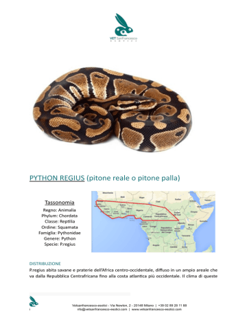 ! ! PYTHON REGIUS (pitone reale o pitone palla) Tassonomia Regno: Animalia Phylum: Chordata Classe: RepNlia Ordine: Squamata Famiglia: Pythonidae Genere: Python Specie: P.regius DISTRIBUZIONE P.regius abita savane e praterie dell’Africa centro-occidentale, diffuso in un ampio areale che va dalla Repubblica Centrafricana fino alla costa atlanNca più occidentale. Il clima di queste ! i Vetsanfrancesco-esotici - Via Newton, 2 - 20148 Milano | +39 02 89 28 11 88 [email protected] | www.vetsanfrancesco-esotici.com ! zone è generalmente di Npo tropicale semi-arido, caraWerizzato da alte temperature e ore di luce pressoché costanN durante tuWo l’anno e con precipitazioni concentrate in determinaN periodi. DOCUMENTAZIONE P.regius compare nella seconda appendice della convenzione sul commercio internazionale di fauna e flora selvaNche a rischio esNnzione, deWa anche C.I.T.E.S., pertanto il suo commercio e la sua detenzione devono essere accompagnaN da opportuna documentazione. Eventuali nascite andranno denunciate presso gli uffici del corpo forestale dello stato, il quale rilascerà un documento anche per i nuovi naN. CARATTERISTICHE FISICHE P.regius è un serpente costriWore, quindi non velenoso. Ha una corporatura tozza con la testa ben disNnta dal corpo, una coda piuWosto corta ed una lunghezza media di 120/130 cenNmetri. Possiede occhi tondi con una pupilla verNcale adaWa alla visione noWurna ed è privo di palpebre mobili e di un orecchio esterno, mentre è provvisto di speroni peri-cloacali, ! i Vetsanfrancesco-esotici - Via Newton, 2 - 20148 Milano | +39 02 89 28 11 88 [email protected] | www.vetsanfrancesco-esotici.com ! struWure che tesNmoniano la passata presenza di arN inferiori. La livrea ancestrale prevede un colore di fondo marrone con strisce conNnue di paWern nero che percorrono longitudinalmente il dorso e trasversalmente i fianchi, mentre il ventre è bianco ma leggermente sporcato di nero sui bordi. La testa è scura in alto e chiara ai laN, con una caraWerisNca striatura che parte dalla base del capo e passando per l’occhio giunge fino alla narice. P.regius ha abitudini esclusivamente noWurne e terricole, trascorrendo la giornata in tane e cunicoli soWerranei scavaN da altri animali. Si nutre prevalentemente di piccoli roditori e per cacciare fa affidamento sopraWuWo sull’olfaWo e sulla percezione del calore resa possibile dalle fosseWe termosensibili presenN sopra la rima buccale. E’ un serpente mansueto e Nmoroso che se impaurito tende spesso ad appalloWolarsi nascondendo la testa tra le spire, comportamento che ha dato origine al soprannome di pitone palla. Esistono numerose mutazioni geneNche di P.regius, selezionate nei molN anni di riproduzione in cacvità, così che si trovano ormai in commercio esemplari con colori e paWern molto diversi da quelli presenN in natura. In cacvità P.regius raggiunge mediamente 20 anni di vita ma può spingersi oltre. DIMORFISMO SESSUALE Non esistono evidenN differenze morfologiche tra maschi e femmine, anche se quest’ulNme tendono ad essere più lunghe e spesse. Il sessaggio è possibile mediante due modalità: 1. esami specifici che essendo leggermente invasivi devono essere effeWuaN da una mano esperta o da un veterinario specializzato: la spremitura cloacale (popping) e l’inserimento di sonde nella cloaca (probing) o, molto meno invasivo e altreWanto sensibile, il sessaggio mediante ecografia. HABITAT CASALINGO: TERRARIO Vale la regola generale per la quale la somma di lunghezza e profondità del terrario deve essere uguale o maggiore del serpente che andrà ad ospitare, partendo quindi da una base minima di 80x40cm fino generalmente ad una massima di 100x50cm. A causa della natura schiva di questo serpente, alcuni esemplari potrebbero tuWavia preferire terrari di dimensioni più contenute o basse vasche di plasNca opaca, sentendosi maggiormente a proprio agio in un ambiente più chiuso e ristreWo. E’ consigliato l’allevamento di un unico esemplare per teca. TEMPERATURA Come per ogni animale a sangue freddo è importante ricreare nel terrario un gradiente ! i Vetsanfrancesco-esotici - Via Newton, 2 - 20148 Milano | +39 02 89 28 11 88 [email protected] | www.vetsanfrancesco-esotici.com ! termico in modo che P.regius possa termoregolarsi. Si uNlizza quindi una piastra o un caveWo riscaldante di adeguato waWaggio che copra un terzo o massimo un mezzo della base del terrario e che sia termostatato in modo da mantenere costantemente 31°C nella zona calda. UMIDITA’ P.regius gradisce una percentuale di umidità compresa tra il 50% ed il 60%, valori di solito congrui alla normale umidità ambientale delle nostre laNtudini o facilmente raggiungibili nebulizzando occasionalmente. Nei giorni di muta può rivelarsi uNle innalzare leggermente questo parametro nebulizzando più frequentemente così da facilitare il cambio di pelle. ILLUMINAZIONE P.regius non necessita di parNcolari fonN di illuminazione e anzi talvolta un’illuminazione troppo intensa lo può infasNdire. E’ comunque importante permeWere a P.regius di disNnguere il giorno dalla noWe ponendo il terrario in una stanza adeguatamente luminosa o uNlizzando fonN luminose non troppo intense. SUBSTRATO La scelta del substrato dipende dal faWo che si voglia privilegiare igiene, praNcità o esteNca. La soluzione più praNca ed igienica è rappresentata da fogli di giornale ma in alternaNva si può uNlizzare aspen, un parNcolare truciolato depolverato e debaWerizzato che si trova comunemente nei negozi specializzaN. Volendo optare per una soluzione più naturale si può invece uNlizzare torba o fibra di cocco ma in questo caso le accortezze sanitarie dovranno essere maggiori. ARREDAMENTO Gli oggec essenziali sono una tana nella zona calda ed una ciotola d’acqua nella zona fredda. La tana non dovrebbe essere troppo ampia perché P.regius gradisce percepire le pareN di questa a direWo contaWo col proprio corpo, mentre la ciotola d’acqua dovrebbe essere abbastanza g