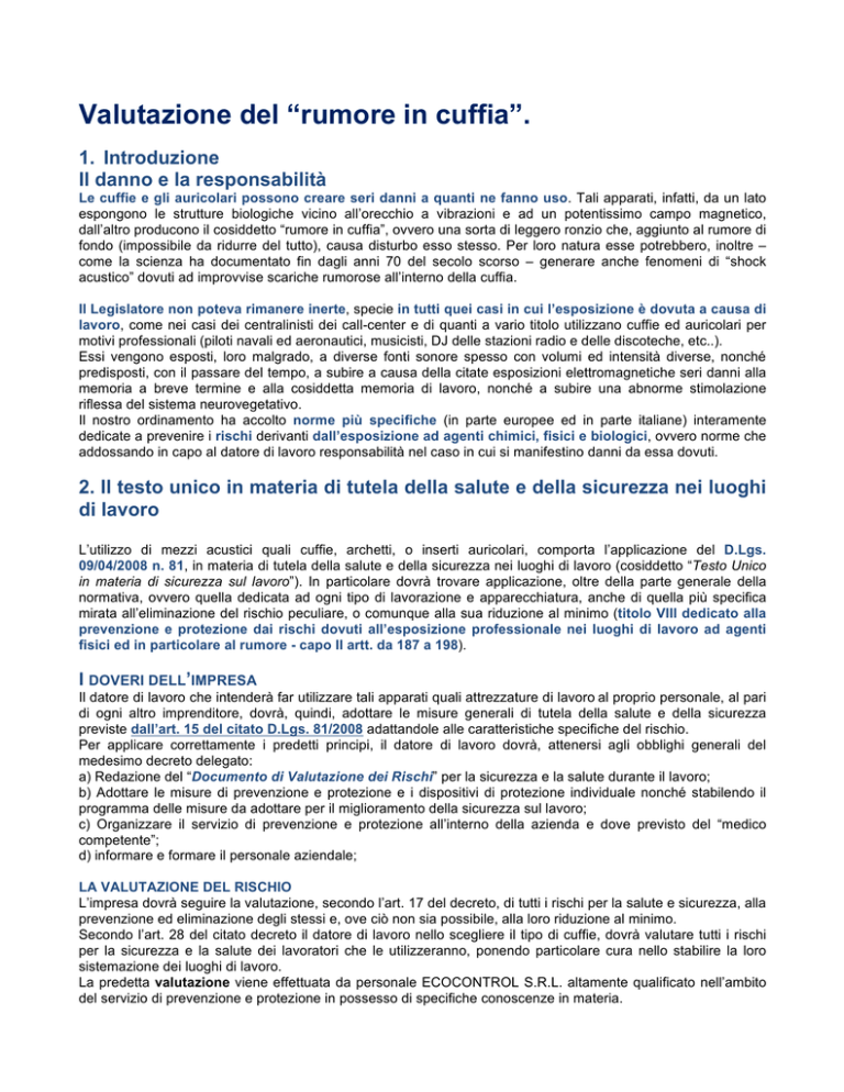 Valutazione del “rumore in cuffia”. 1. Introduzione Il danno e la responsabilità Le cuffie e gli auricolari possono creare seri danni a quanti ne fanno uso. Tali apparati, infatti, da un lato espongono le strutture biologiche vicino all’orecchio a vibrazioni e ad un potentissimo campo magnetico, dall’altro producono il cosiddetto “rumore in cuffia”, ovvero una sorta di leggero ronzio che, aggiunto al rumore di fondo (impossibile da ridurre del tutto), causa disturbo esso stesso. Per loro natura esse potrebbero, inoltre – come la scienza ha documentato fin dagli anni 70 del secolo scorso – generare anche fenomeni di “shock acustico” dovuti ad improvvise scariche rumorose all’interno della cuffia. Il Legislatore non poteva rimanere inerte, specie in tutti quei casi in cui l’esposizione è dovuta a causa di lavoro, come nei casi dei centralinisti dei call-center e di quanti a vario titolo utilizzano cuffie ed auricolari per motivi professionali (piloti navali ed aeronautici, musicisti, DJ delle stazioni radio e delle discoteche, etc..). Essi vengono esposti, loro malgrado, a diverse fonti sonore spesso con volumi ed intensità diverse, nonché predisposti, con il passare del tempo, a subire a causa della citate esposizioni elettromagnetiche seri danni alla memoria a breve termine e alla cosiddetta memoria di lavoro, nonché a subire una abnorme stimolazione riflessa del sistema neurovegetativo. Il nostro ordinamento ha accolto norme più specifiche (in parte europee ed in parte italiane) interamente dedicate a prevenire i rischi derivanti dall’esposizione ad agenti chimici, fisici e biologici, ovvero norme che addossando in capo al datore di lavoro responsabilità nel caso in cui si manifestino danni da essa dovuti. 2. Il testo unico in materia di tutela della salute e della sicurezza nei luoghi di lavoro L’utilizzo di mezzi acustici quali cuffie, archetti, o inserti auricolari, comporta l’applicazione del D.Lgs. 09/04/2008 n. 81, in materia di tutela della salute e della sicurezza nei luoghi di lavoro (cosiddetto “Testo Unico in materia di sicurezza sul lavoro”). In particolare dovrà trovare applicazione, oltre della parte generale della normativa, ovvero quella dedicata ad ogni tipo di lavorazione e apparecchiatura, anche di quella più specifica mirata all’eliminazione del rischio peculiare, o comunque alla sua riduzione al minimo (titolo VIII dedicato alla prevenzione e protezione dai rischi dovuti all’esposizione professionale nei luoghi di lavoro ad agenti fisici ed in particolare al rumore - capo II artt. da 187 a 198). I DOVERI DELL’IMPRESA Il datore di lavoro che intenderà far utilizzare tali apparati quali attrezzature di lavoro al proprio personale, al pari di ogni altro imprenditore, dovrà, quindi, adottare le misure generali di tutela della salute e della sicurezza previste dall’art. 15 del citato D.Lgs. 81/2008 adattandole alle caratteristiche specifiche del rischio. Per applicare correttamente i predetti principi, il datore di lavoro dovrà, attenersi agli obblighi generali del medesimo decreto delegato: a) Redazione del “Documento di Valutazione dei Rischi” per la sicurezza e la salute durante il lavoro; b) Adottare le misure di prevenzione e protezione e i dispositivi di protezione individuale nonché stabilendo il programma delle misure da adottare per il miglioramento della sicurezza sul lavoro; c) Organizzare il servizio di prevenzione e protezione all’interno della azienda e dove previsto del “medico competente”; d) informare e formare il personale aziendale; LA VALUTAZIONE DEL RISCHIO L’impresa dovrà seguire la valutazione, secondo l’art. 17 del decreto, di tutti i rischi per la salute e sicurezza, alla prevenzione ed eliminazione degli stessi e, ove ciò non sia possibile, alla loro riduzione al minimo. Secondo l’art. 28 del citato decreto il datore di lavoro nello scegliere il tipo di cuffie, dovrà valutare tutti i rischi per la sicurezza e la salute dei lavoratori che le utilizzeranno, ponendo particolare cura nello stabilire la loro sistemazione dei luoghi di lavoro. La predetta valutazione viene effettuata da personale ECOCONTROL S.R.L. altamente qualificato nell’ambito del servizio di prevenzione e protezione in possesso di specifiche conoscenze in materia. Essa viene aggiornata ogni qual volta si verifichino mutamenti che potrebbero renderla obsoleta, ovvero, quando i risultati della sorveglianza sanitaria rendano necessaria la sua revisione. I dati ottenuti dalla valutazione, misurazione e calcolo dei livelli di esposizione costituiranno parte integrante del documento di valutazione del rischio. Nel caso specifico la valutazione del rischio da parte dell’ECOCONTROL S.R.L. viene effettuata, secondo le metodologie della Norma UNI EN ISO 11904-2 (metodo del manichino). FOTO “DOLLY” MANICHINO UTILIZZATO PER LA VALUTAZIONE DEL RUMORE IN CUFFIA. Un’ ulteriore utile riferimento potrebbe essere dato, inoltre, anche dalle norme emanate in tal senso dall’Occupational Safety Health Administration (OSHA), agenzia governativa statunitense rivolta alla prevenzione degli infortuni e dei danni sul lavoro. Tali disposizioni, definite OSHA 29 CFR 1910.95, Occupational Noise Exposure, sono obbligatorie per il mercato degli USA e vengono utilizzate dai produttori internazionali di apparati fono-riceventi come standard anche per gli altri mercati internazionali. L’ADOZIONE DELLE MISURE La valutazione del rischio permetterà, così, all’impresa di identificare e di adottare le opportune misure di prevenzione e protezione con particolare riferimento alle norme di buona tecnica ed alle buone prassi. L’impresa predisporrà, poi, secondo gli artt. 192, 194 e 195, tutti i mezzi per eliminare alla fonte i valutati rischi oppure, ove ciò non sia possibile, ridurli al minimo, informando e formando il personale in relazione ai rischi provenienti dall’esposizione al rumore. Le misure da adottare sono indicate