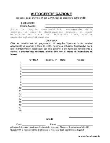 AUTOCERTIFICAZIONE (ai sensi degli art.46 e 47 del D.P.R. Del 28 dicembre 2000 n°445) Il sottoscritto: Codice fiscale: Sotto la propria responsabilità, consapevole delle sanzioni in caso di dichiarazione mendace, ai sensi dellart.76 del D.P.R. Del 28/12/2000 n°445, con la presente autocertificazione DICHIARA Che le attestazioni di pagamento di seguito riportate sono relative all'acquisto di occhiali e lenti da vista, nonché a soluzioni fisiologiche per il loro mantenimento, necessari per uso proprio e dei familiari fiscalmente a carico; il sottoscritto dichiara altresì che non si tratta di montature di lusso. OTTICA Scontr. N° Data Prezzo 1 2 3 4 5 6 7 8 9 10 11 12 13 14 15 16 17 18 In fede Data Firma Allegare fotocopie degli scontrini e delle ricevute. Allegare documento d'identità Questo CRP si riserva il diritto di eliminare le fotocopie degli scontrini non leggibili www.fiscalteam.it