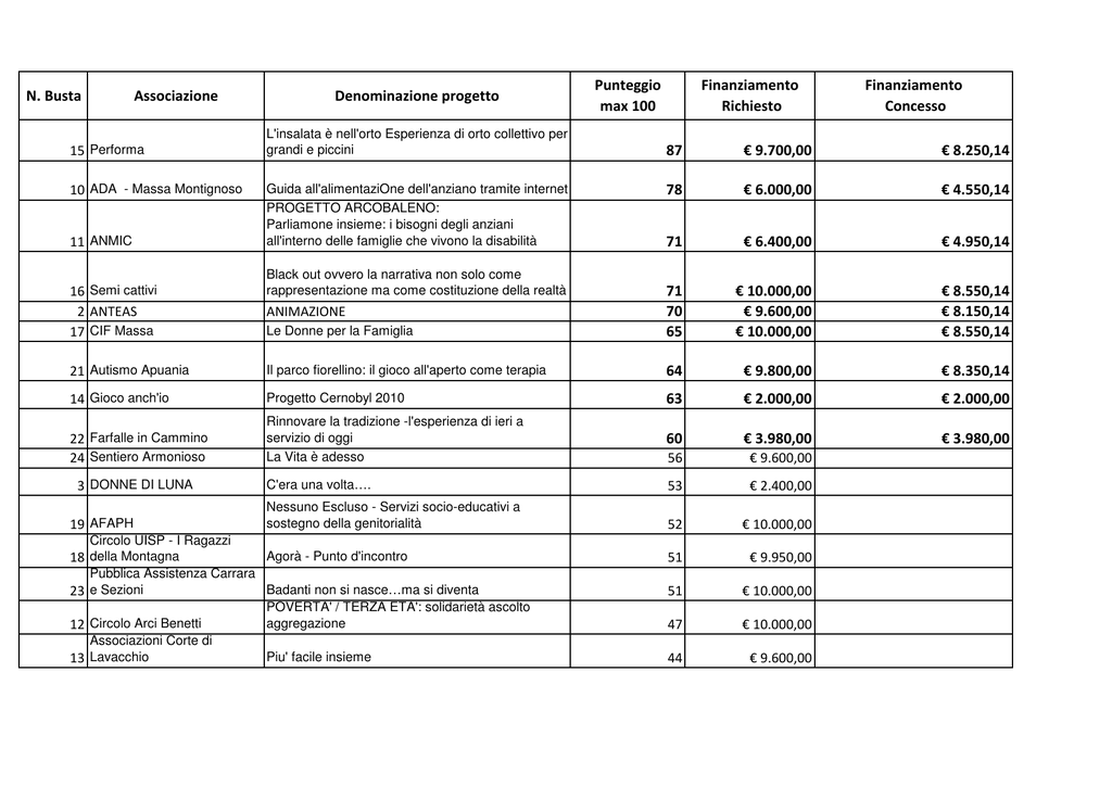 N. Busta Associazione 15 Performa 10 ADA - Massa Montignoso Denominazione progetto L'insalata è nell'orto Esperienza di orto collettivo per grandi e piccini 11 ANMIC Guida all'alimentaziOne dell'anziano tramite internet PROGETTO ARCOBALENO: Parliamone insieme: i bisogni degli anziani all'interno delle famiglie che vivono la disabilità 16 Semi cattivi Black out ovvero la narrativa non solo come rappresentazione ma come costituzione della realtà Punteggio max 100 Finanziamento Richiesto Finanziamento Concesso 87 € 9.700,00 € 8.250,14 78 € 6.000,00 € 4.550,14 71 € 6.400,00 € 4.950,14 € 10.000,00 € 9.600,00 € 10.000,00 € 8.550,14 € 8.150,14 € 8.550,14 2 ANTEAS 17 CIF Massa Le Donne per la Famiglia 71 70 65 21 Autismo Apuania Il parco fiorellino: il gioco all'aperto come terapia 64 € 9.800,00 € 8.350,14 14 Gioco anch'io Progetto Cernobyl 2010 63 € 2.000,00 € 2.000,00 22 Farfalle in Cammino 24 Sentiero Armonioso Rinnovare la tradizione -l'esperienza di ieri a servizio di oggi La Vita è adesso 60 € 3.980,00 € 3.980,00 56 € 9.600,00 C'era una volta…. 53 € 2.400,00 52 € 10.000,00 51 € 9.950,00 51 € 10.000,00 47 € 10.000,00 44 € 9.600,00 3 DONNE DI LUNA ANIMAZIONE Nessuno Escluso - Servizi socio-educativi a AFAPH sostegno della genitorialità 19 Circolo UISP - I Ragazzi Agorà - Punto d'incontro 18 della Montagna Pubblica Assistenza Carrara Badanti non si nasce…ma si diventa 23 e Sezioni POVERTA' / TERZA ETA': solidarietà ascolto aggregazione Circolo Arci Benetti 12 Associazioni Corte di Piu' facile insieme 13 Lavacchio N. Busta Associazione Società Volontari del Soccorso - Croce Verde 20 Fossola Denominazione progetto Punteggio max 100 Finanziamento Richiesto Finanziamento Concesso Assaporando: viaggio tra il cibo il corpo e la mente 36 € 10.000,00 4 ARCI TORRANO FACCIAMO DA NOI - ANZIANI ALLA RISCOSSA 34 € 10.000,00 Società Volontari del Soccorso - Croce Verde 8 Fossola Centro Sociale e Sanitario per anziani 20 € 10.000,00 6 PROMIDEA Gli anziani incontrano la tecnologia - Corso di computer gratuito per anziani e svantaggiati Senza descrizione progetto - Redazione incompleta mod.C 1 CARES E-STATE CON NOI Senza busta 5 FASIM 7 UISP SOLIDARIETA' 9 Fratres Mulazzo CARTA DEI SERVIZI PER CITTADINI IMMIGRATI Generazioni alla deriva Senza copertura finanziaria ex art. 5 (inferiore al 20%) Senza copertura finanziaria ex art. 5 (inferiore al 20%) Senza dicitura sulla busta Premiazione nazionale donatori benemeriti